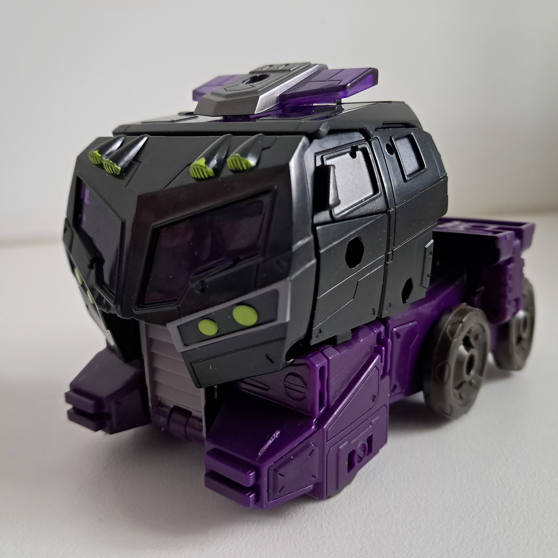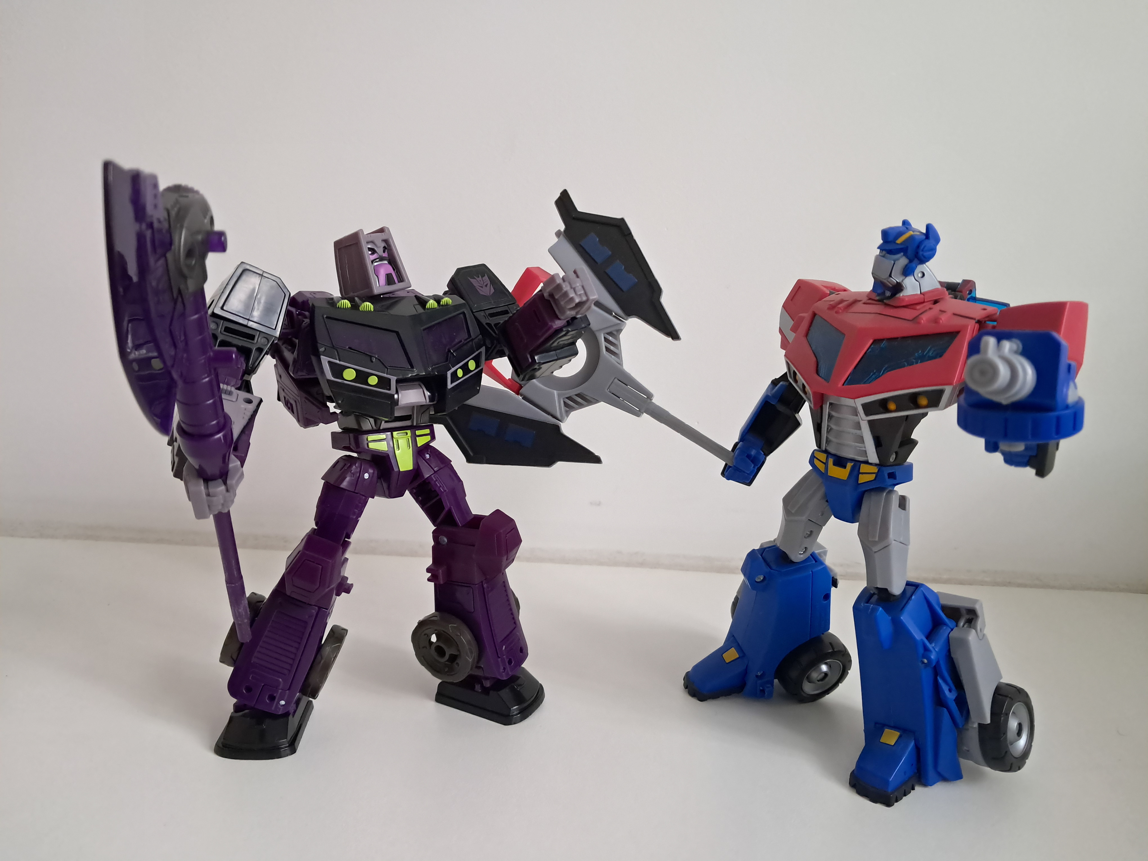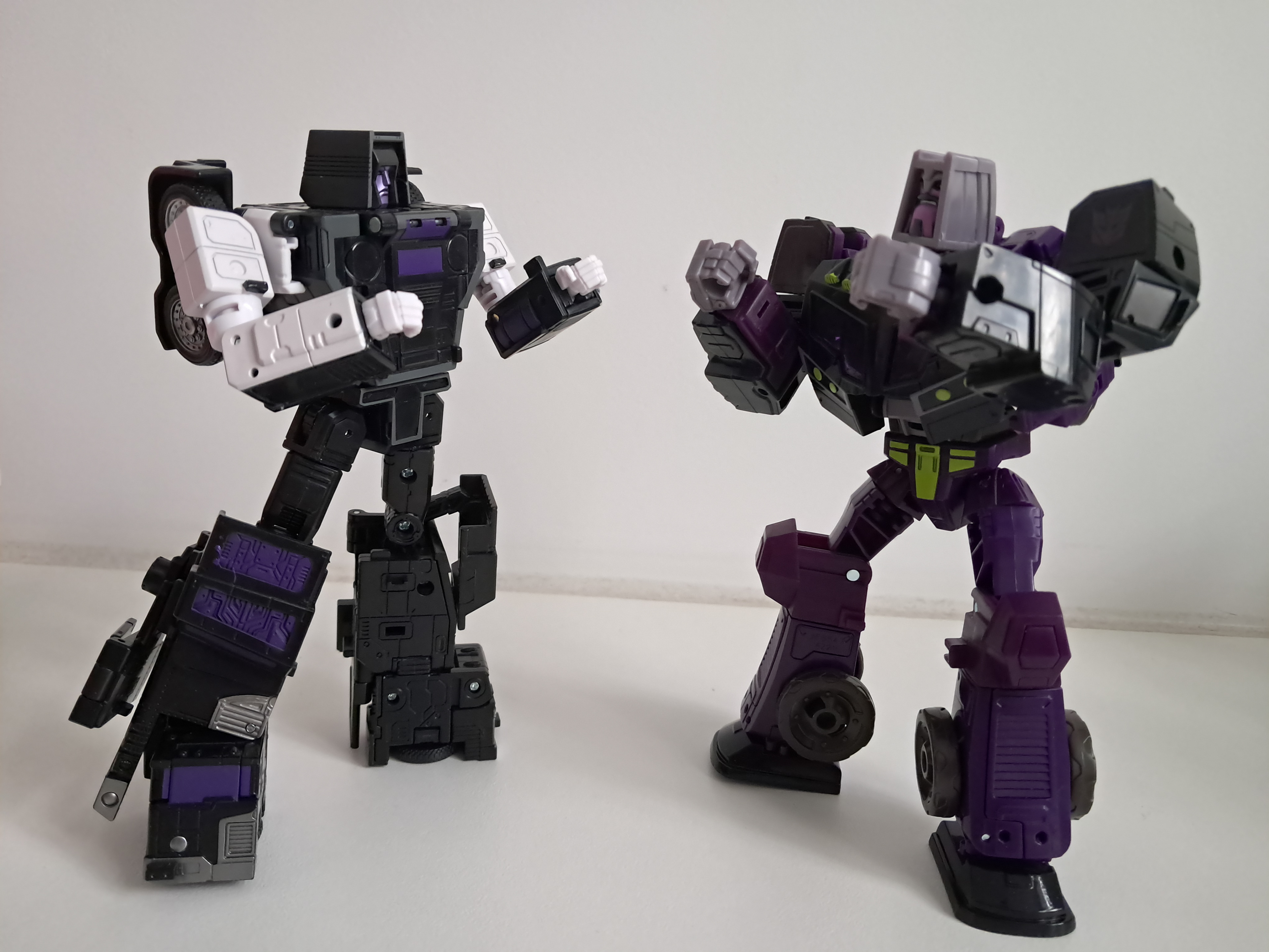 Ik heb de Legacy Animated Optimus overgeslagen omdat ik toch nog de hele goede animated versie had, maar ik was wel gelijk heel erg geïnteresseerd in deze Motormaster. Het paars, het zwart, de felgroene accenten en dat heerlijke vierkante koppie, ik vind het schitterend werken en heel veel karakter hebben. Plus ik heb altijd graag een mold die ik nog niet heb. En nu ik beiden figuren met elkaar vergelijk, valt het helemaal niet tegen. Deze Motormaster is bijna net zo groot als de originele toy, en voelt qua kwaliteit eigenlijk gelijk.