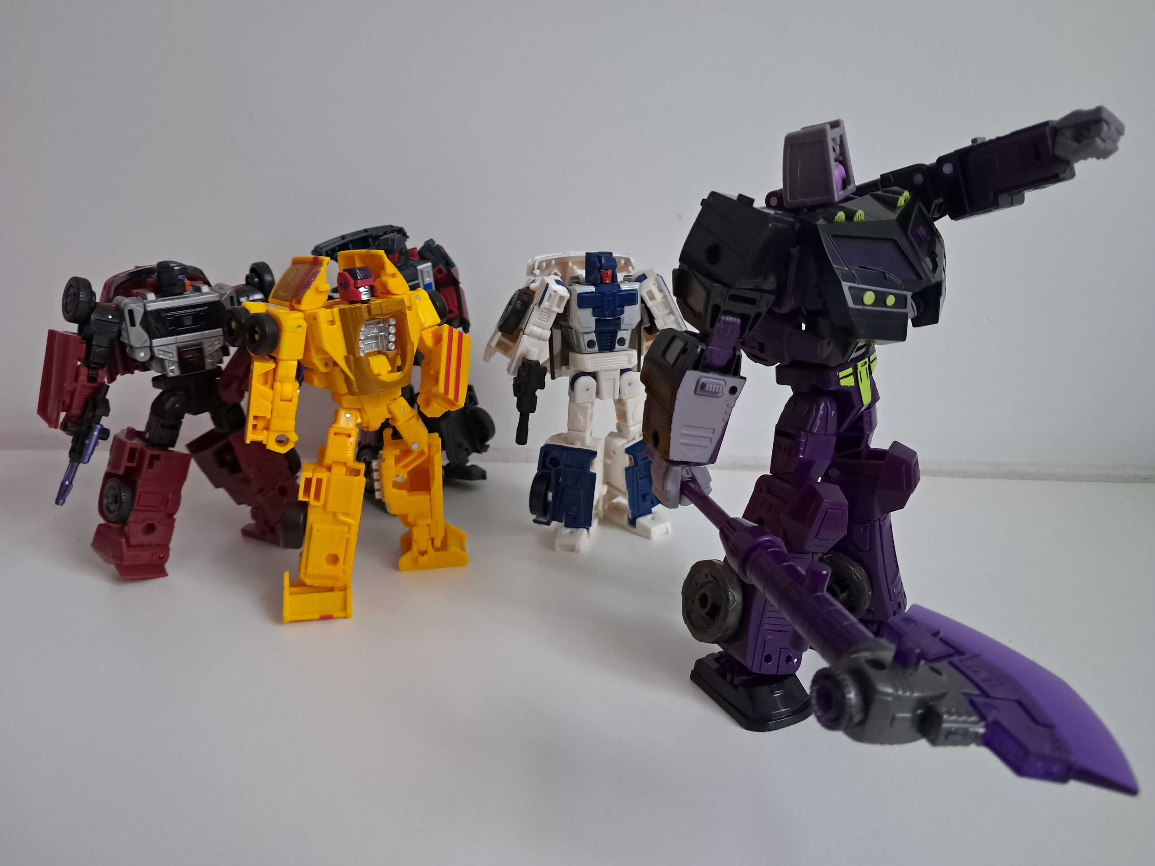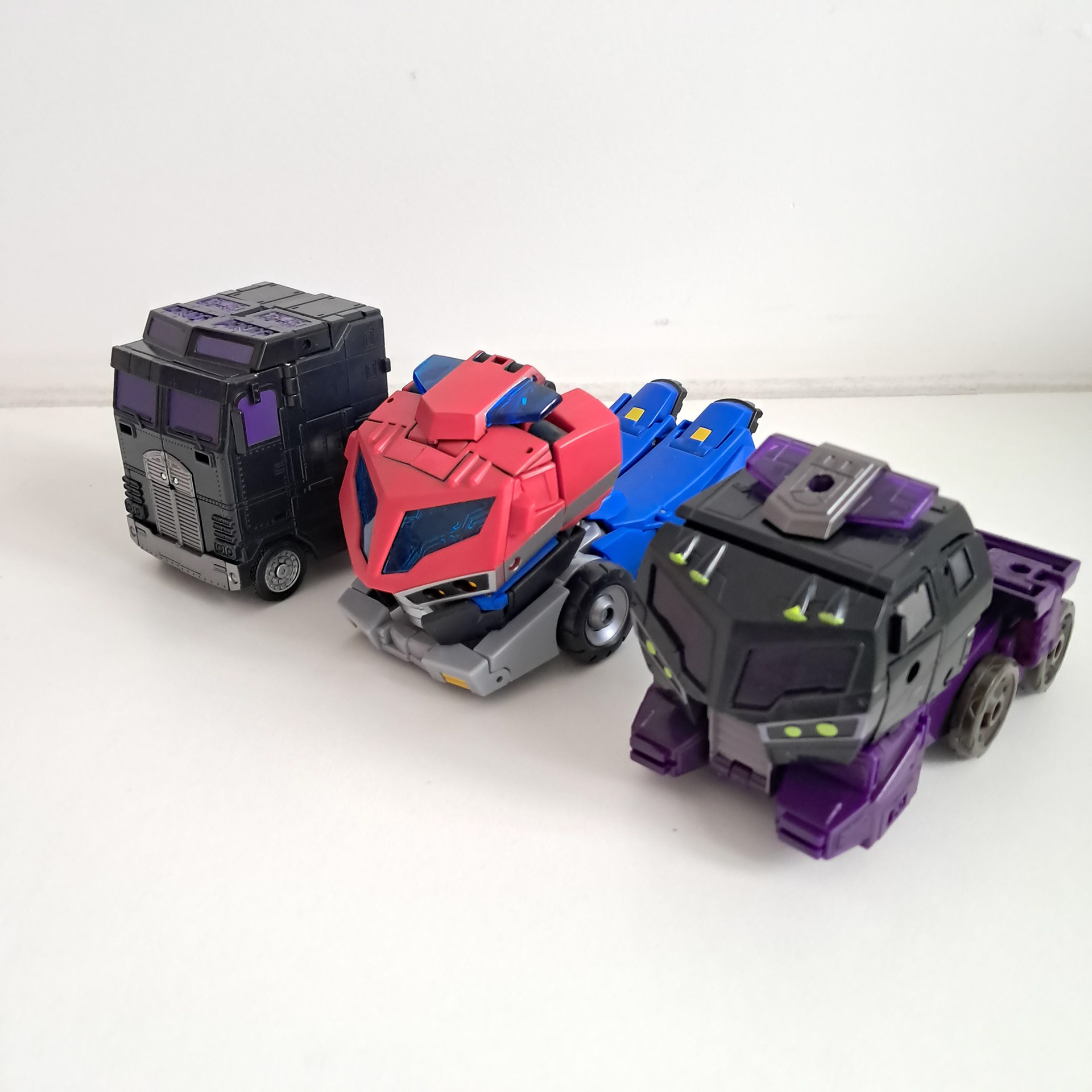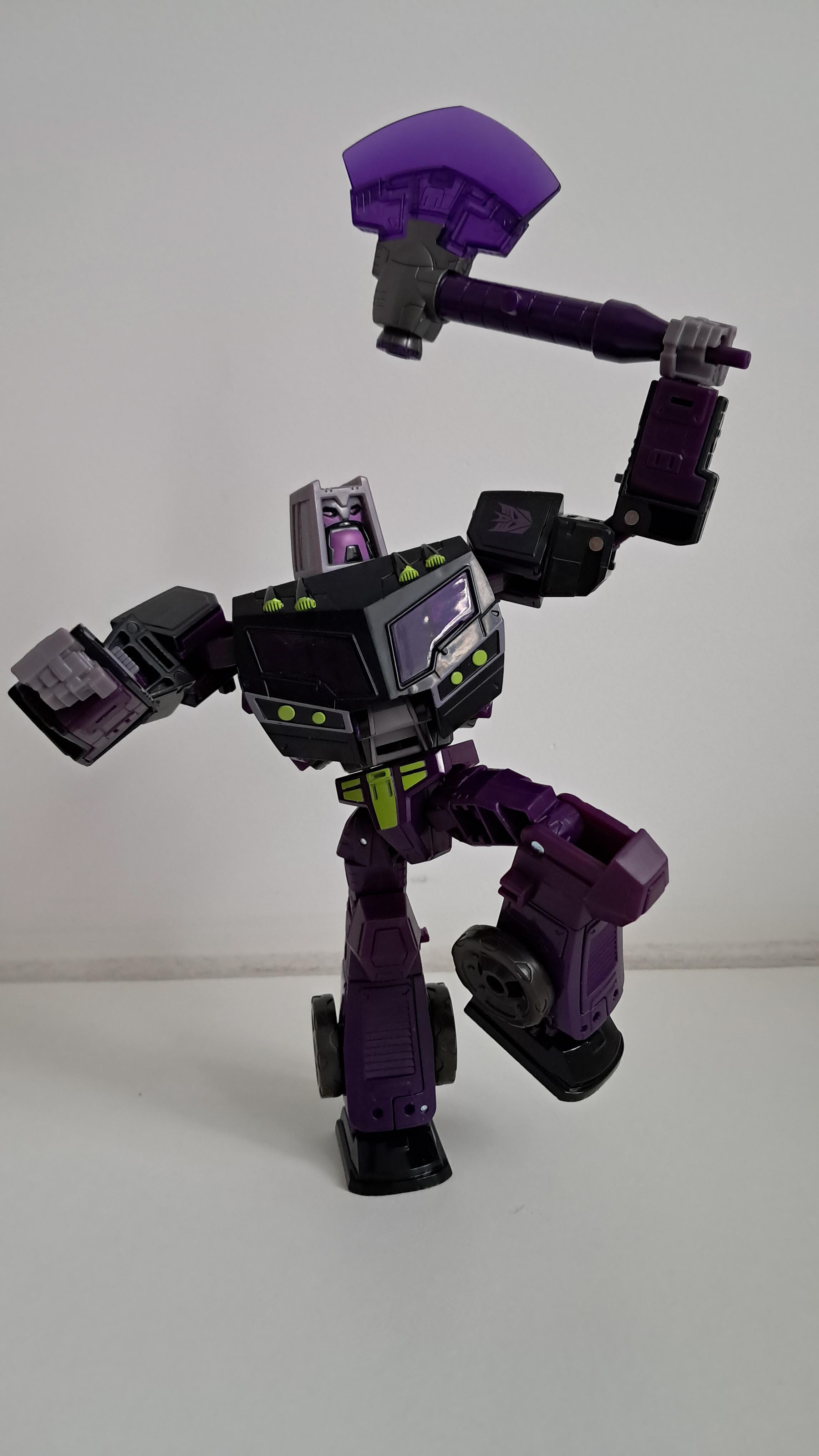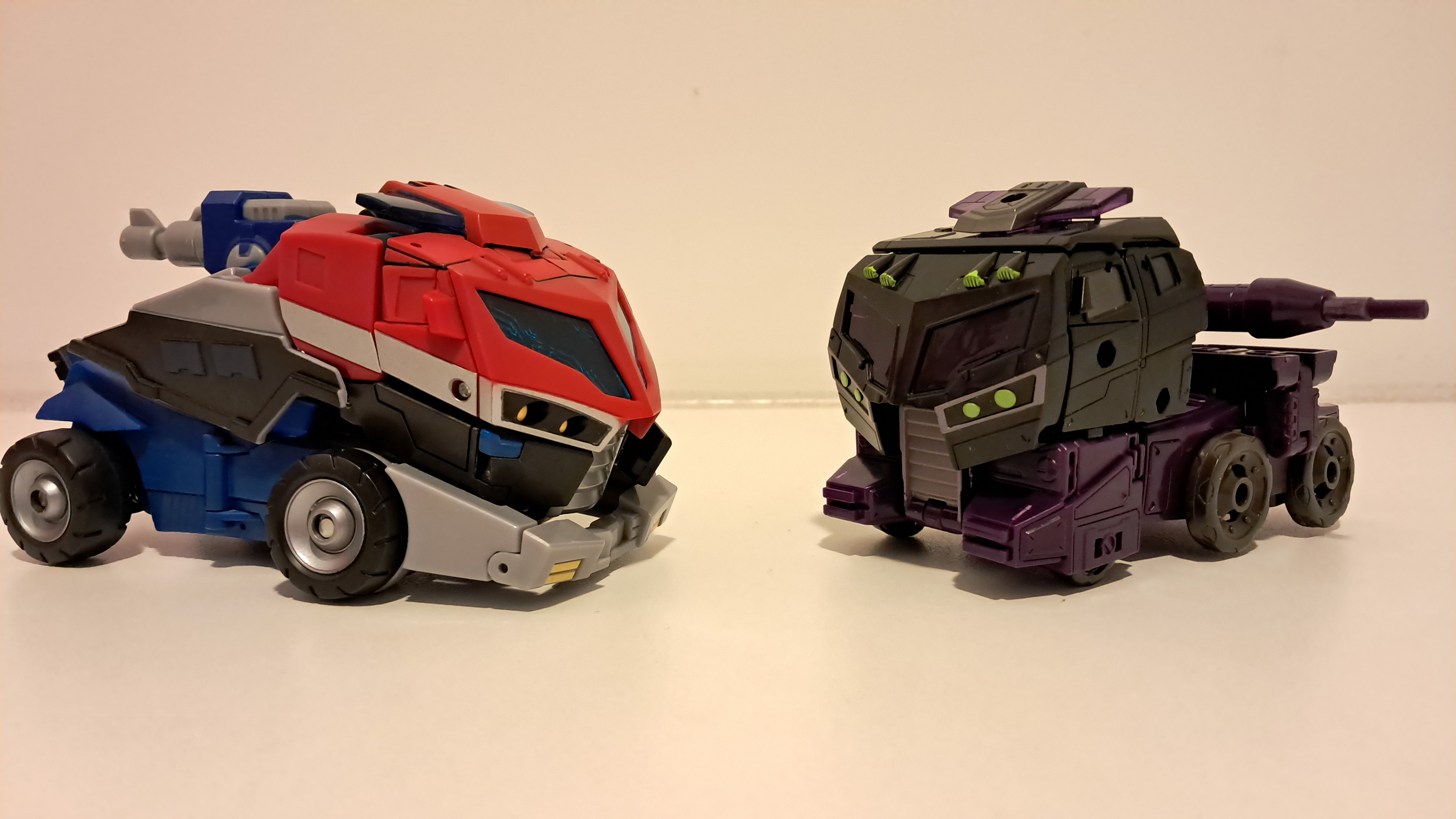 Ik heb de Legacy Animated Optimus overgeslagen omdat ik toch nog de hele goede animated versie had, maar ik was wel gelijk heel erg geïnteresseerd in deze Motormaster. Het paars, het zwart, de felgroene accenten en dat heerlijke vierkante koppie, ik vind het schitterend werken en heel veel karakter hebben. Plus ik heb altijd graag een mold die ik nog niet heb. En nu ik beiden figuren met elkaar vergelijk, valt het helemaal niet tegen. Deze Motormaster is bijna net zo groot als de originele toy, en voelt qua kwaliteit eigenlijk gelijk.