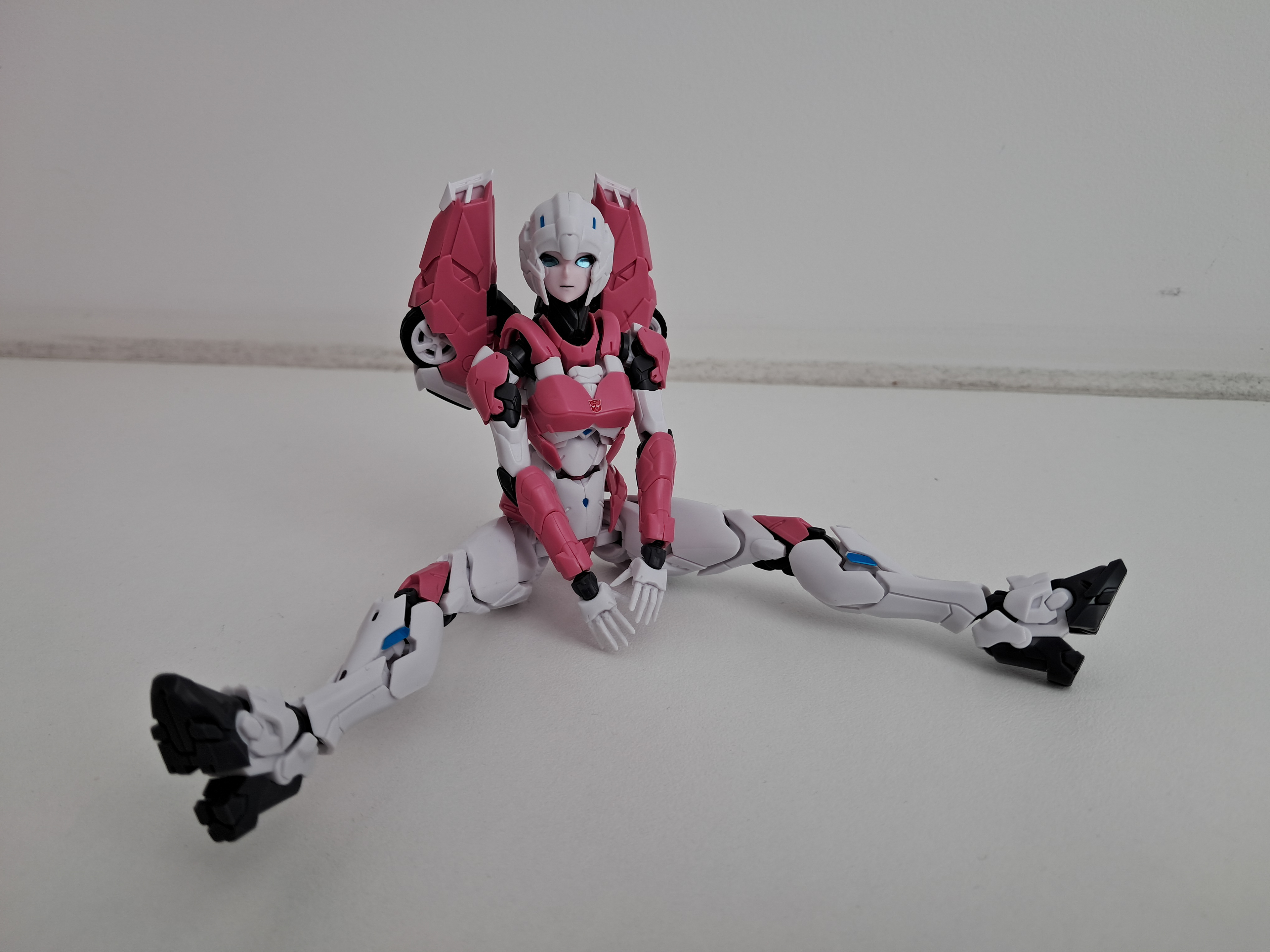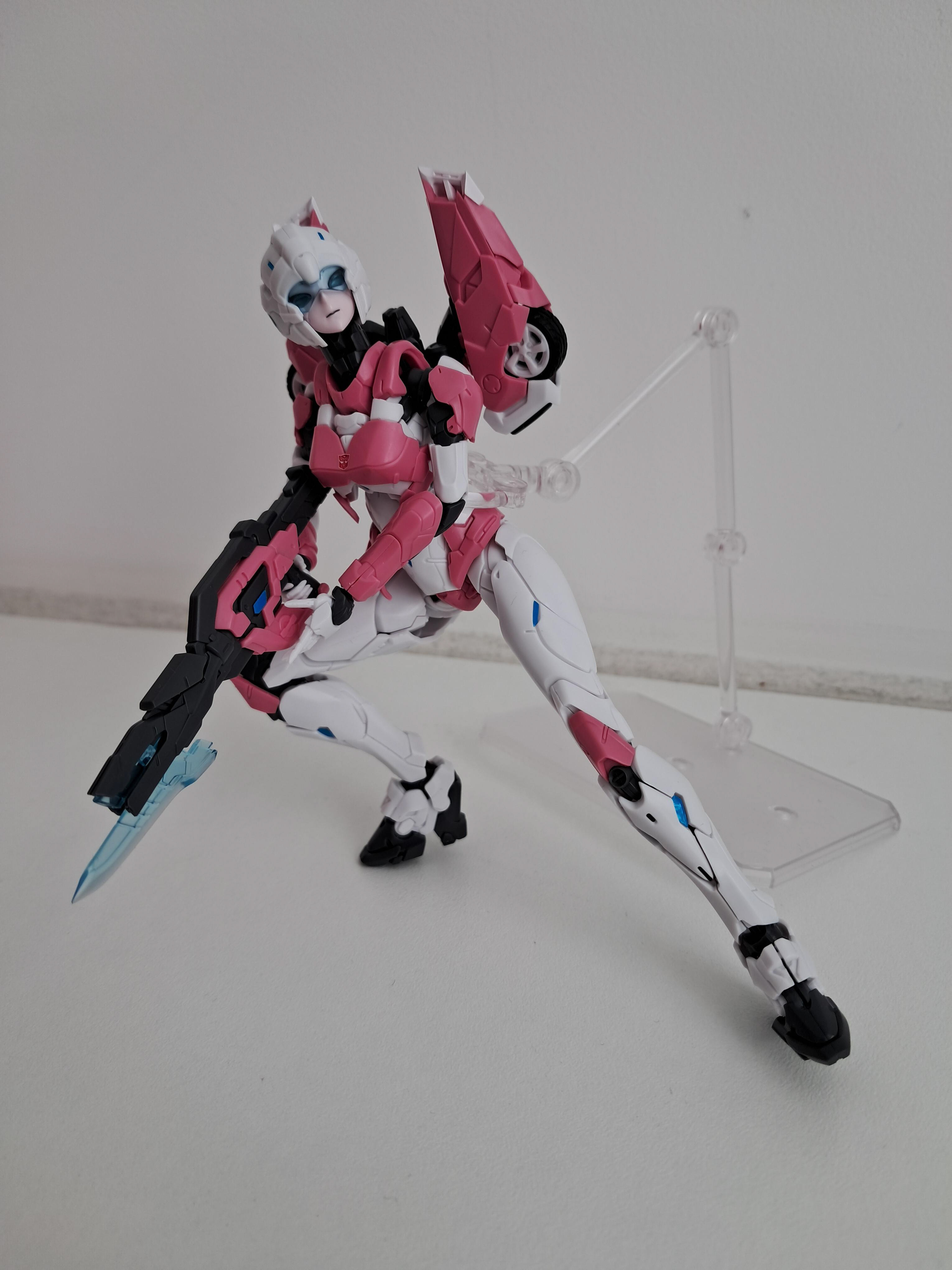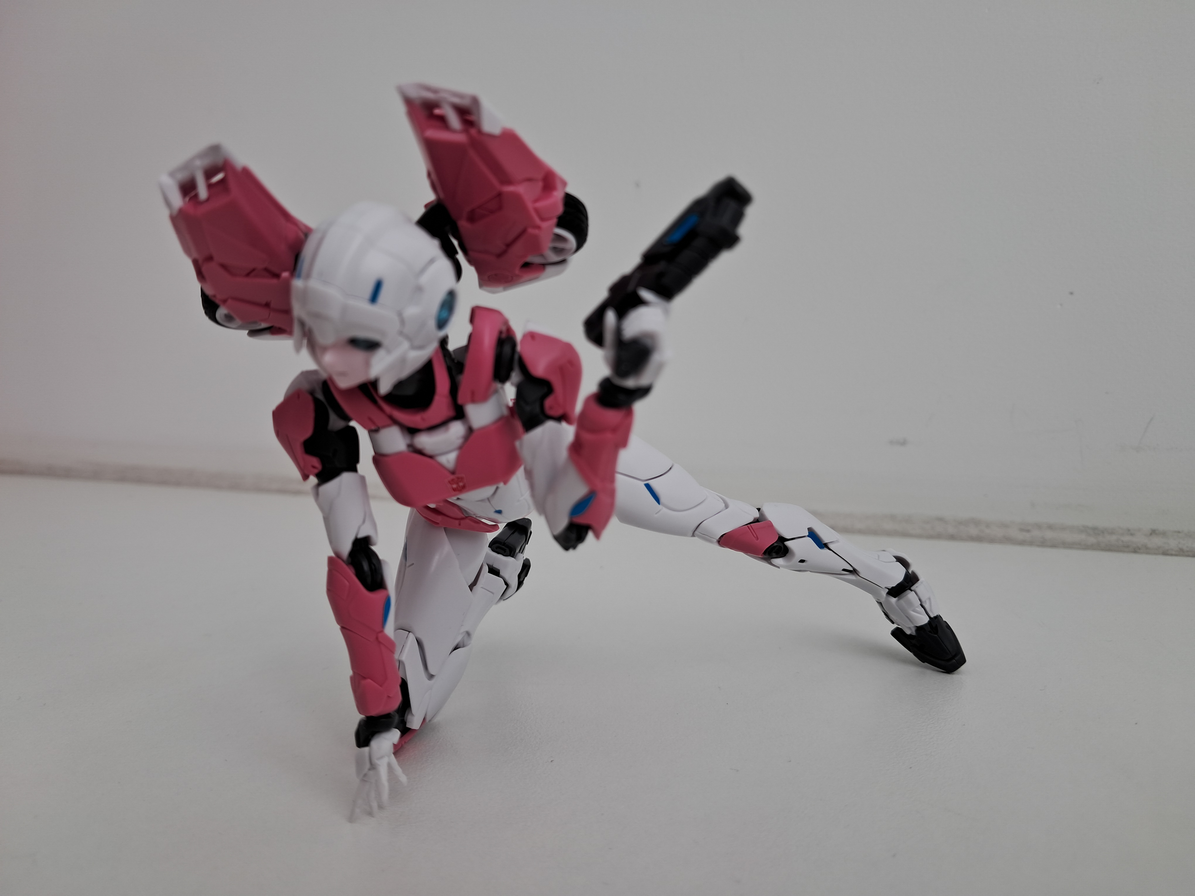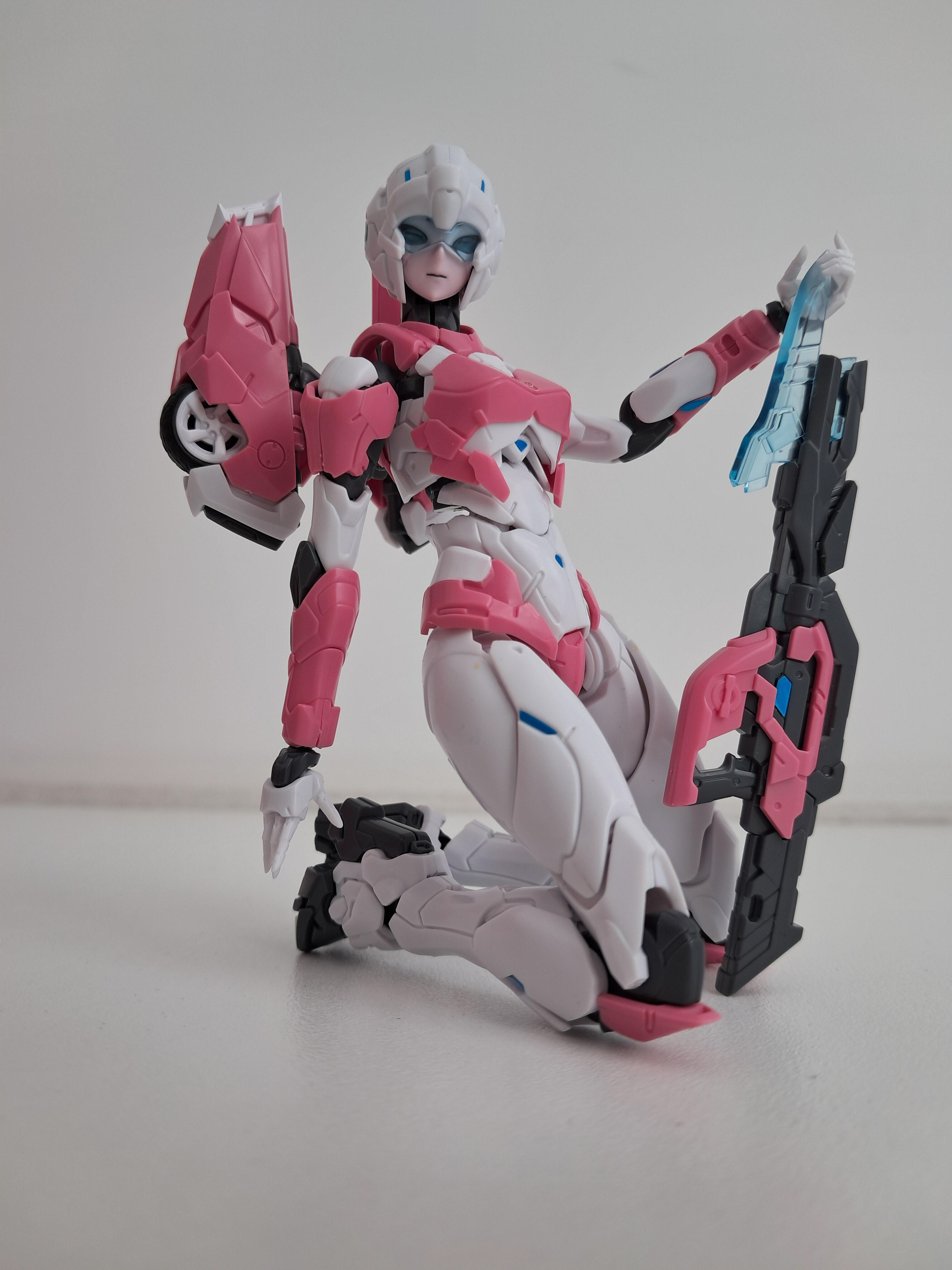 In elkaar geknutseld valt me allereerst op dat deze Arcee qua onderdelen en enginering nauwelijks wat deelt met Windblade, wat mij flink verrast. Het was voor mij de reden om te stoppen met Gunpla, omdat al die Gundams uiteindelijk hetzelfde in elkaar zaten en je gewoon stappen aan het herhalen was. Hier gebruikt Arcee een hoop nieuwe kunstjes, ook om de onderbenen te buigen.