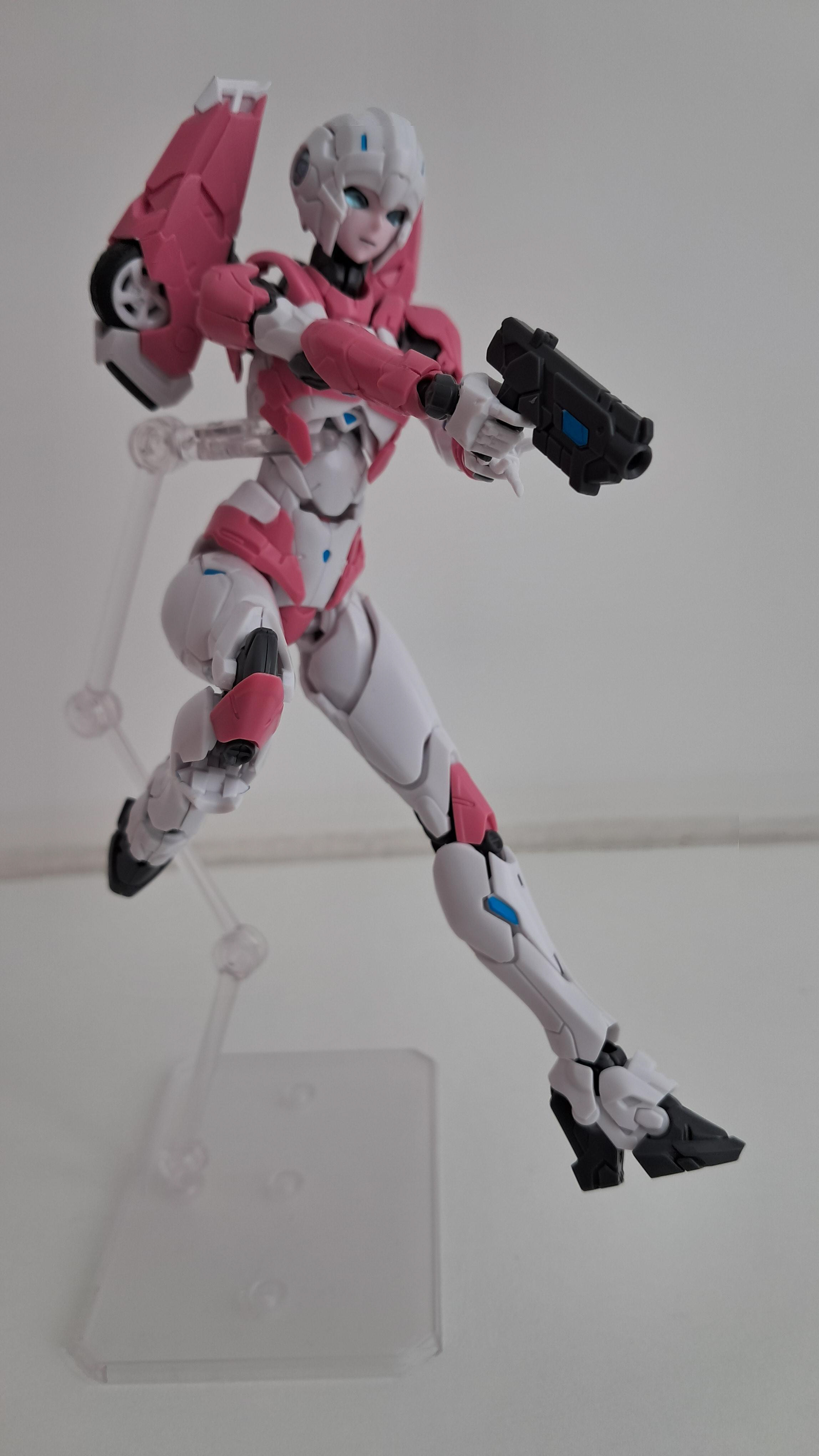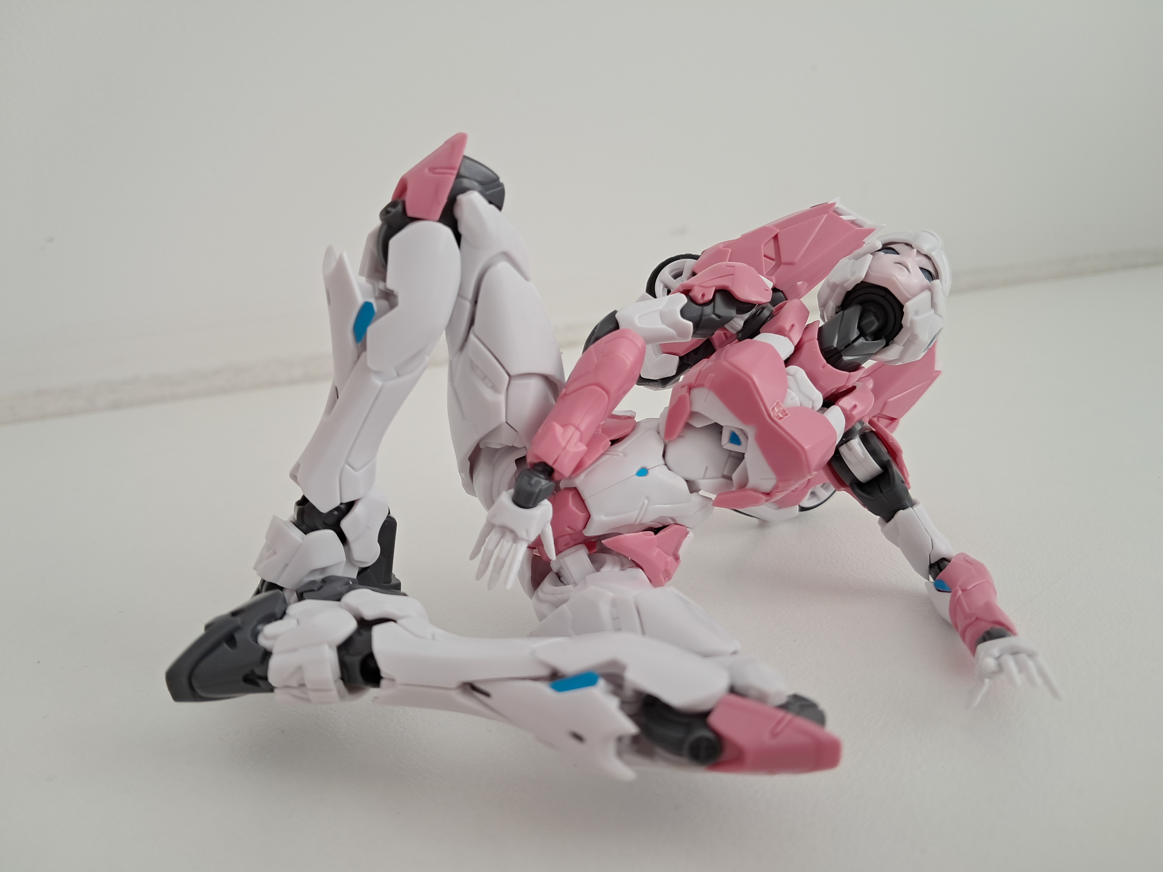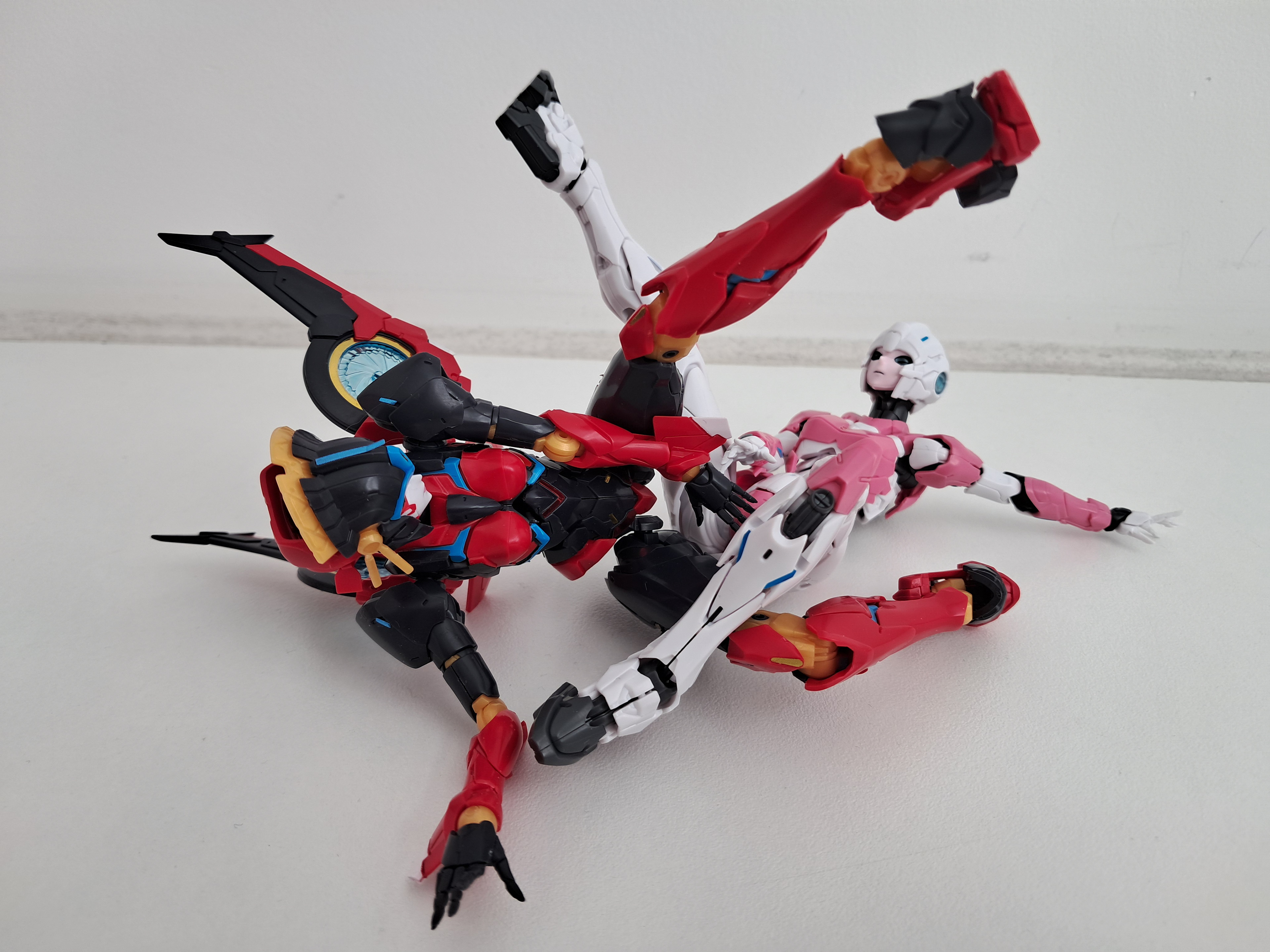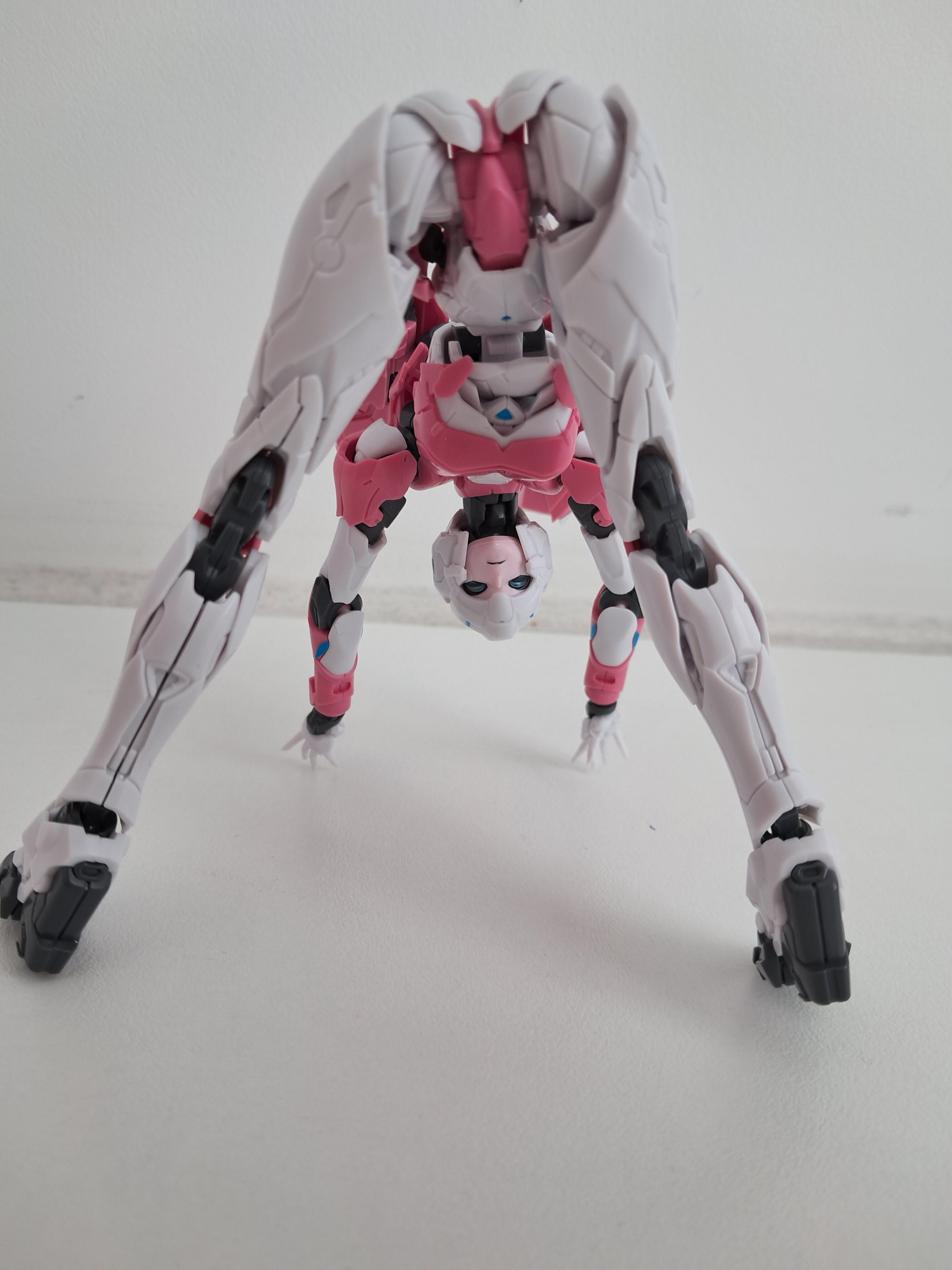 In elkaar geknutseld valt me allereerst op dat deze Arcee qua onderdelen en enginering nauwelijks wat deelt met Windblade, wat mij flink verrast. Het was voor mij de reden om te stoppen met Gunpla, omdat al die Gundams uiteindelijk hetzelfde in elkaar zaten en je gewoon stappen aan het herhalen was. Hier gebruikt Arcee een hoop nieuwe kunstjes, ook om de onderbenen te buigen.