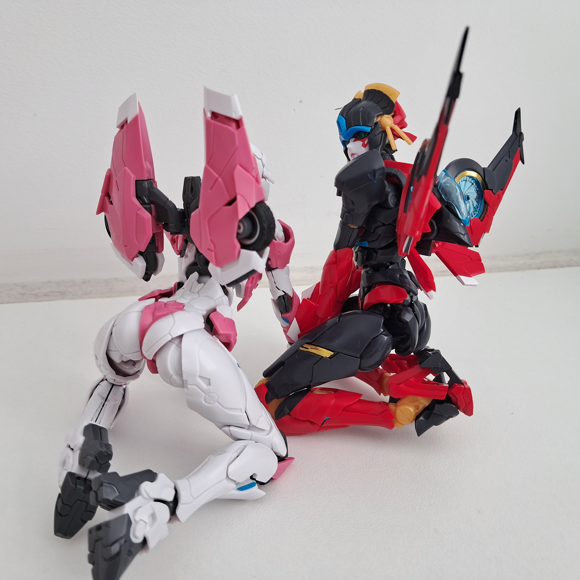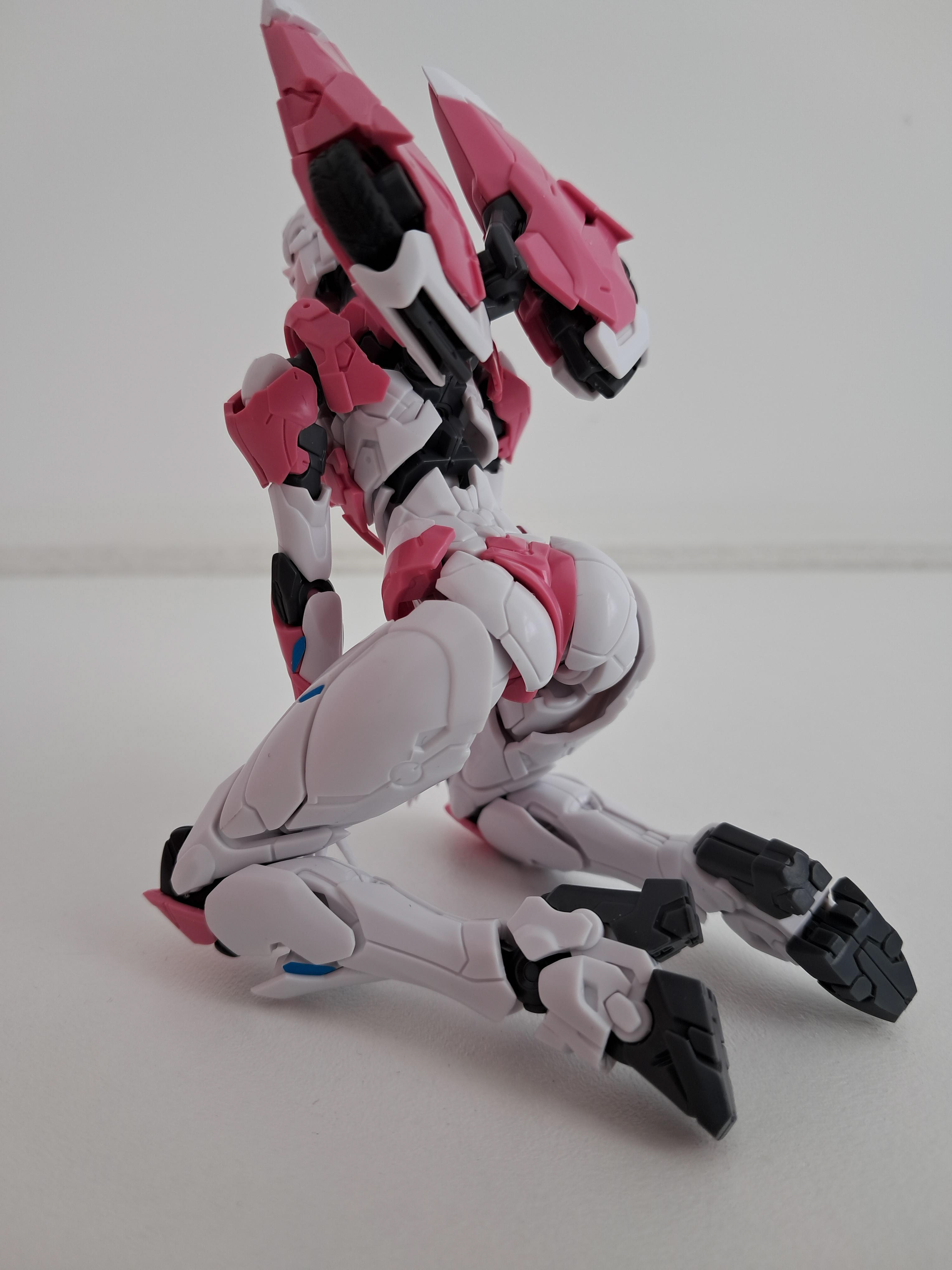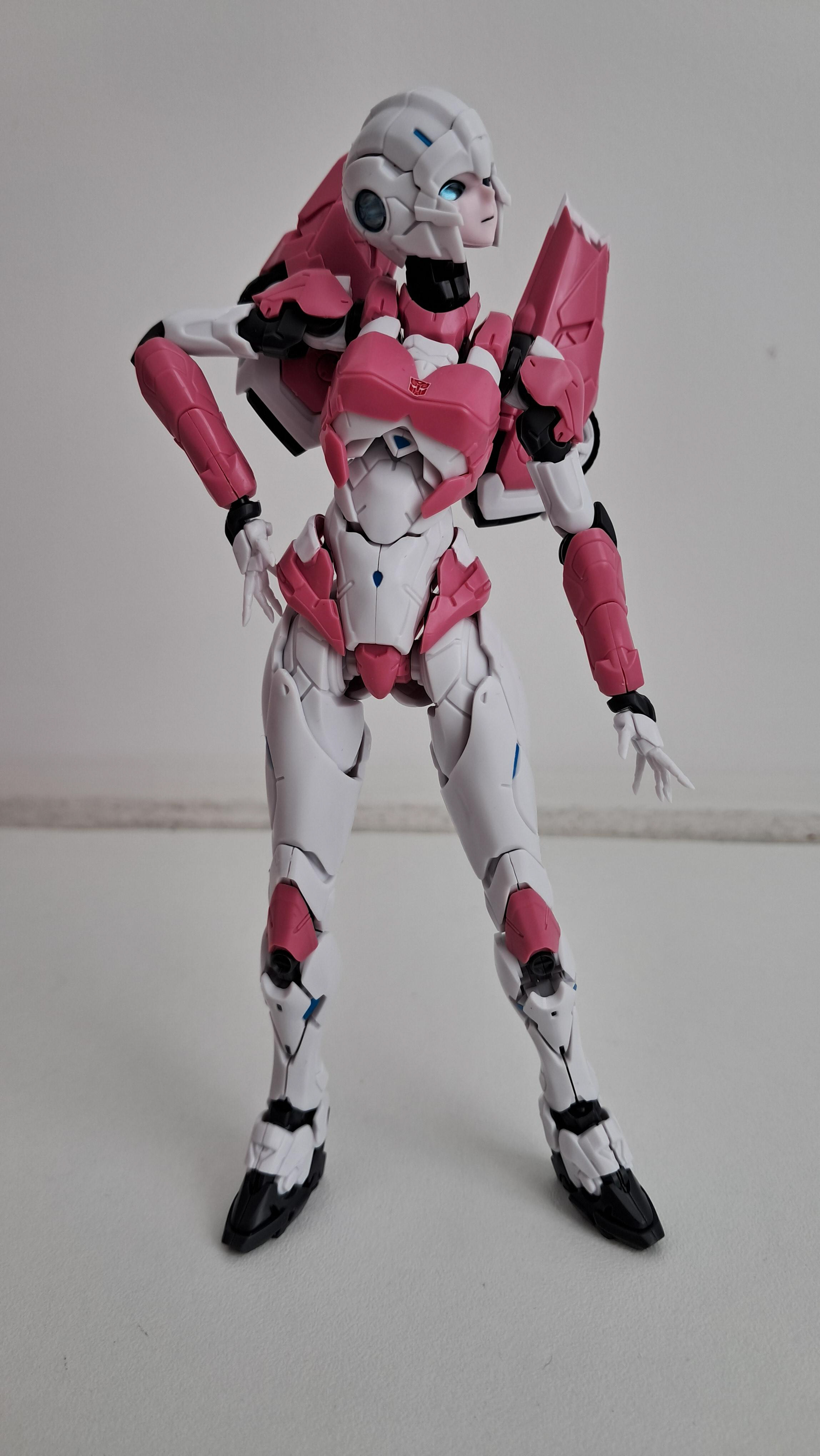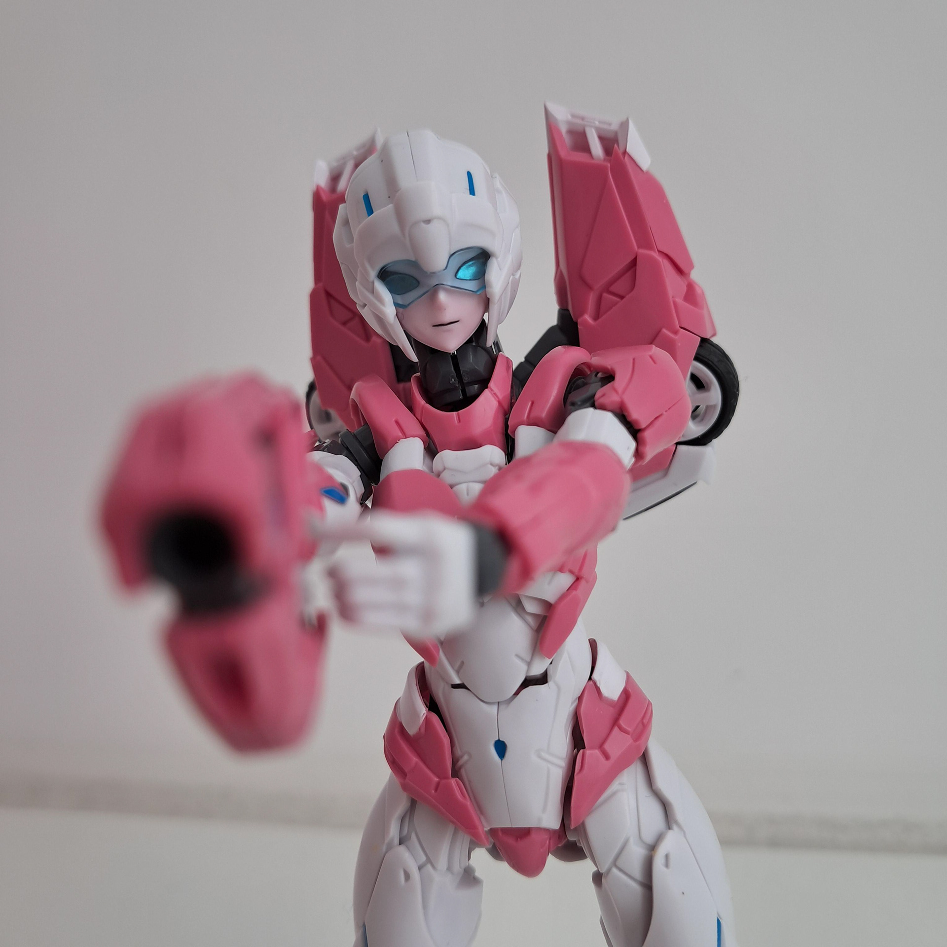 In elkaar geknutseld valt me allereerst op dat deze Arcee qua onderdelen en enginering nauwelijks wat deelt met Windblade, wat mij flink verrast. Het was voor mij de reden om te stoppen met Gunpla, omdat al die Gundams uiteindelijk hetzelfde in elkaar zaten en je gewoon stappen aan het herhalen was. Hier gebruikt Arcee een hoop nieuwe kunstjes, ook om de onderbenen te buigen.