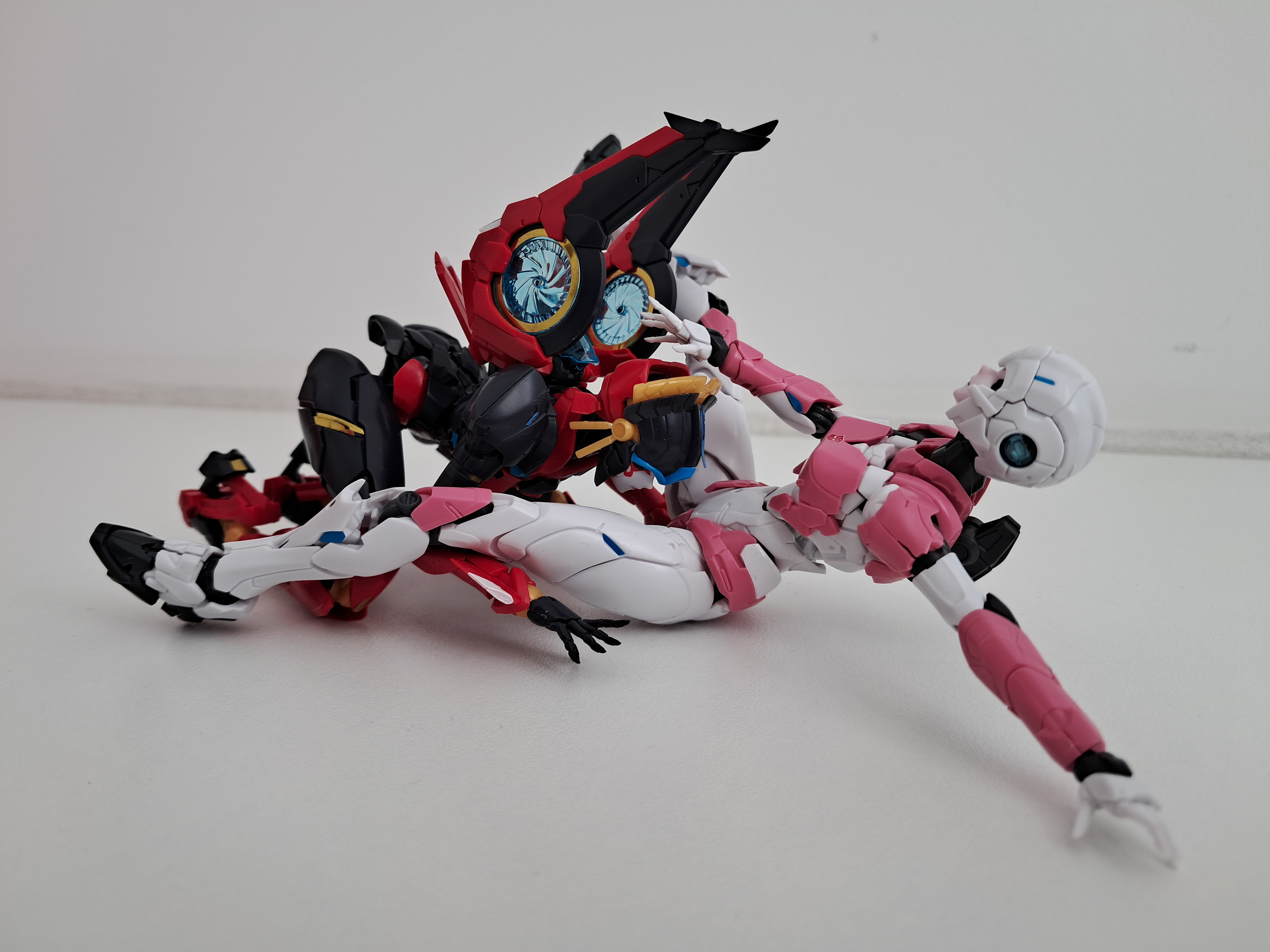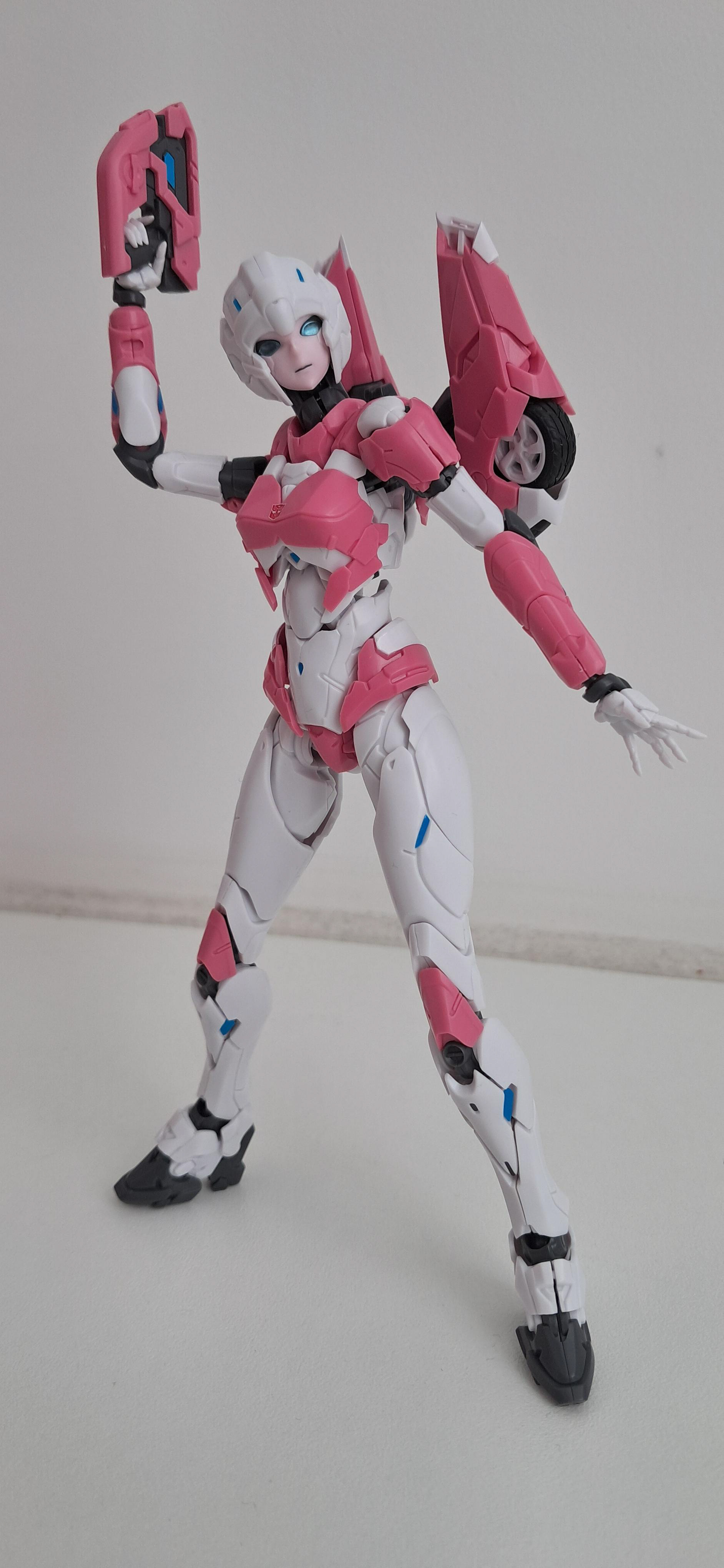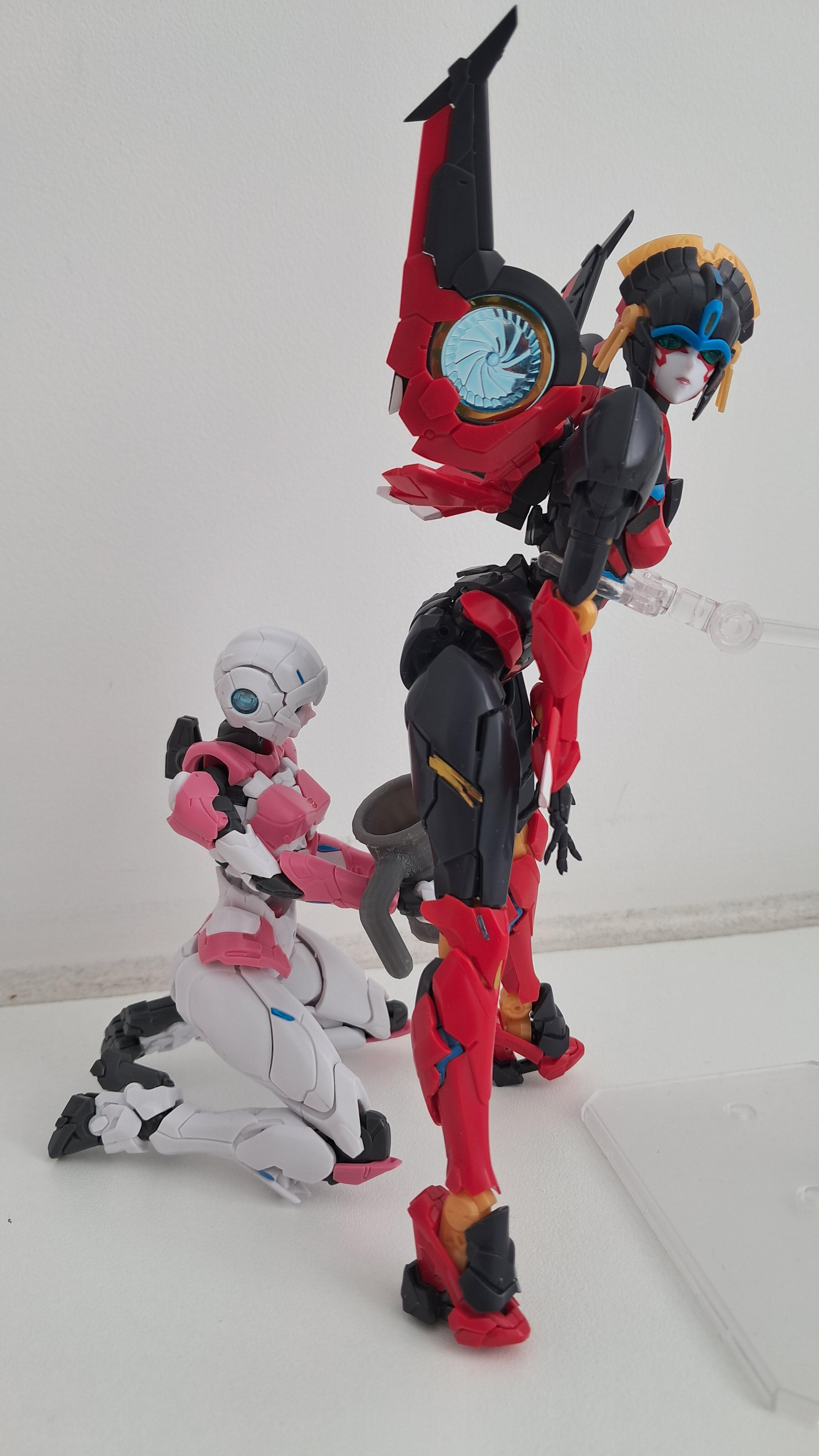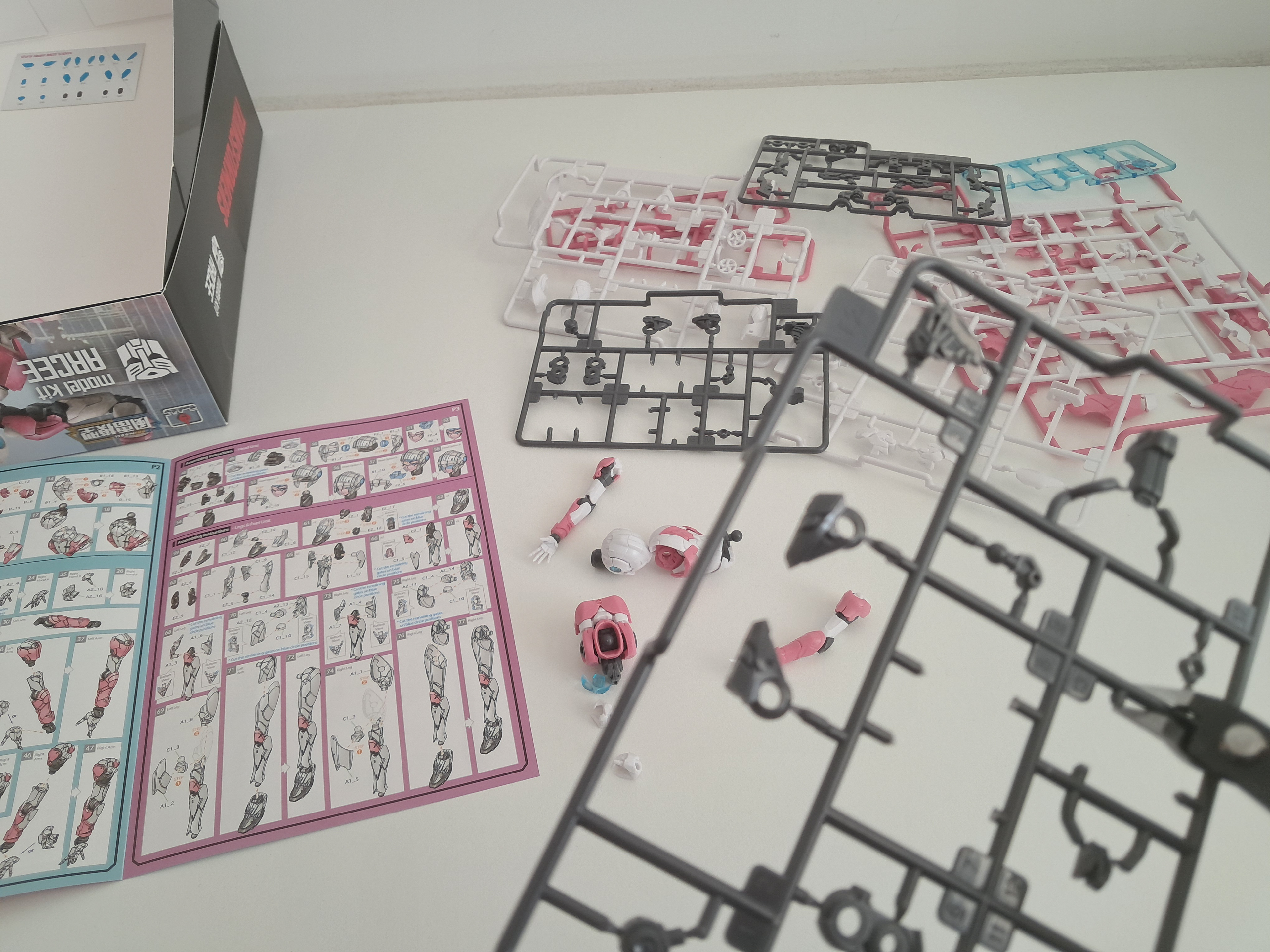 In elkaar geknutseld valt me allereerst op dat deze Arcee qua onderdelen en enginering nauwelijks wat deelt met Windblade, wat mij flink verrast. Het was voor mij de reden om te stoppen met Gunpla, omdat al die Gundams uiteindelijk hetzelfde in elkaar zaten en je gewoon stappen aan het herhalen was. Hier gebruikt Arcee een hoop nieuwe kunstjes, ook om de onderbenen te buigen.