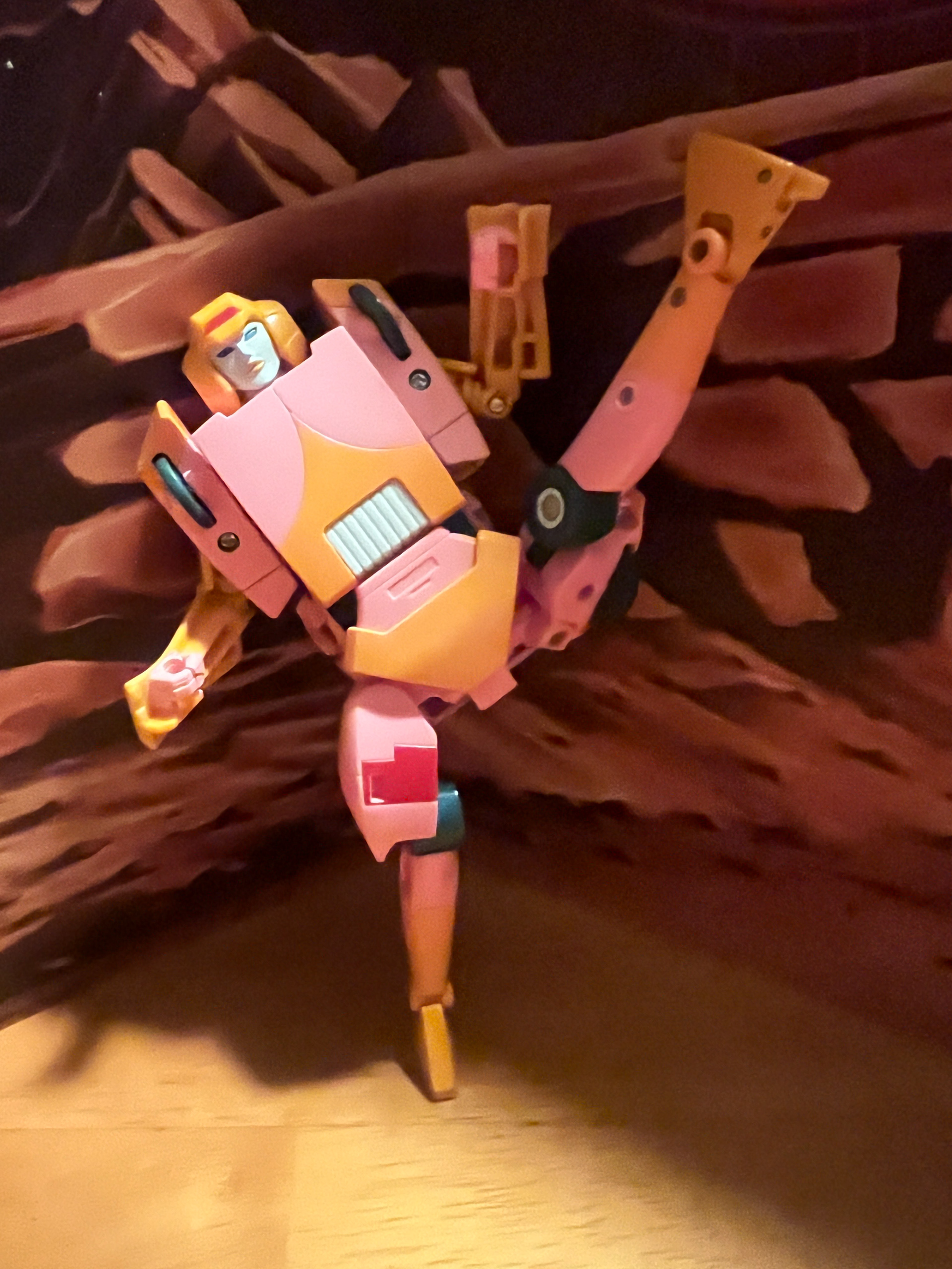 Transformeren is zoals de meeste jaren 80 figuren vrij simpel en zonder gebruiksaanwijzing te doen. Even de borst over haar hoofd heen klappen, haar armpjes recht duwen, en haar benen met heup en al 180 graden naar binnen buigen, uniek is dat een tussenstang als as ook een stukje kan in/uitklappen zodat het geheel perfect aan elkaar past.