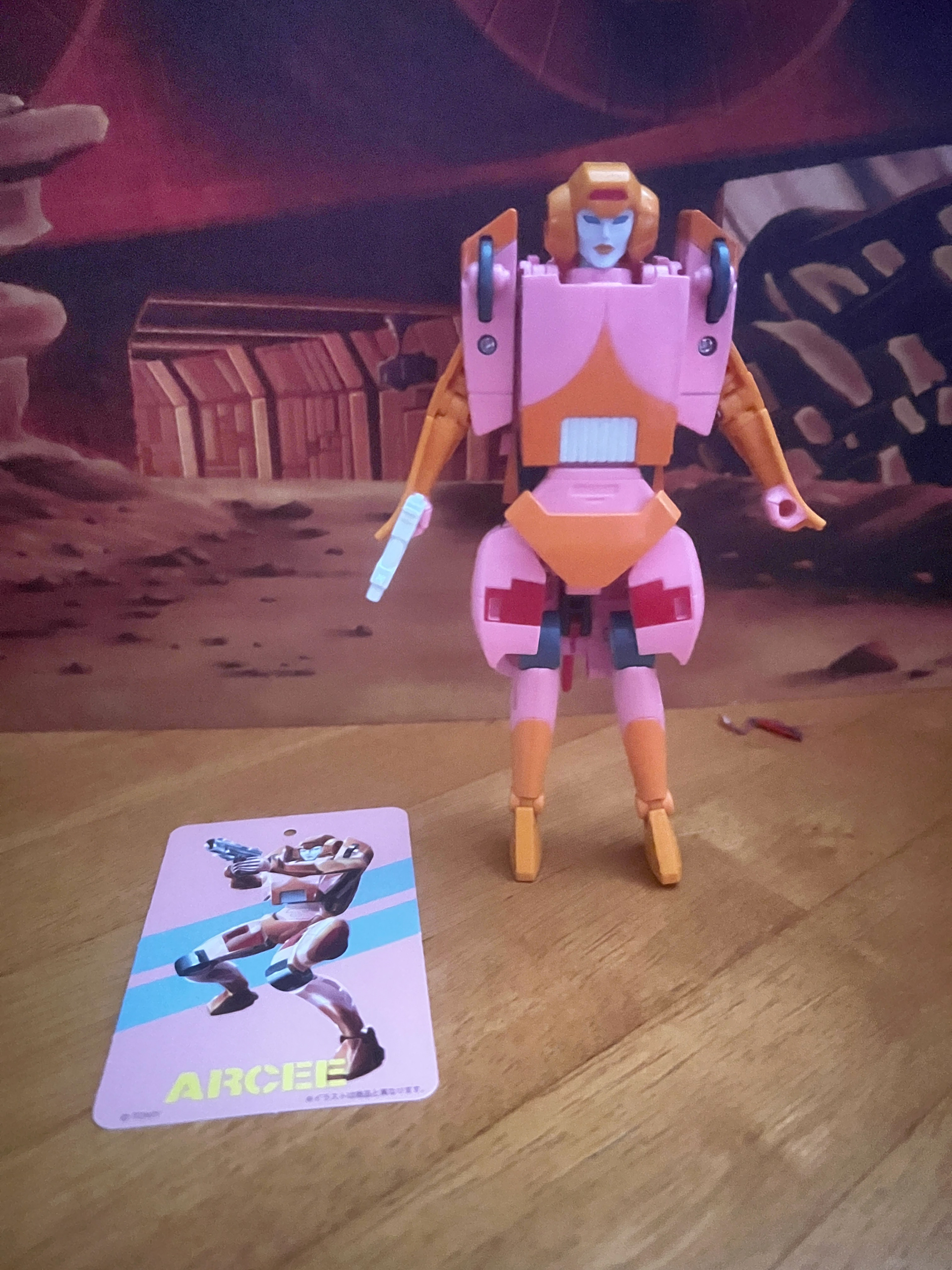 Nadat ik Arcee uitpakte uit een eigenlijk wel klein doosje, en ik het figuur in mijn hand hield, voelde ik meteen, dit is kwaliteit. Het figuur is van fijn metaal wat het gevoel van de jaren tachtig figuren oproept maar toch ook weer net iets beter aan voelt. Het uiterlijk is niet perfect, ze heeft elegante benen maar haar heupen zijn te dik, haar armen enigszins beperkt, het hoofd is duidelijk Prinses Lea uit Star Wars A new Hope gebaseerd, en het gezicht is Japans opgemaakt, en ik zeg niks over haar borstkast of het achterwerk. Maar het is ook niet de bedoeling van dit figuur om op de cartoon Arcee te lijken, de bedoeling is de klassieke nostalgie te herleven.