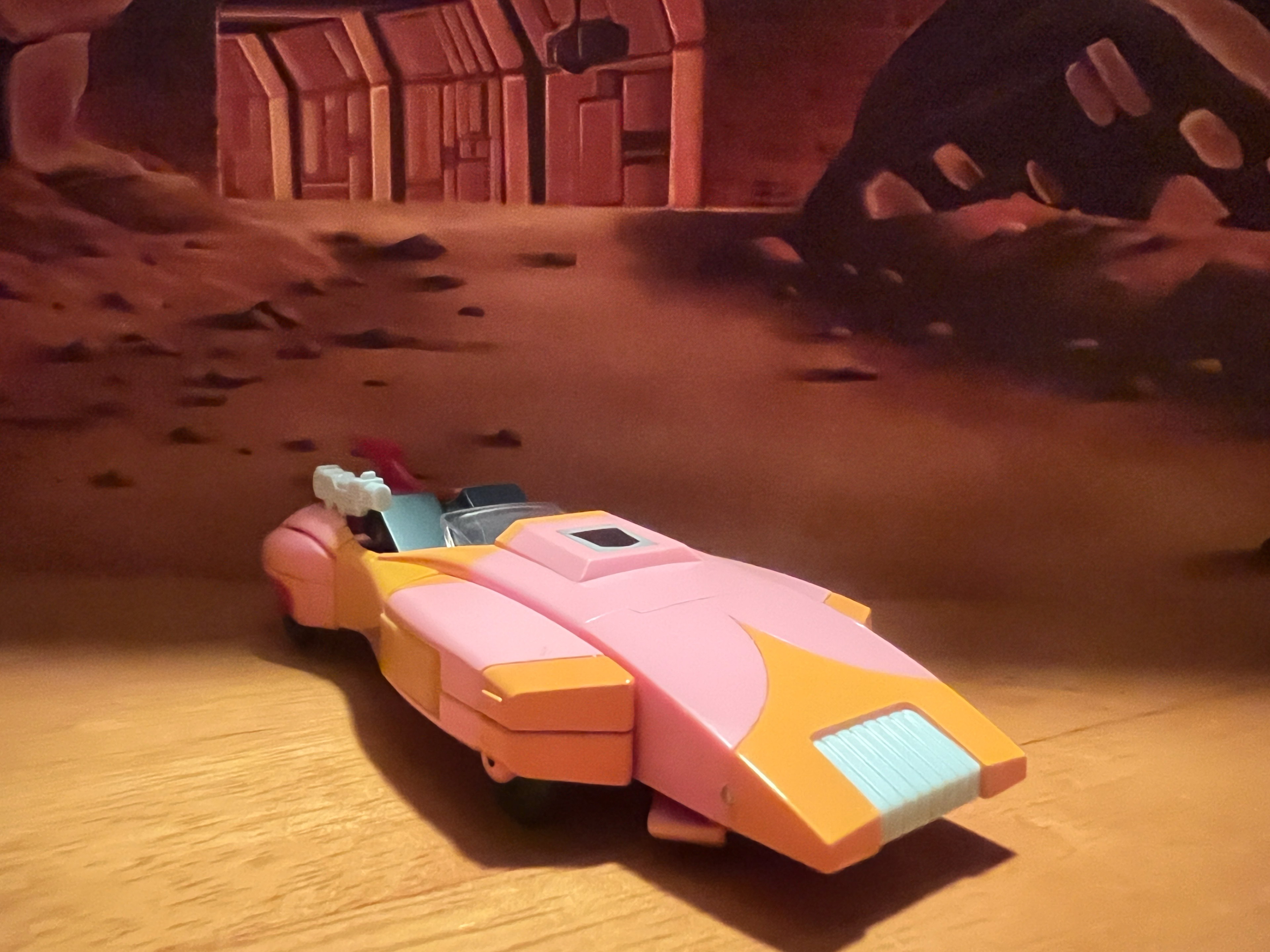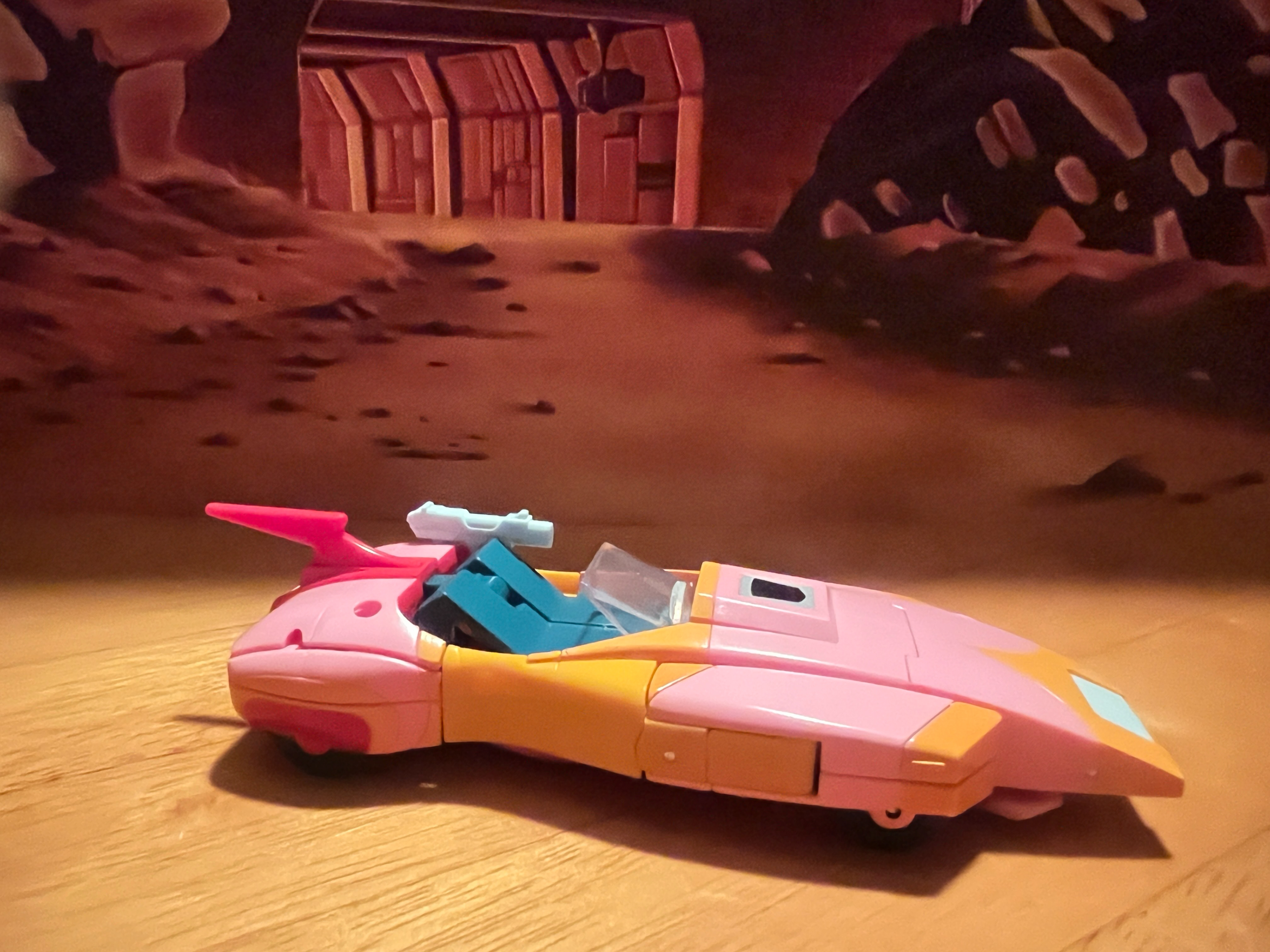 Had ik net nog vermeld dat het uiterlijk niet perfect is, dat geld niet voor haar voertuig mode, want dit is de meest perfecte Arcee voertuig mode die ik in mijn handen heb gehad, de voertuig voelt gewoon stevig en perfect uitgelijnd aan, het metaal en gewicht komt prima tot zijn recht. Ook het uiterlijk is onmiskenbaar Arcee, en weer een dingetje wat mij doet vermoeden dat het ietsjes gemoderniseerd is, Arcee kan haar wapen dragen in haar Alt-mode, wat kan er nog verbeterd worden?