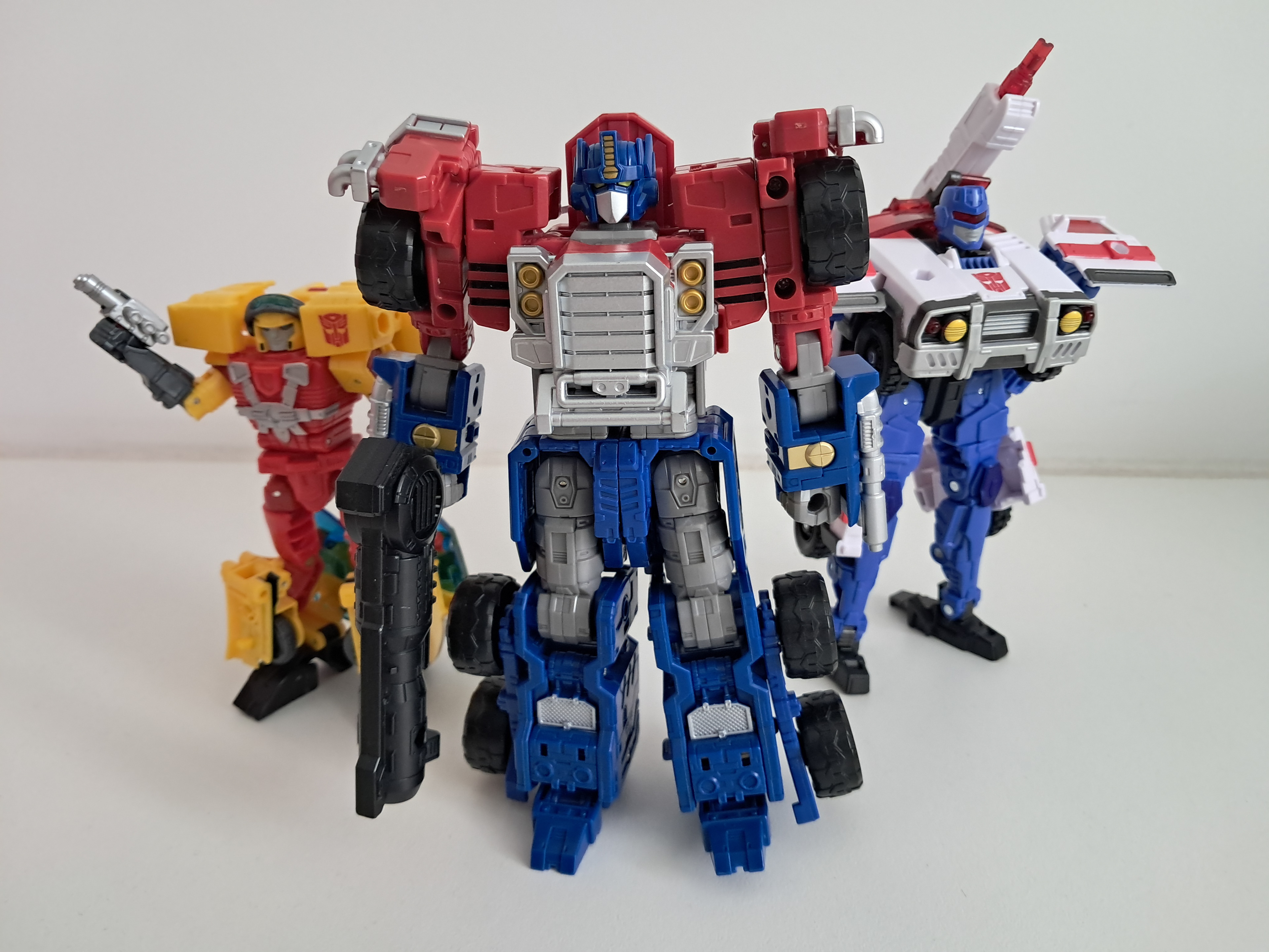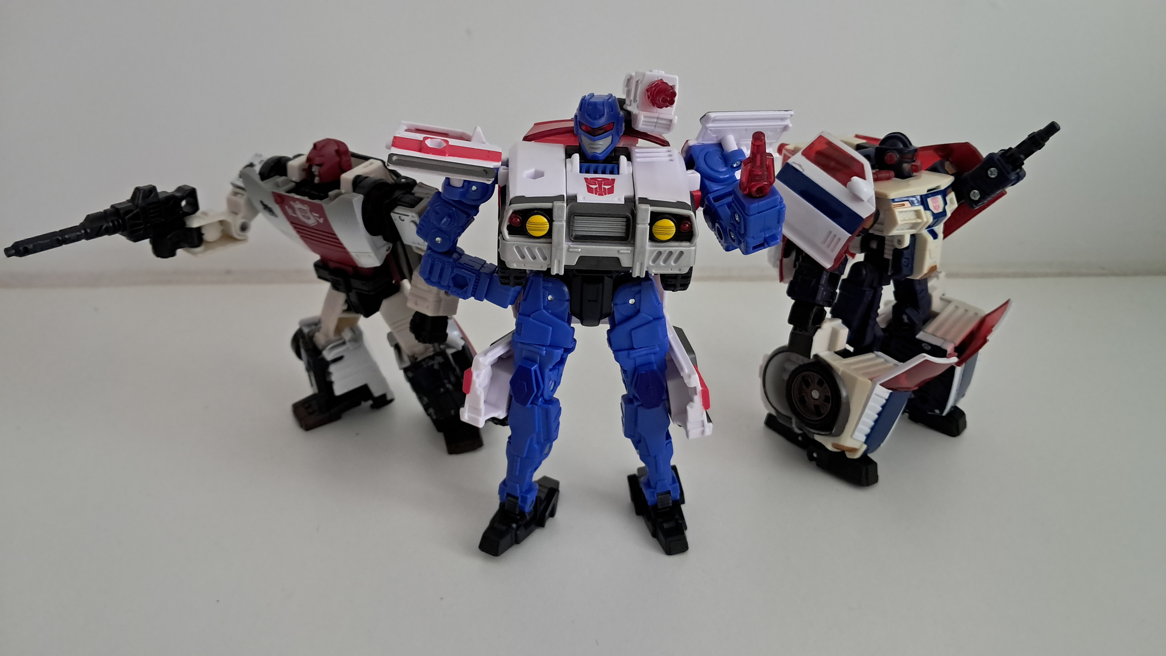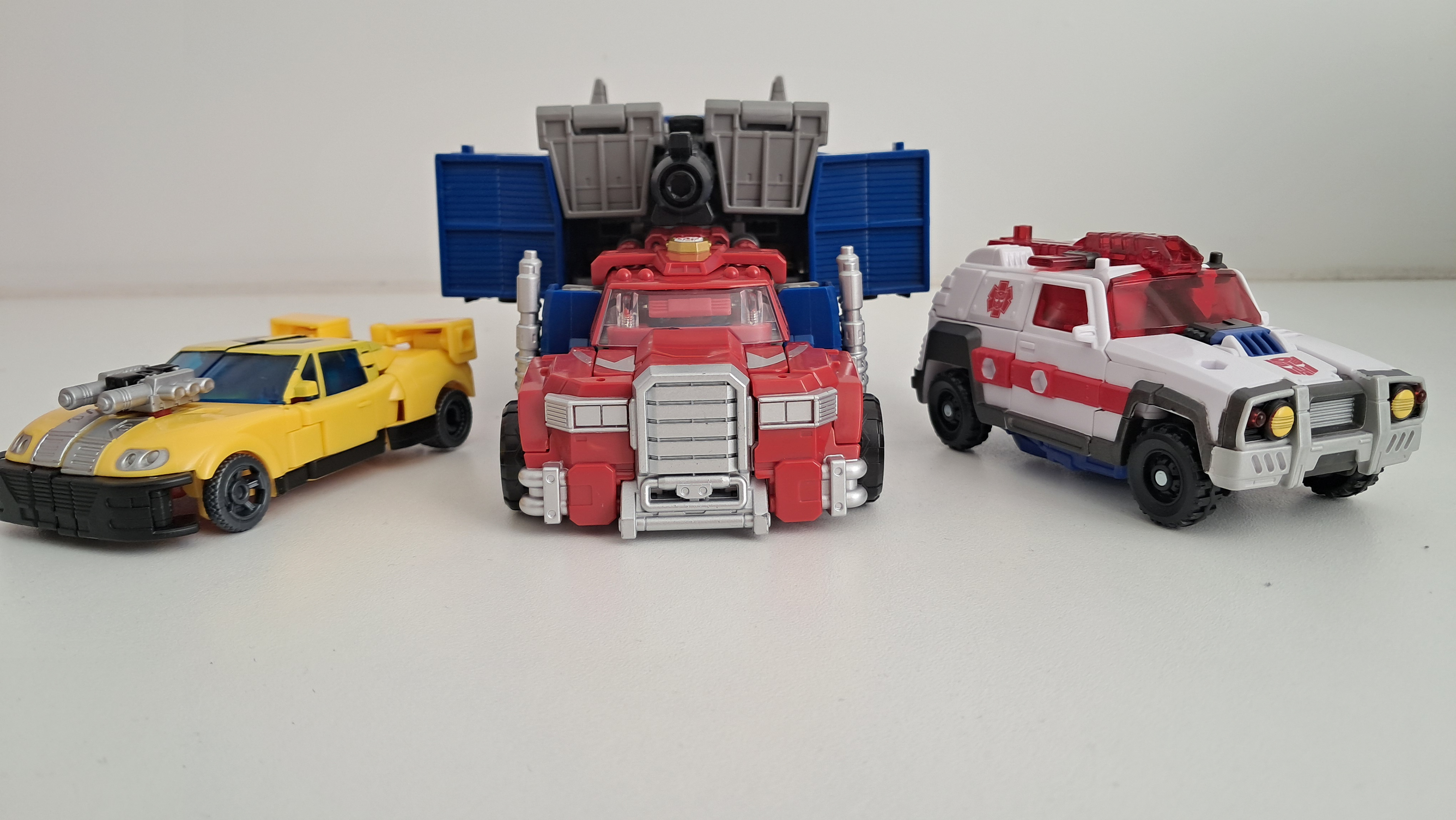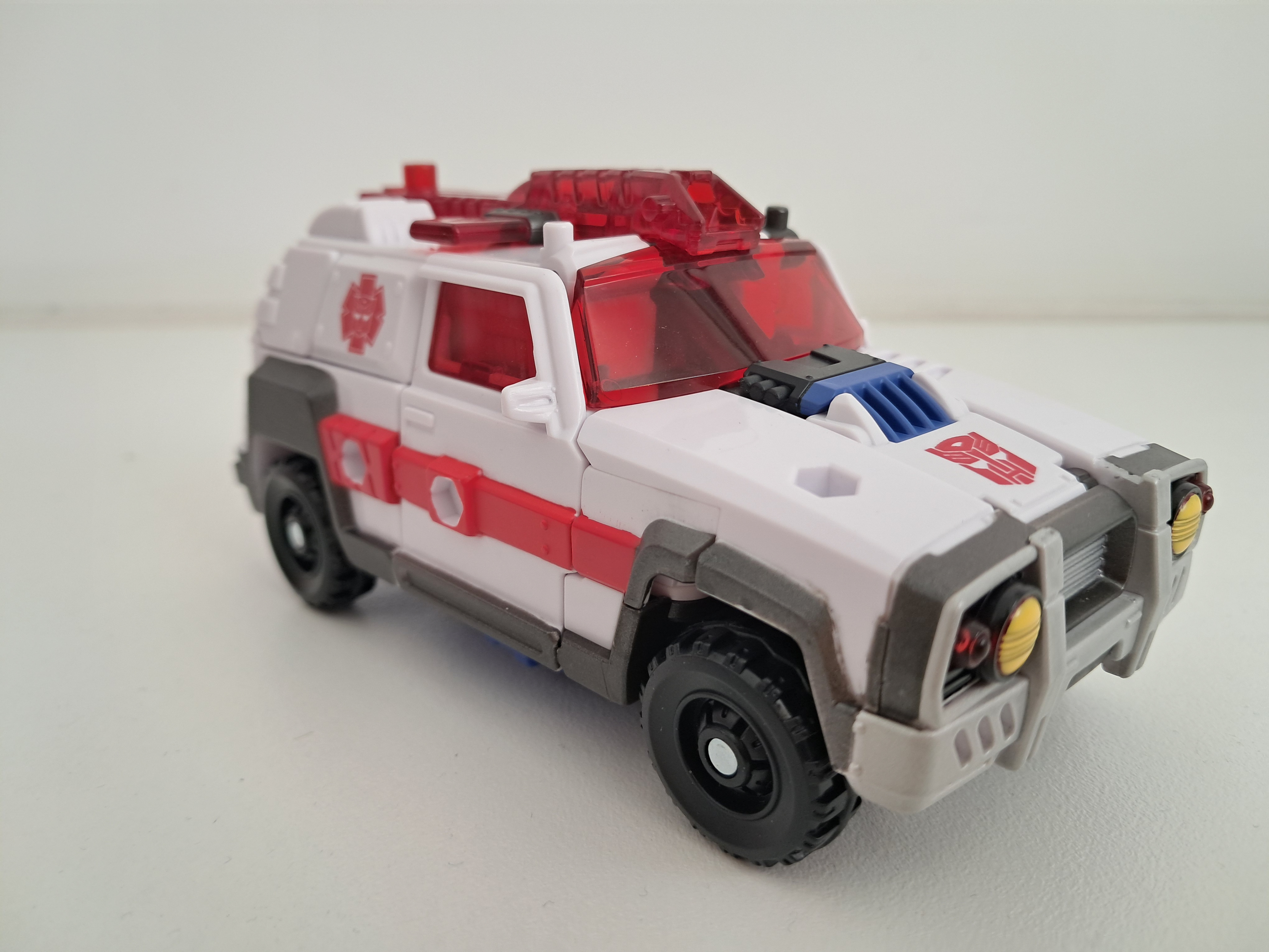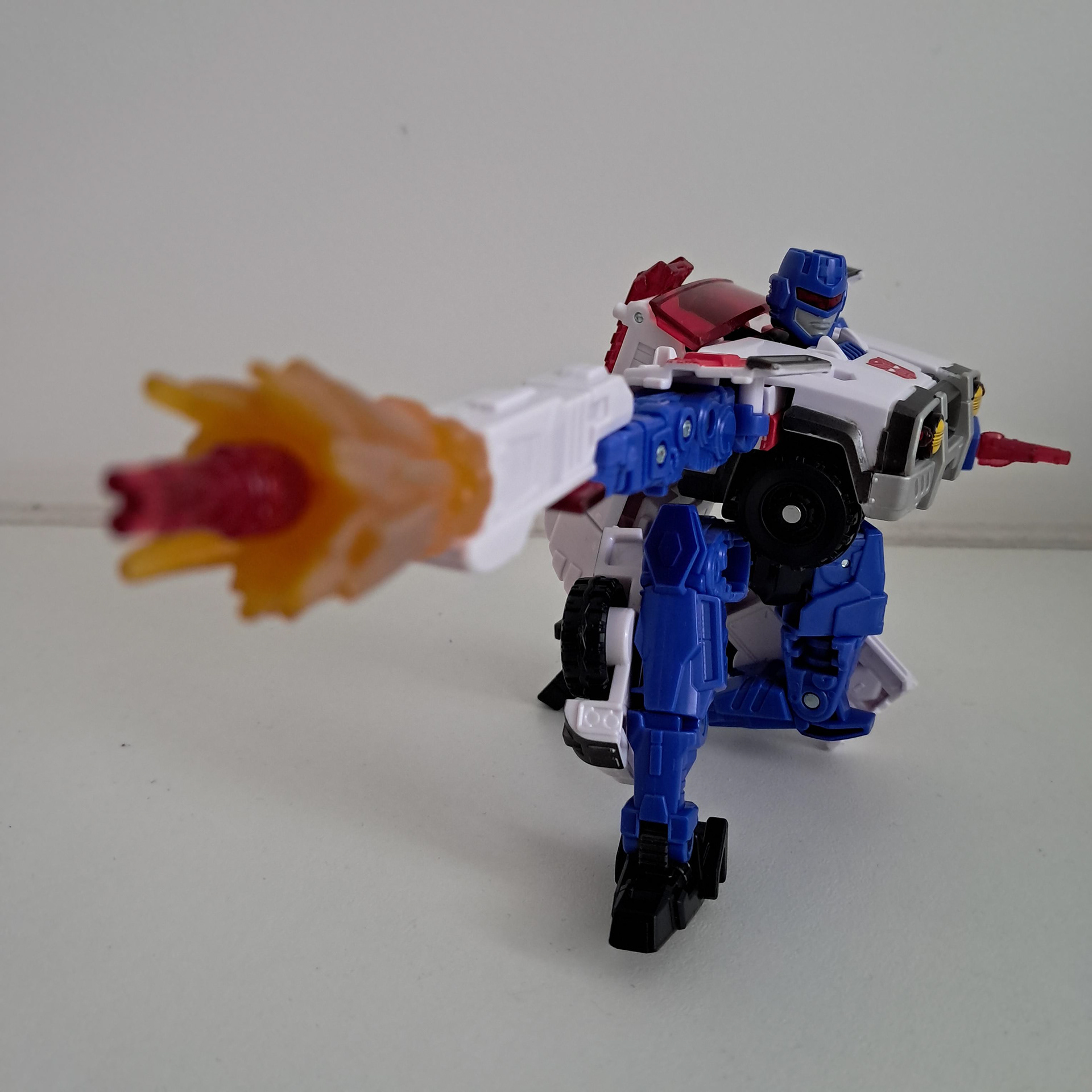 Armada Red Alert dus, die eruit ziet alsof Robocop een auto heeft aangetrokken. Het origineel was vooral bekend omdat hij veel te groot was, vooral naast Optimus, en omringt was door rondflubberende auto onderdelen. En eigenlijk doet deze nieuwe versie van Red Alert eigenlijk niet zoveel anders. Tuurlijk, hij heeft alle gewrichten die je van een modern figuur mag verwachten, met ook alle funny features er uit gesloopt want het is inmiddels 2025 en fun is verboden.