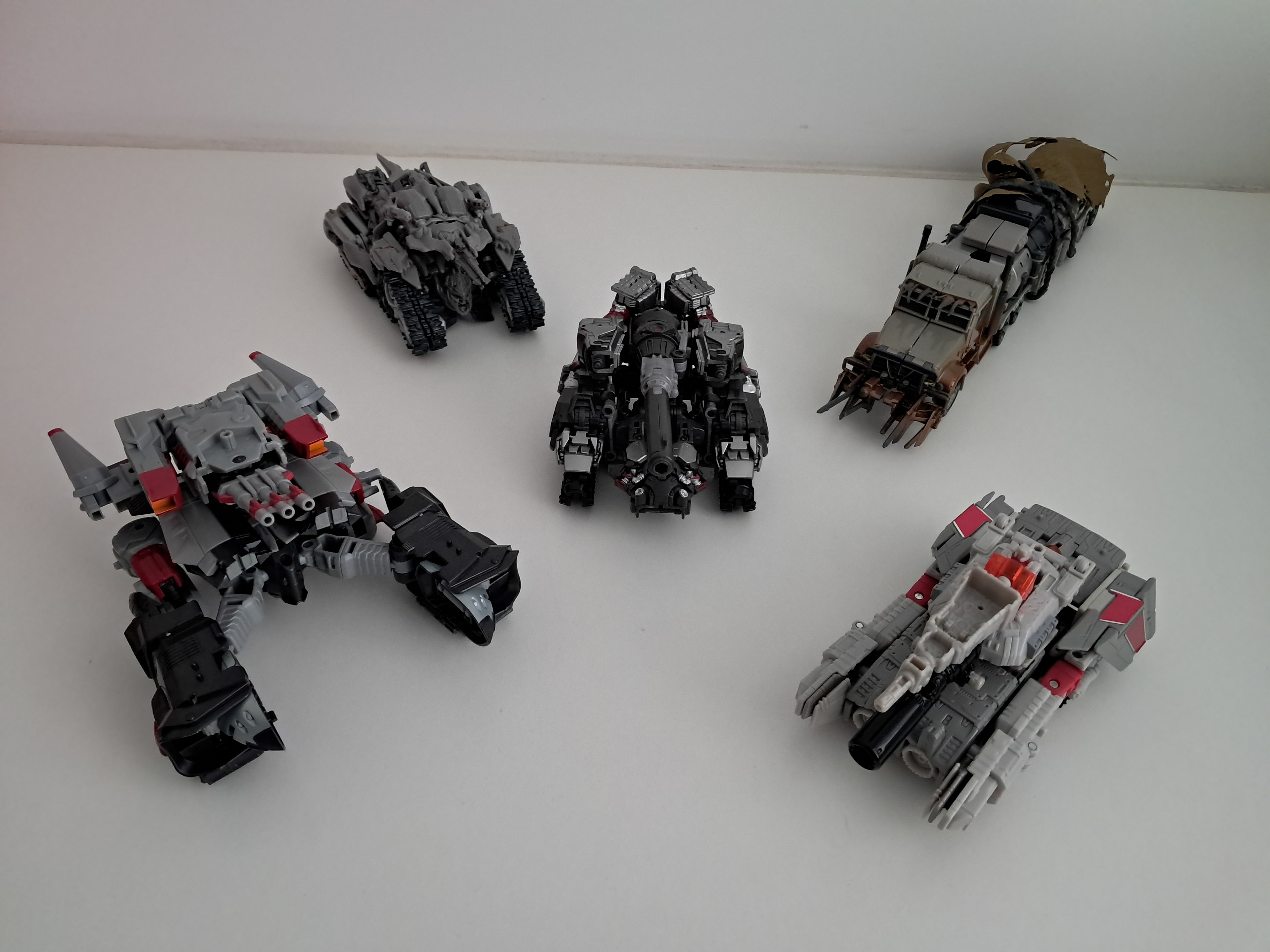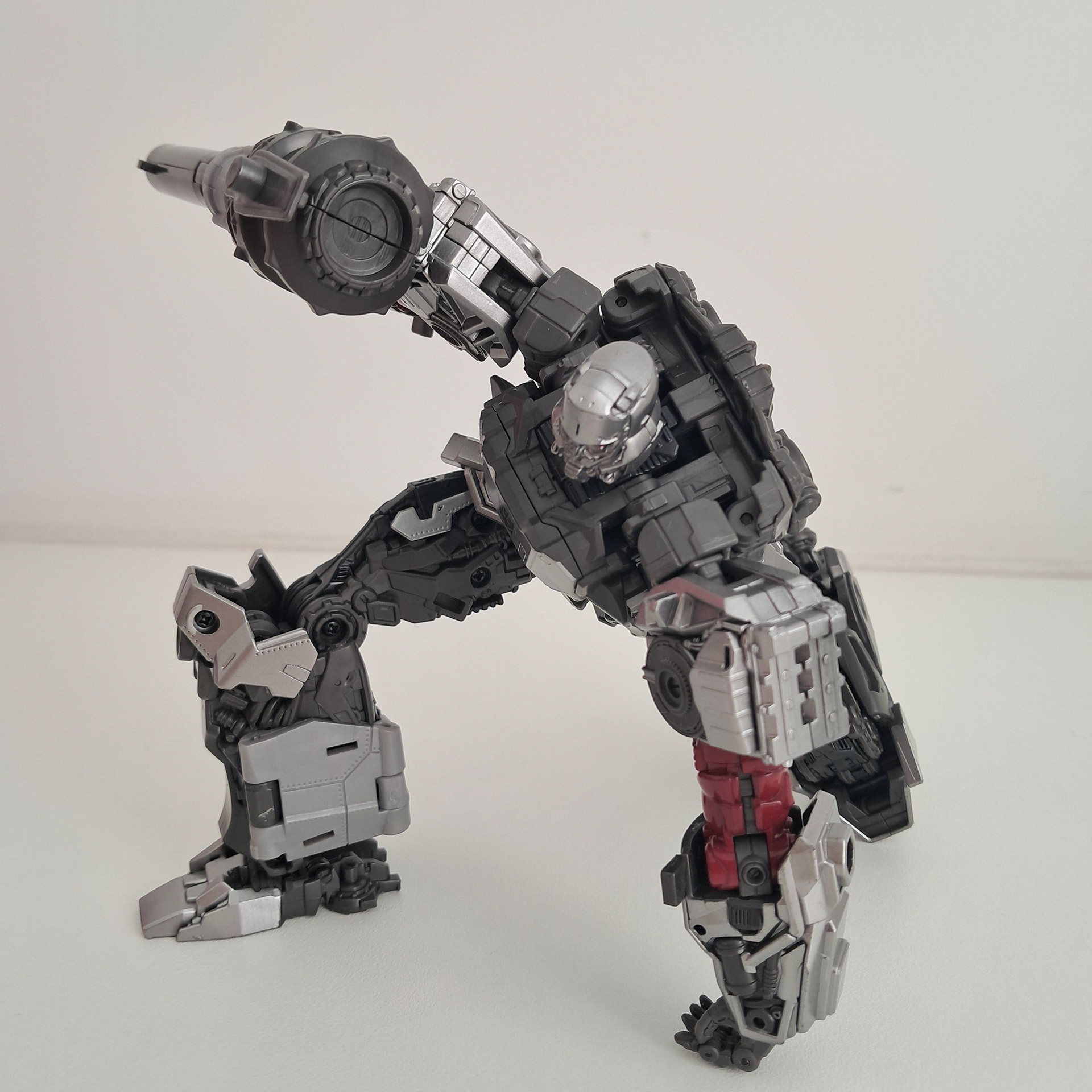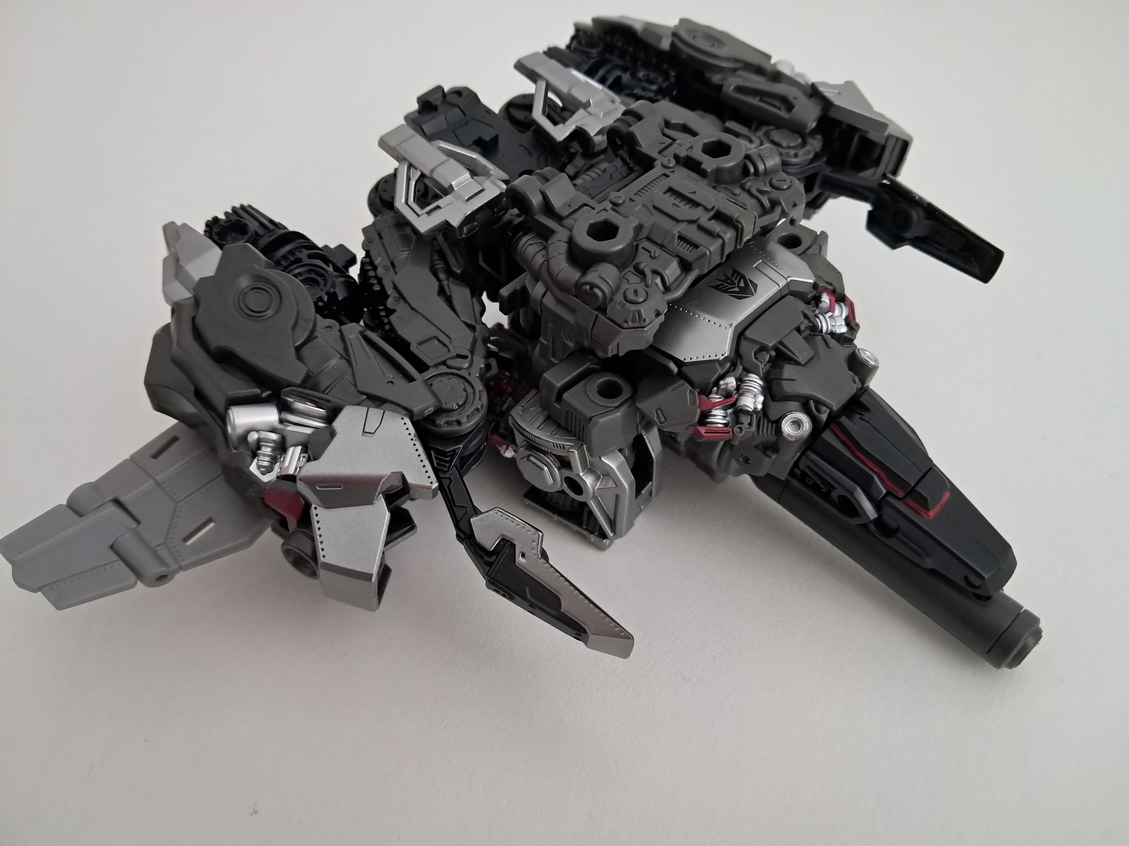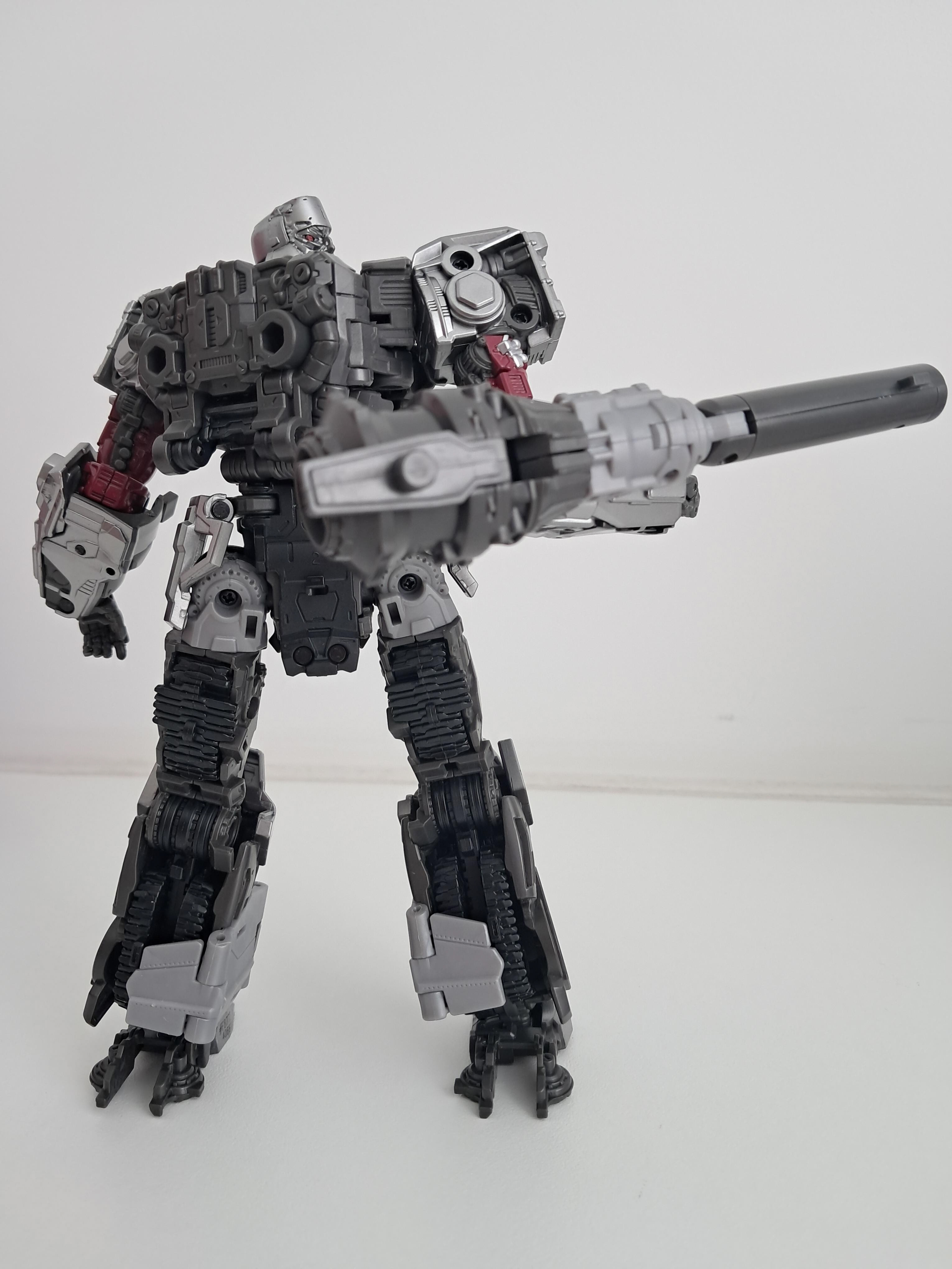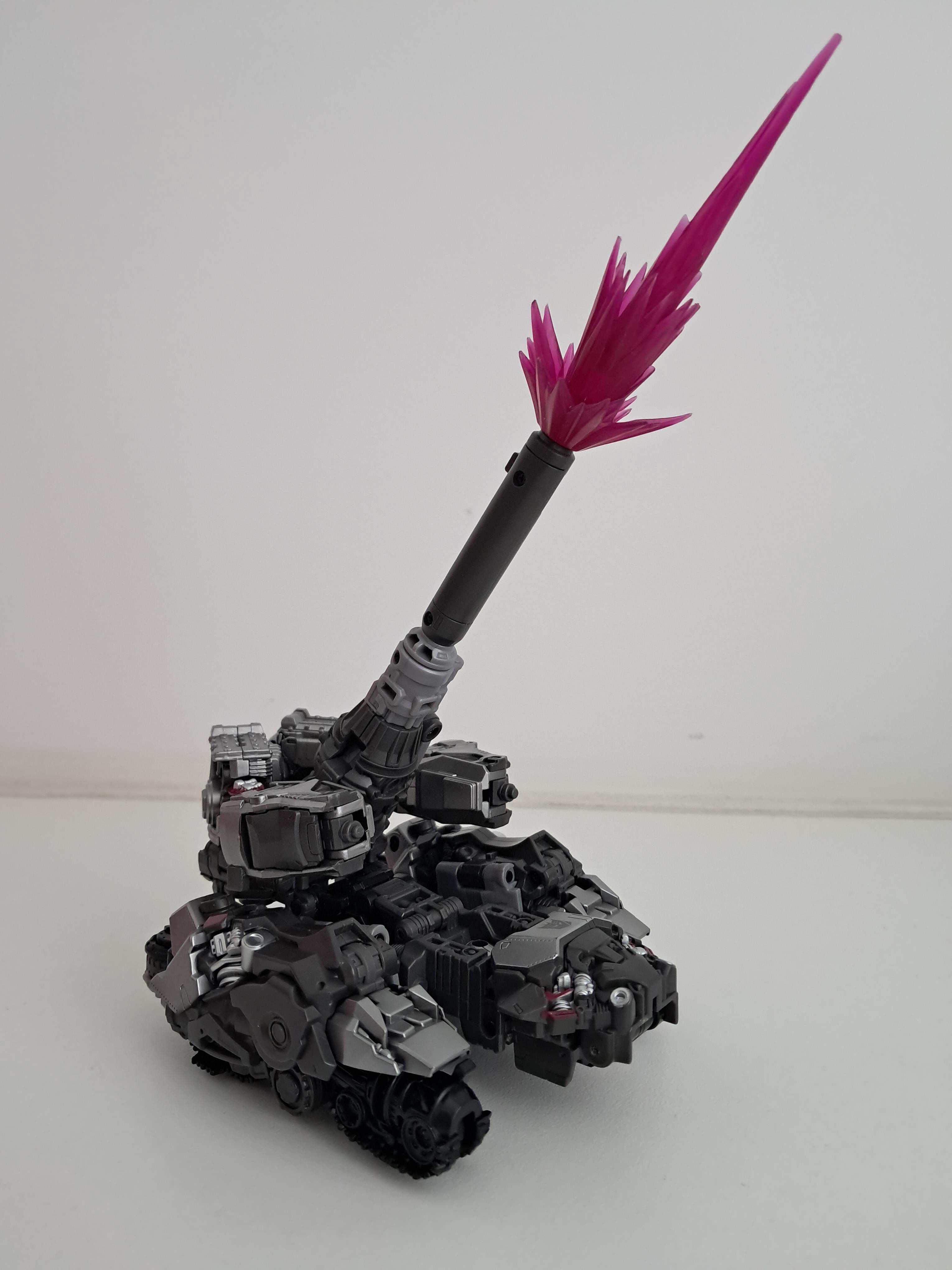 Laten we qua alt-modes maar even starten met de beste alt-mode, de tank. Wat er vooral op neerkomt dat Megatron zijn benen om zich heen vouwt, zijn armen een beetje knikt en zijn borstkas als een broodtrommel voor zich houdt. Je komt er achter dat Megatron eigenlijk gewoon geen onderdelen van hem gebruikt om een tank te zijn, op wat rupsbandjes na.