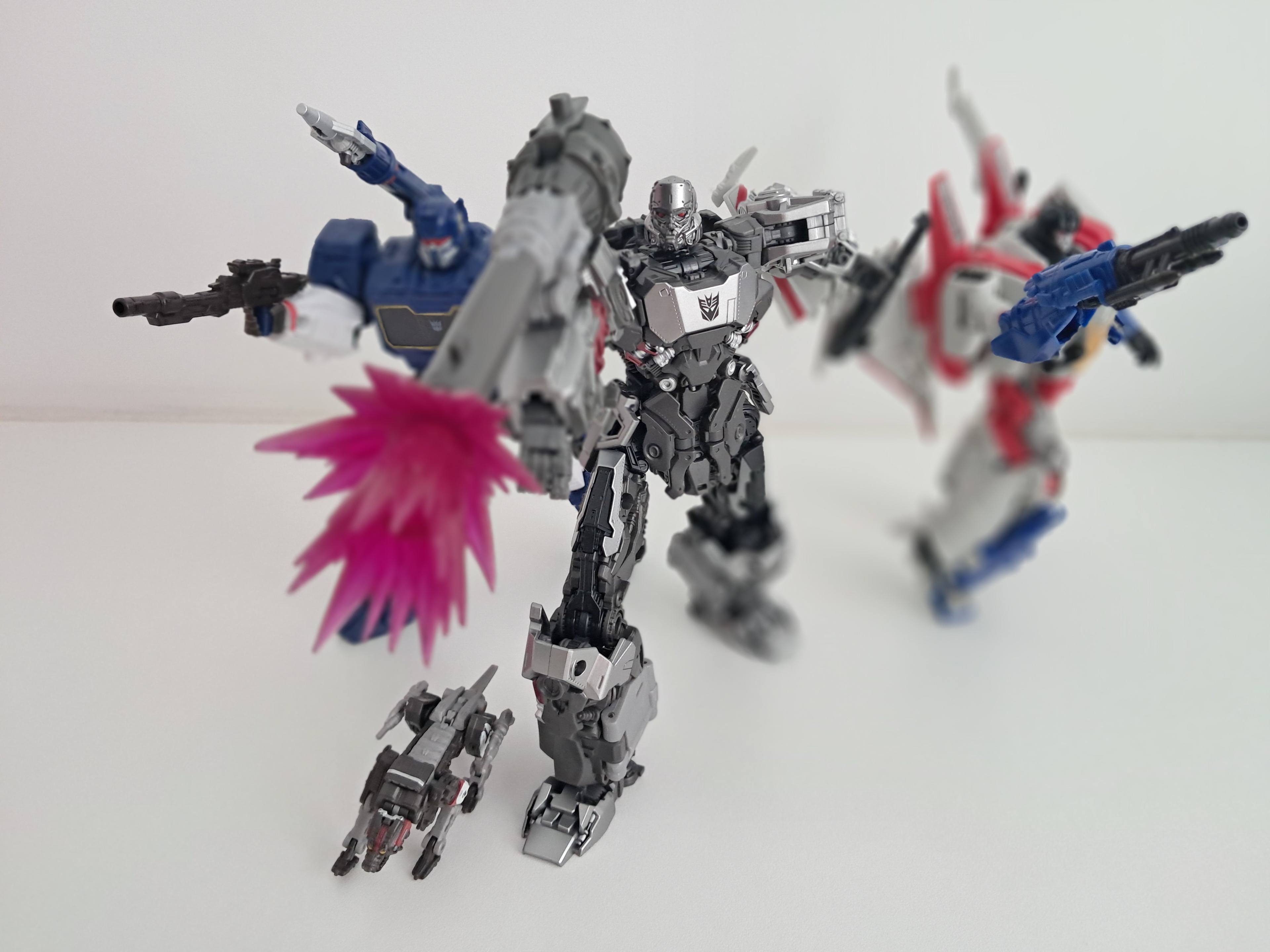 Maar Soundwave komt wel met een borstkas die open kan. En hij blijft in elkaar zitten. Hij doet dingen. Megatron… tja, het geschut kan ronddraaien. Dat was het eigenlijk. Je kan er nog wat blast effecten bij doen als je die toevallig heb, zodat hij nog een beetje aanvoelt als artillerie. Maar dat hadden ze eigenlijk gewoon bij het figuur moeten toevoegen voor deze prijs.