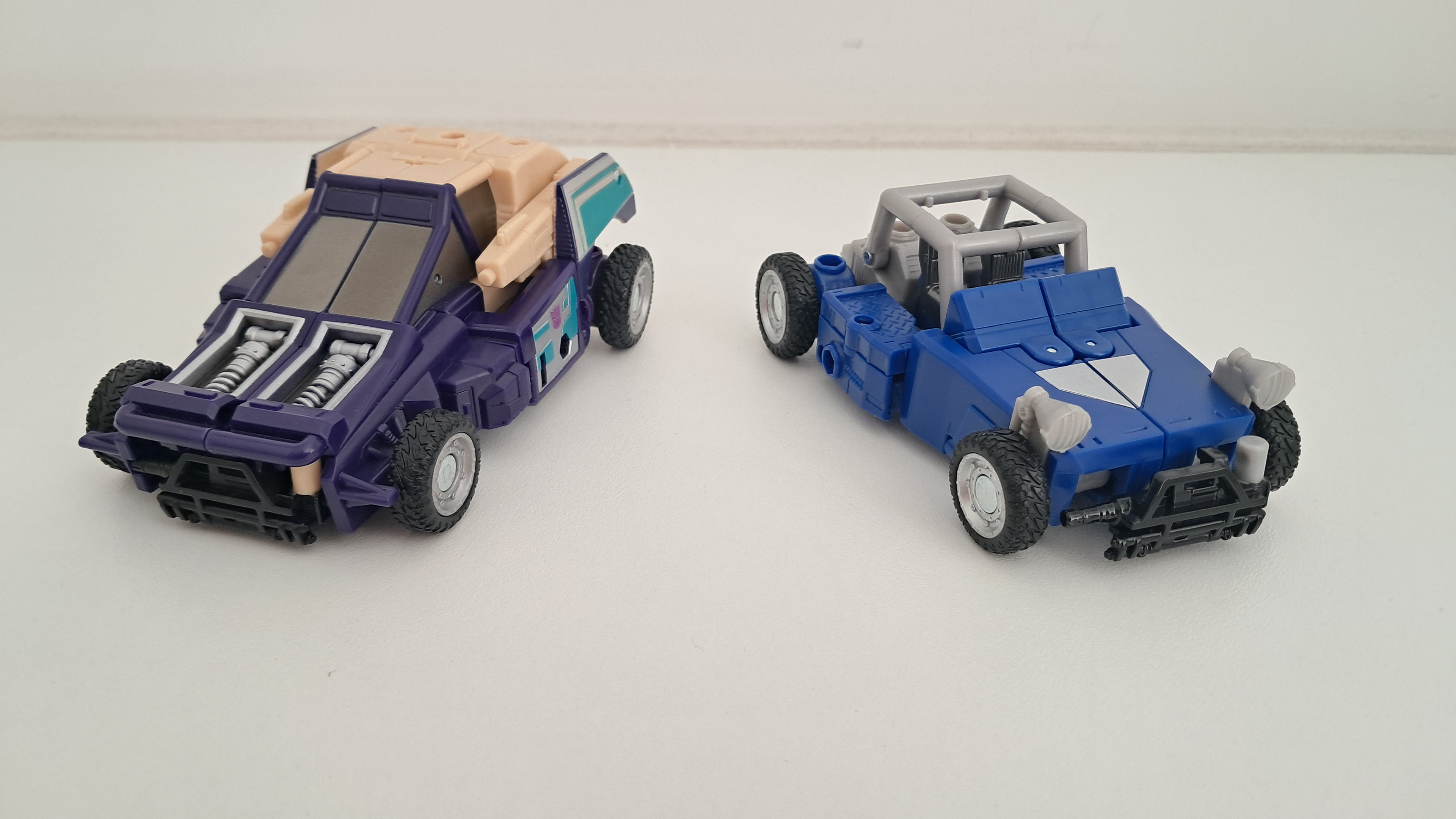 Transformeer hem naar een buggy en het is allereerst opvallend dat hij even lang dan is als Beachcomber. Je ziet wel duidelijk dat hij meer massa heeft maar evengoed is het opvallend. Wat wel minder is, is dat de transformatie neerkomt op veel proppen. Je moet de handen in de perfecte positie hebben, anders valt de boel niet in plaats. Zit alles echter opgepropt, dan voelt hij ook zeer solide, maar op weg daarnaartoe zet je wel veel stress op de pegs.