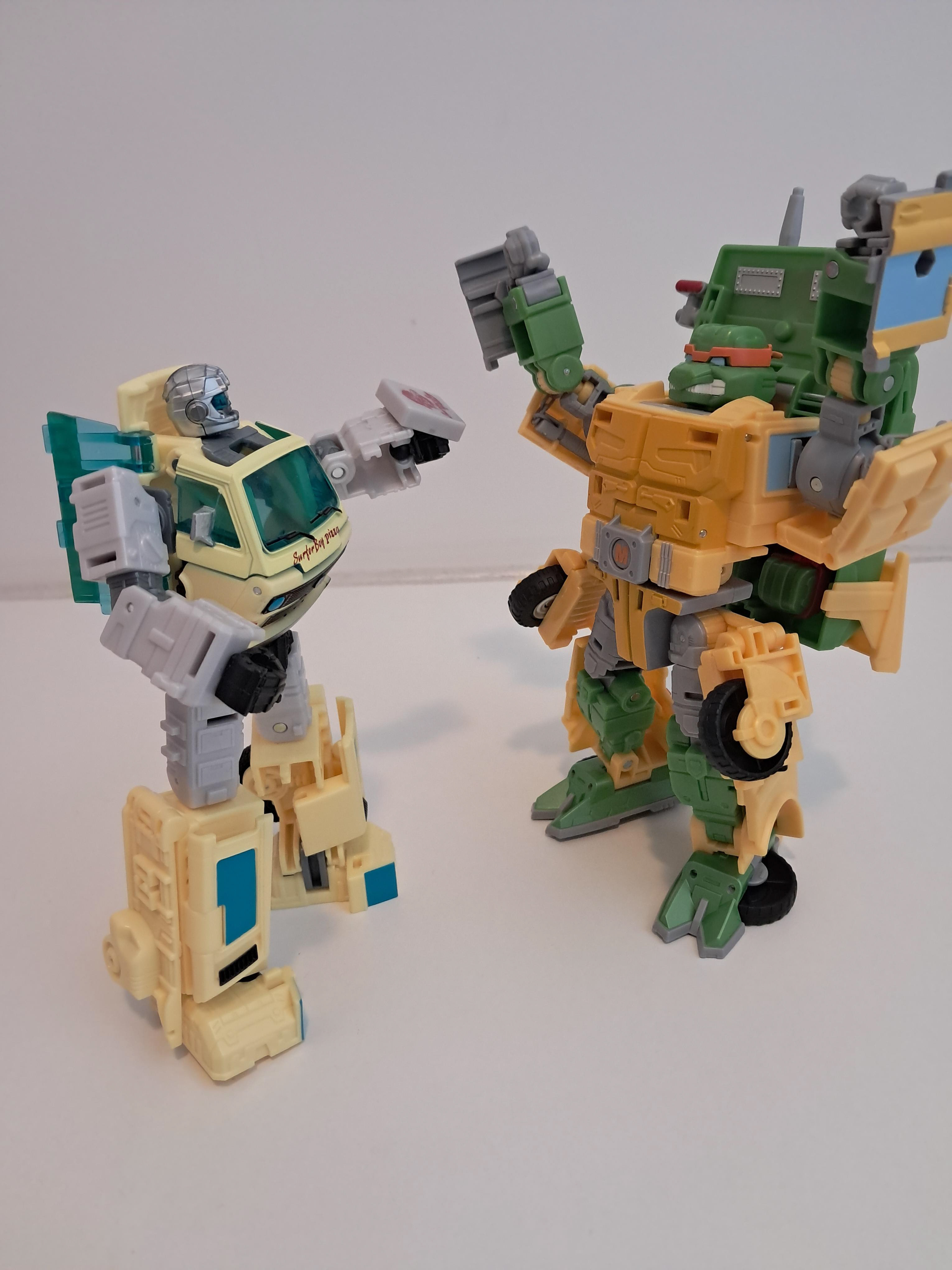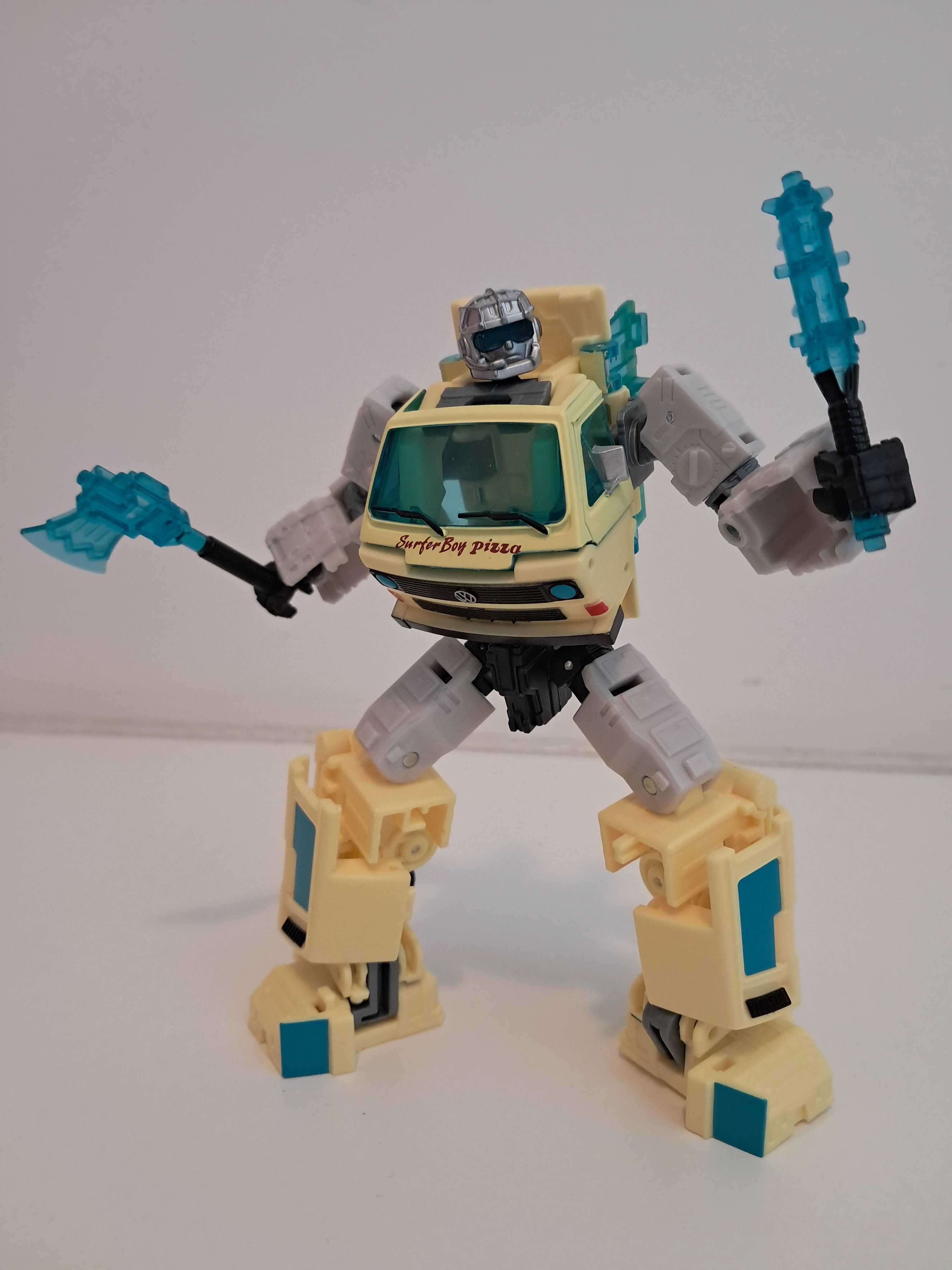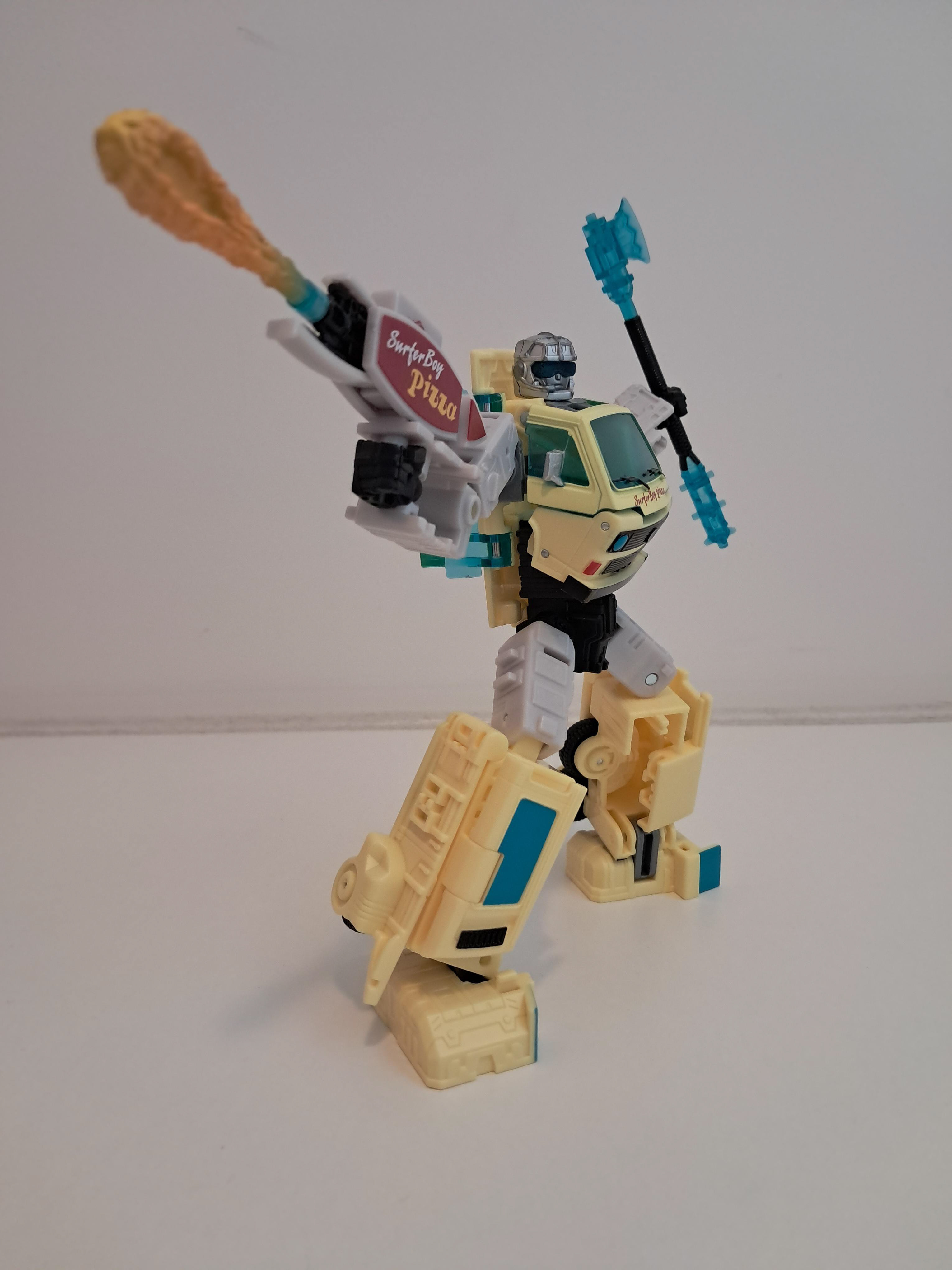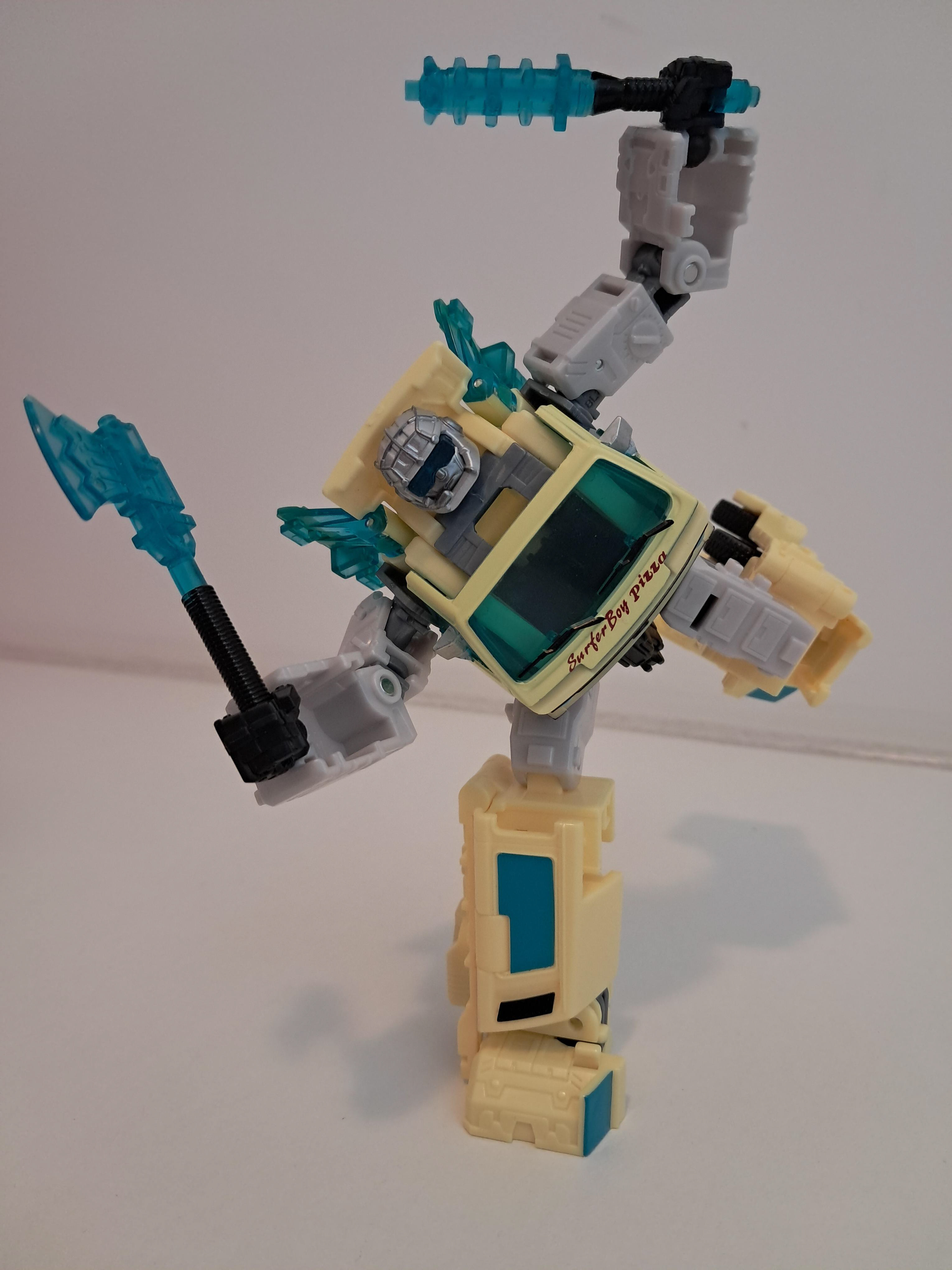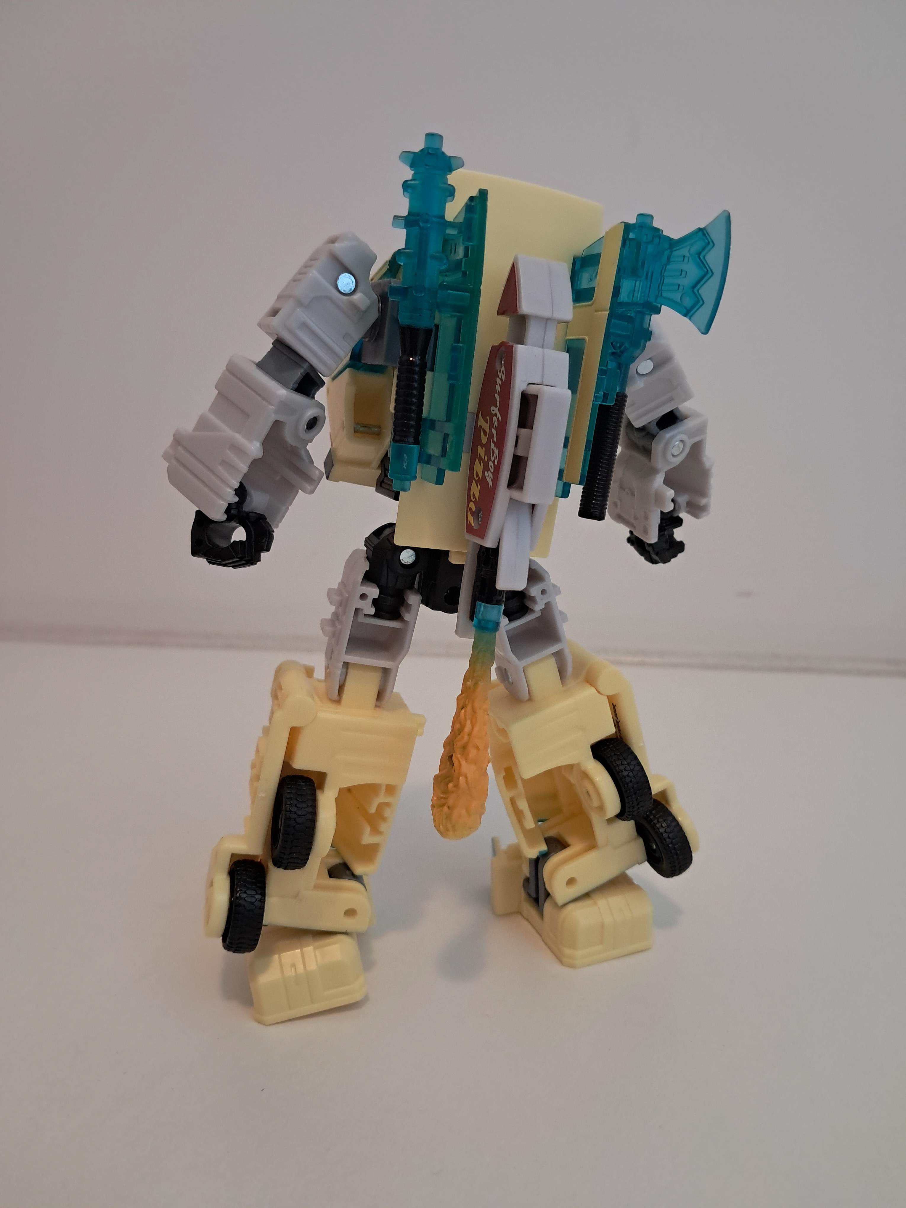 Wat wel vet is, is dat je de bijl en de knuppel kan combineren tot 1 wapen, welk er stukken beter er uit ziet. Al zit ik mij eigenlijk nu wel af te vragen of hij nu Autobot of Decepticon is, wat een fractie logo is nergens te bekennen. Of hij is gewoon neutraal en levert pizza en wie er maar wilt hebben.