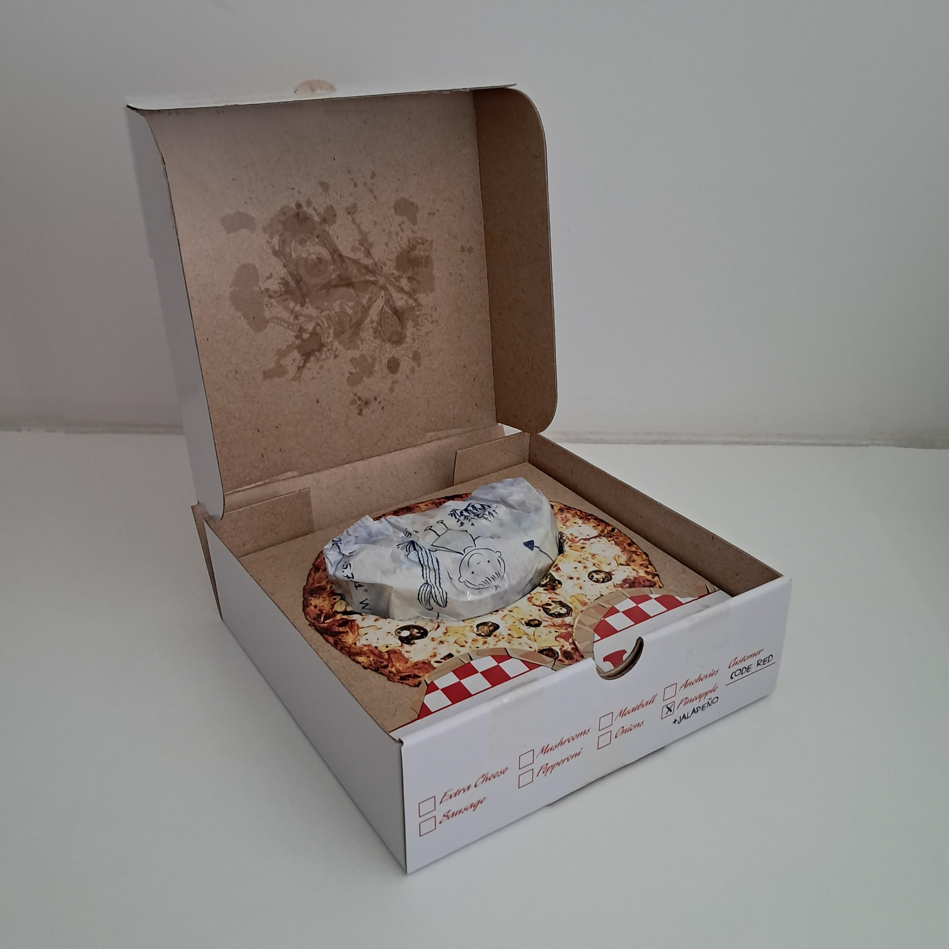 Wel tof is dat hij dus er nog een pizza doosje bij krijgt, om zelf pizza uit te delen. Al moet je wel heel erg frutten voordat het in een hand past.
