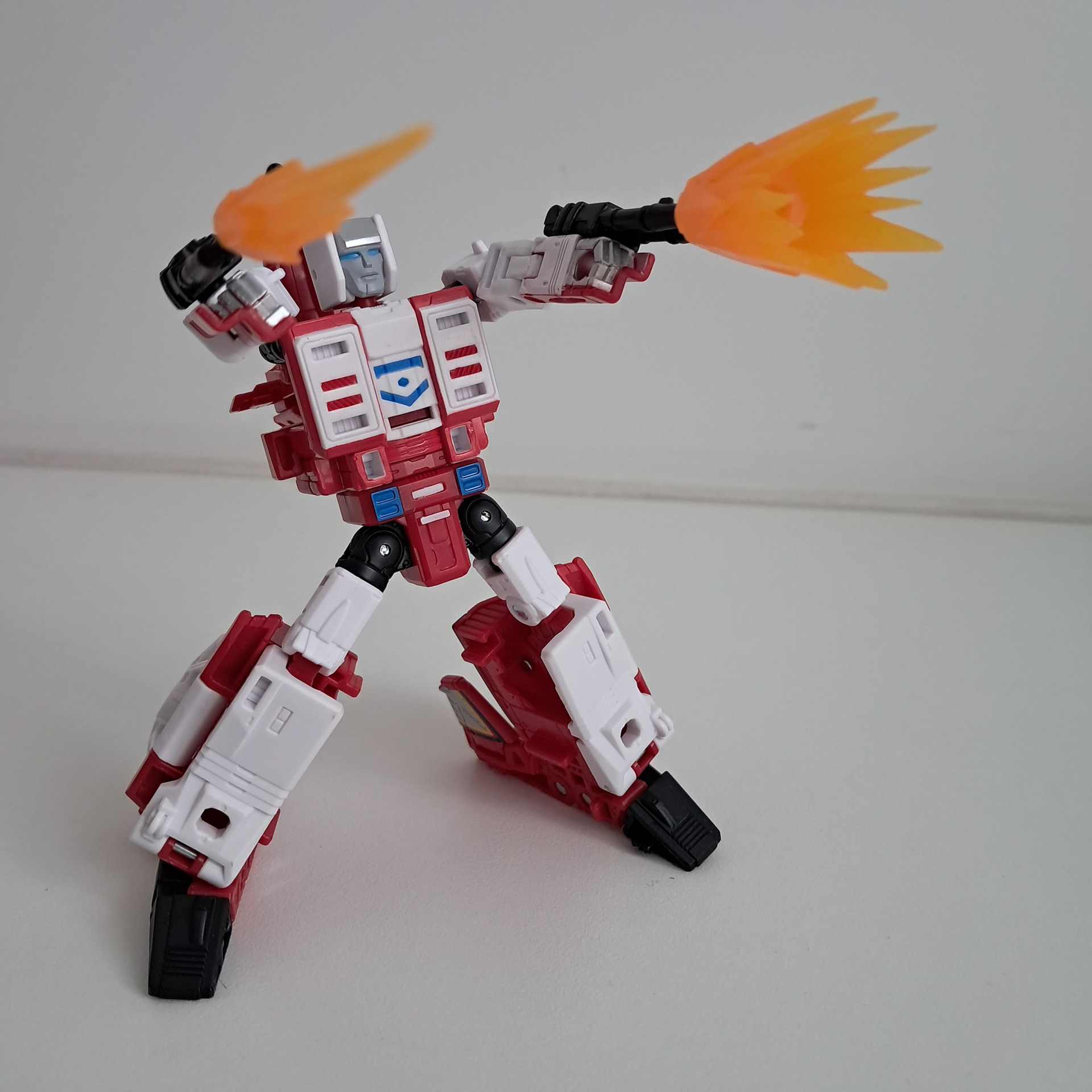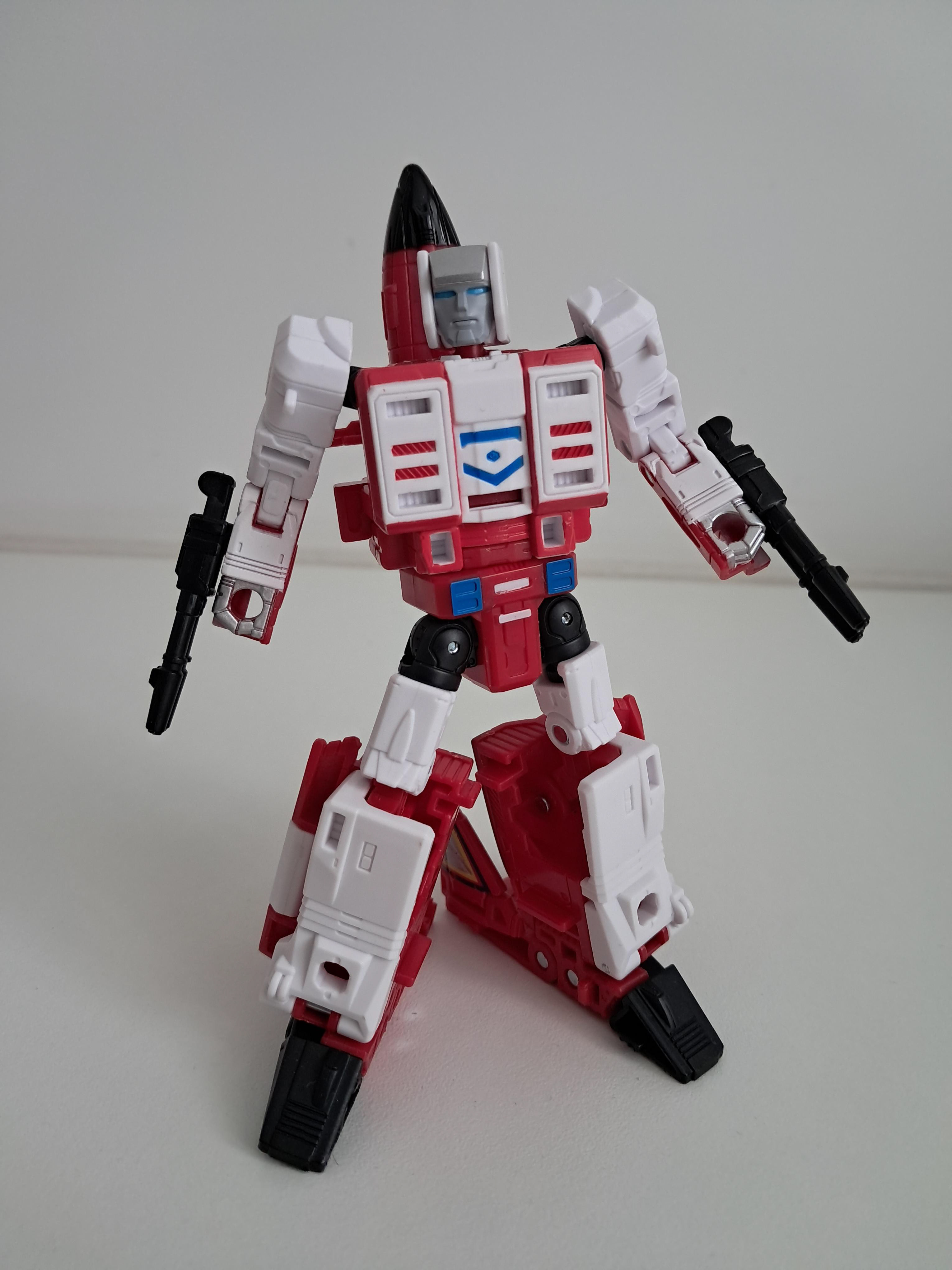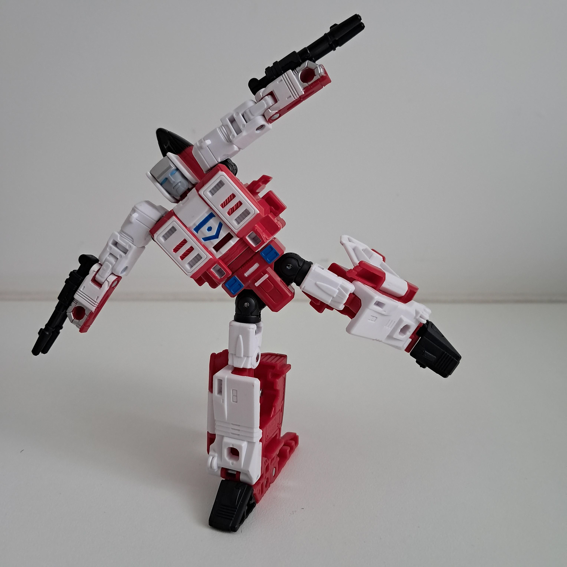 Maar Fireflight doet iets unieks. Hij heeft in de basis dezelfde mold als Slingshot. Maar als robot... lijkt hij precies op Air Raid. Geen wonder dat iedereen vergeet dat hij überhaupt bestaat. Recht van voren heeft hij precies dezelfde kleur verdeling als Air Raid, met wat blauwe accentjes die compleet verzuipen in de zee van wit en rood. De achterkant moet dan wat rood toevoegen, maar het valt allemaal niet genoeg op.