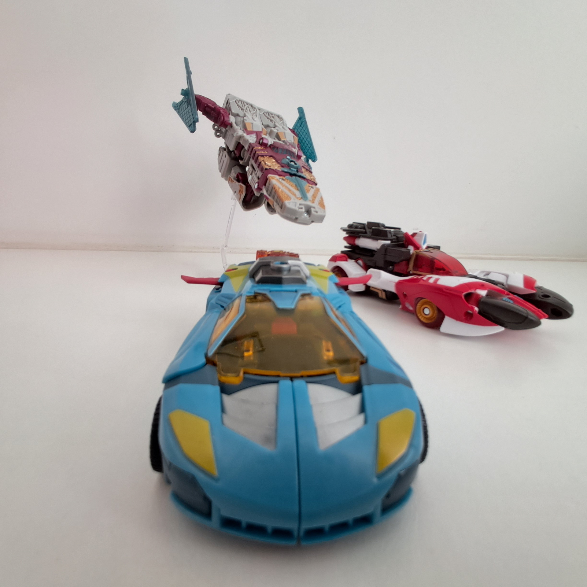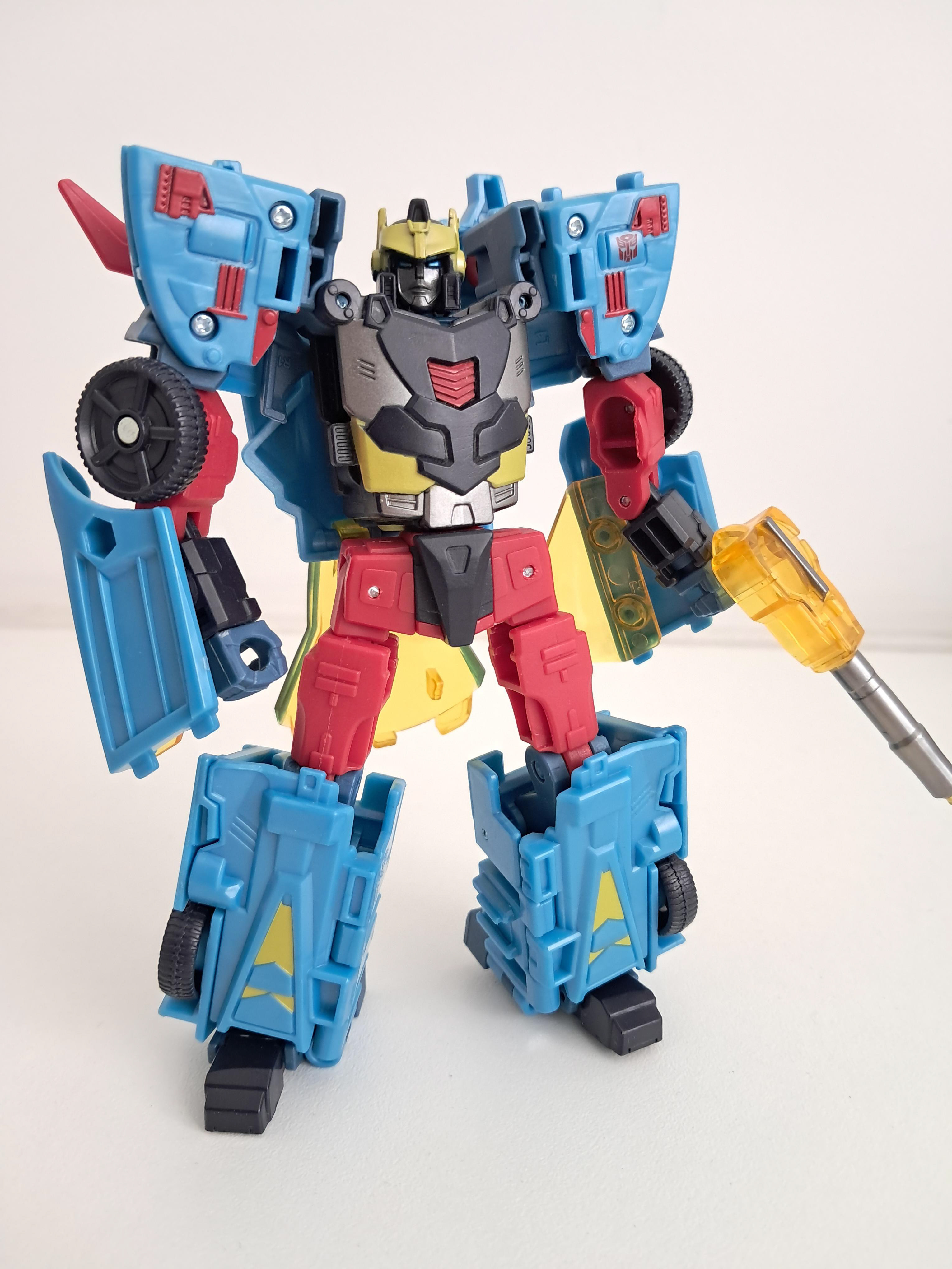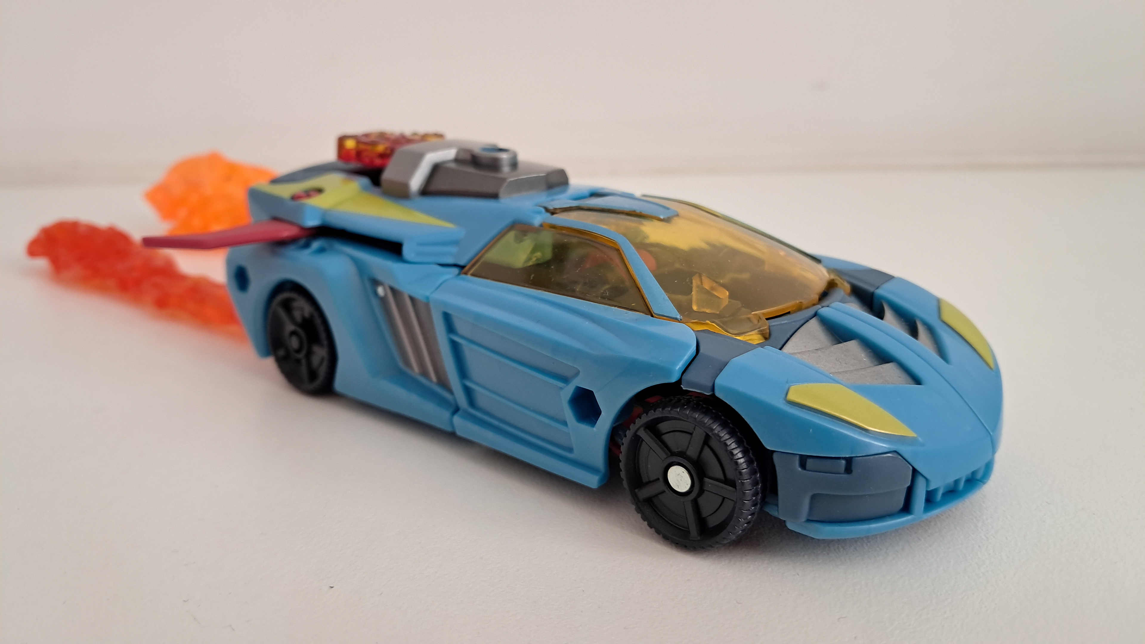 Wat wel gek is, is dat maar 2 van zijn wielen zijn vastgepind. En ik mis wel de ingemolde stoelen van het origineel, en de geverfde wieldoppen. Maar voor een deluxe is dit wel een flinke jongen. Zo groot, dat hij er echt uit steekt tussen de andere deluxe figuren die simpelweg een sportwagen worden.