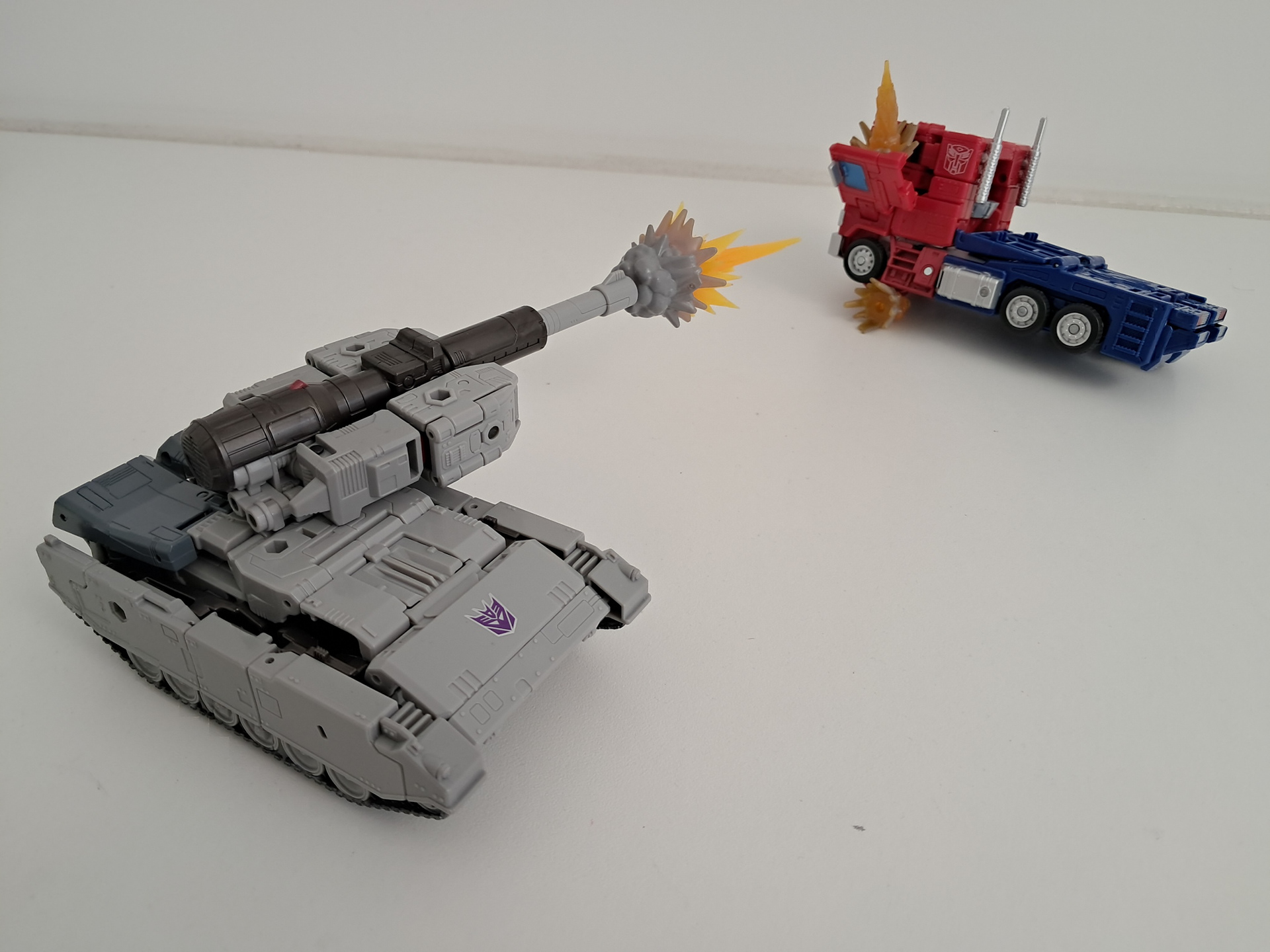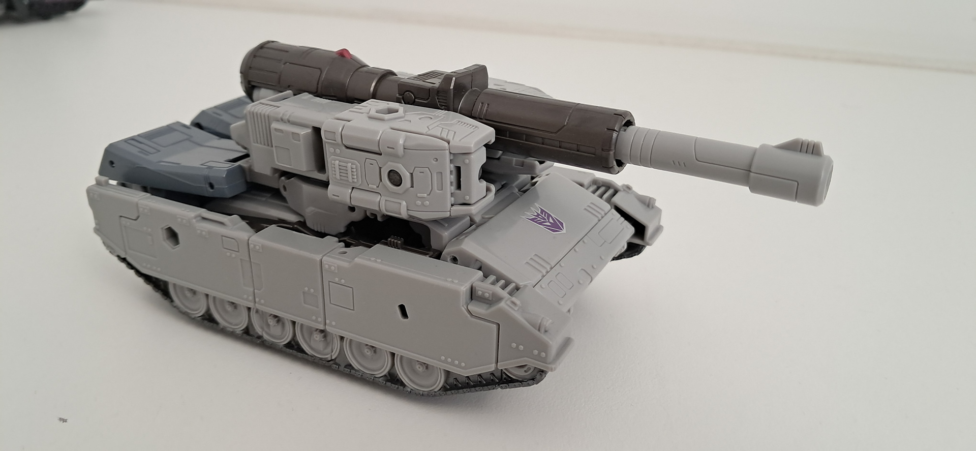 En dat is het eigenlijk met deze Megatron, in alt-mode is hij eigenlijk heel goed in dat hele 'decepticon' gedoe. Hij is vooral bescheiden. Hij is geen halve krab, geen ruimte ding, geen rondrijdend aubergineveld, geen rode accenten, want hij is een tank. Een voertuig gemaakt om binnen te komen zonder te kloppen en in staat om het uitzicht naar eigen inzien aan te passen. Het heeft geen opsmuk nodig, het is simpelweg gemaakt om iemands dag een heel stuk slechter te maken. En dat is toch een samenvatting van wat Megatron is.