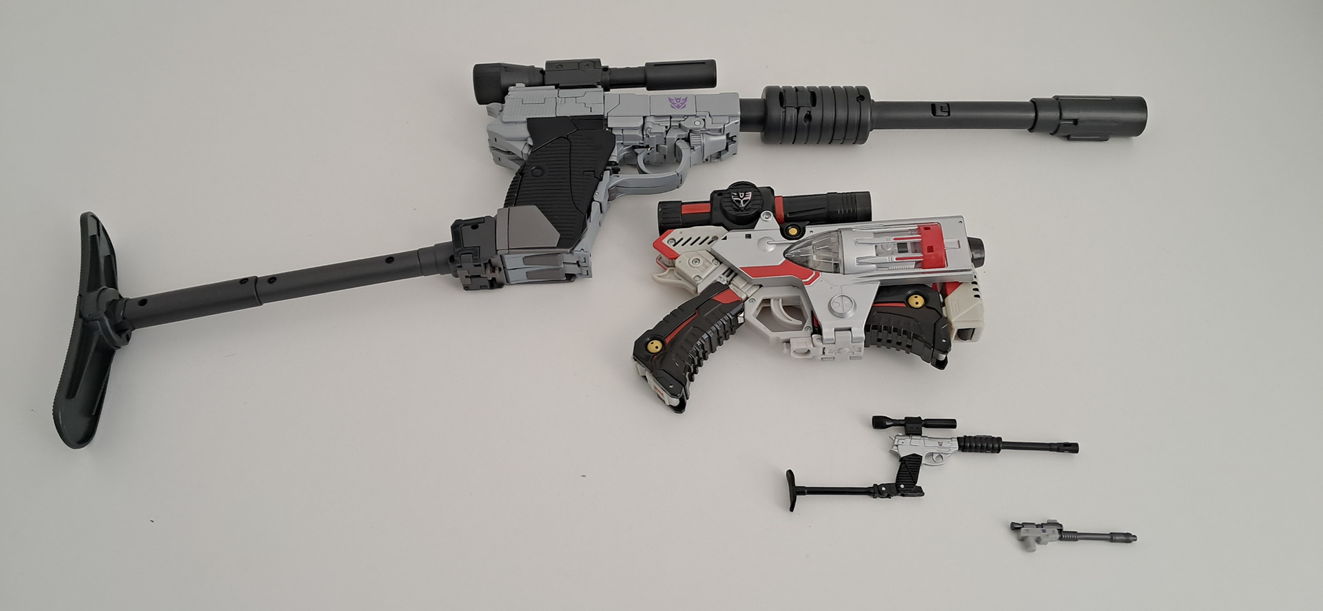 En dan het pistool. En tja, ik draai er inderdaad er omheen, maar jullie weten ook wel dat deze Megatron zelf geen pistool wordt. Het zit er gewoon tegenwoordig niet meer in, Hasbro zal simpelweg nooit een realistische gun maken. En ik moet zeggen dat ik deze oplossing zeer waardeer. Door ons een klein pistooltje te geven kan ik nog steeds spelen dat Megatron in een klein pistooltje veranderd, zonder dat ik zelf met een pistooltje speel. Ik hoef geen role playing prop, ik wil gewoon dat Starscream een Megatron als pistool kan vasthouden.