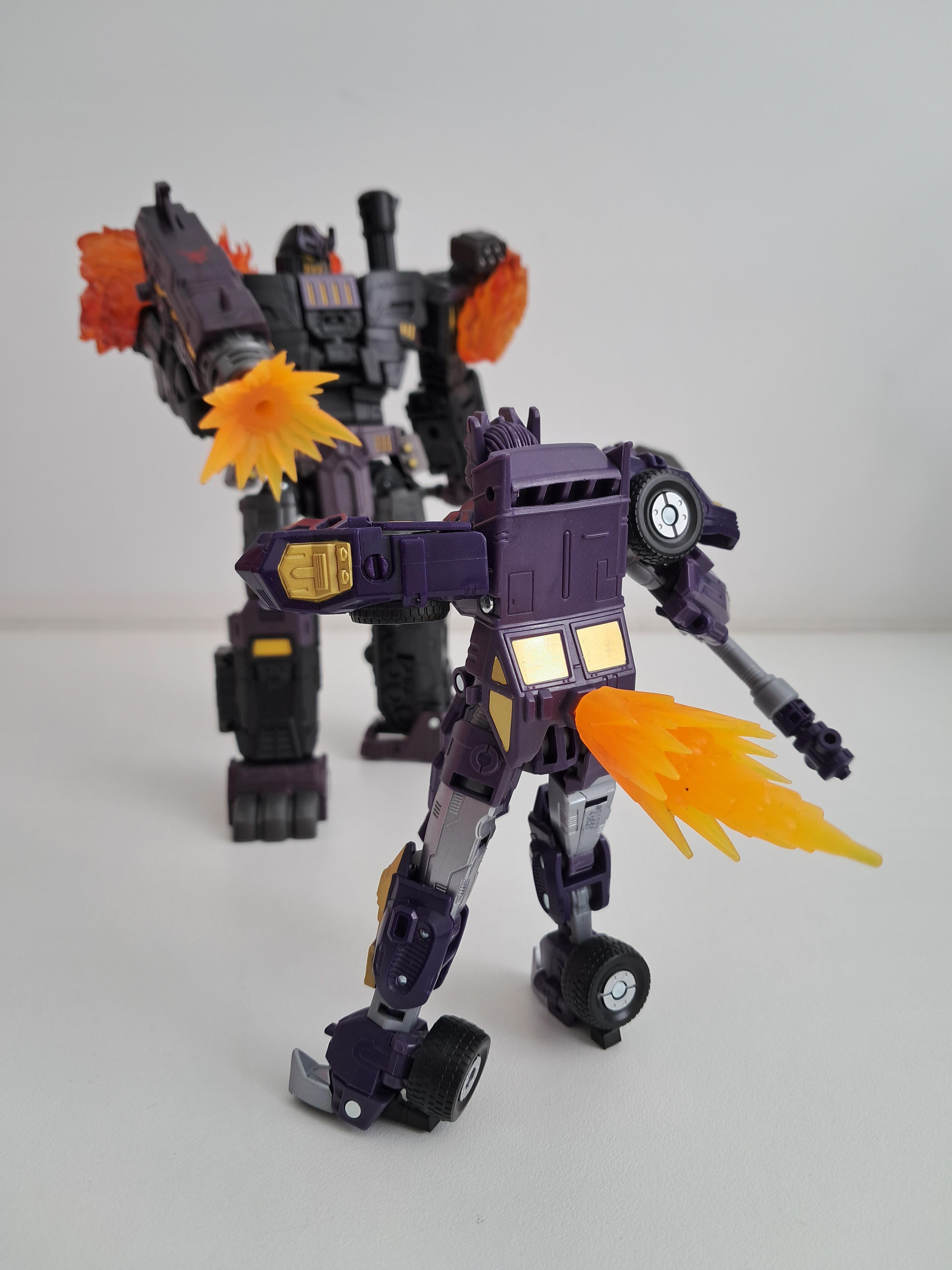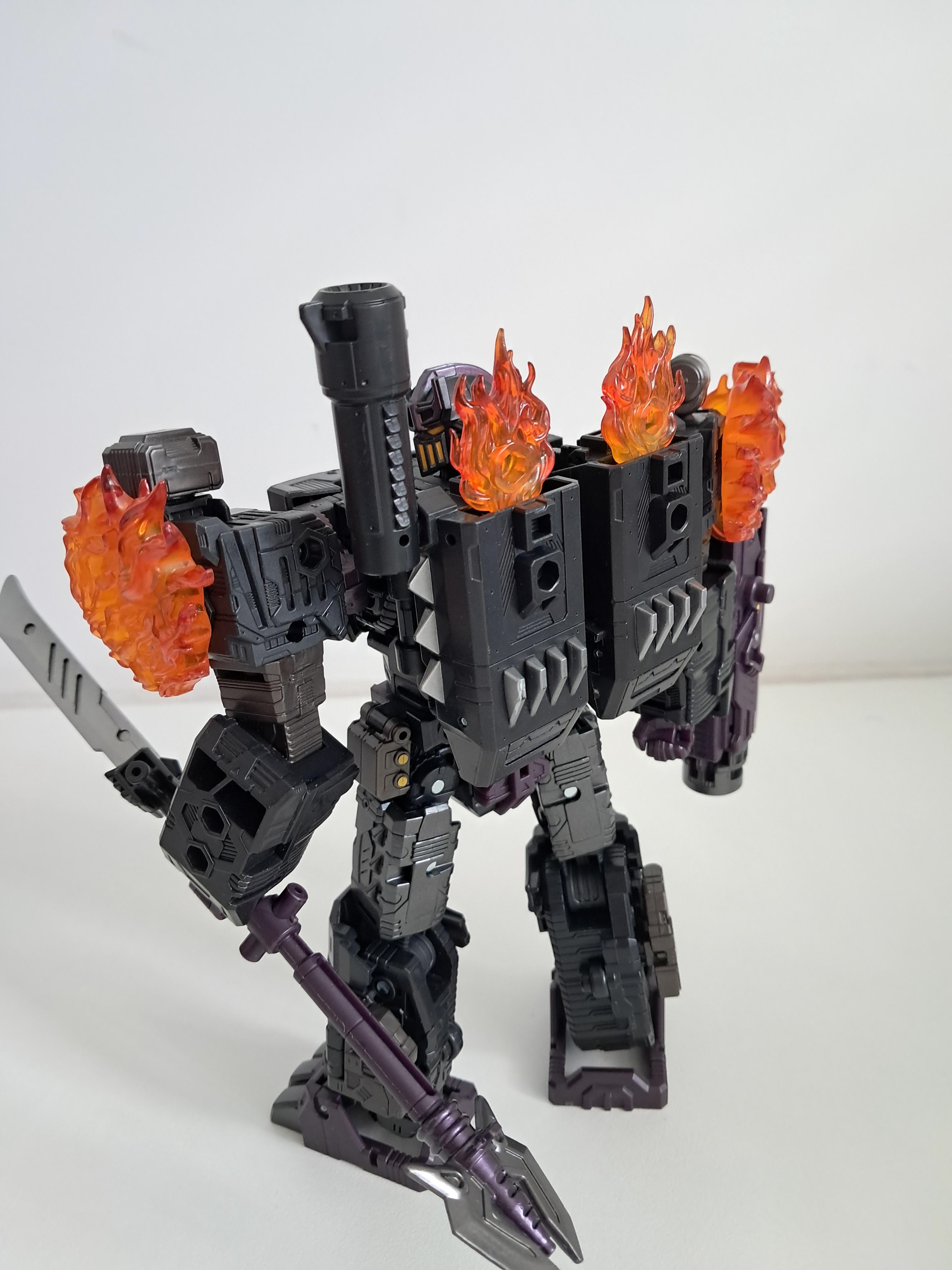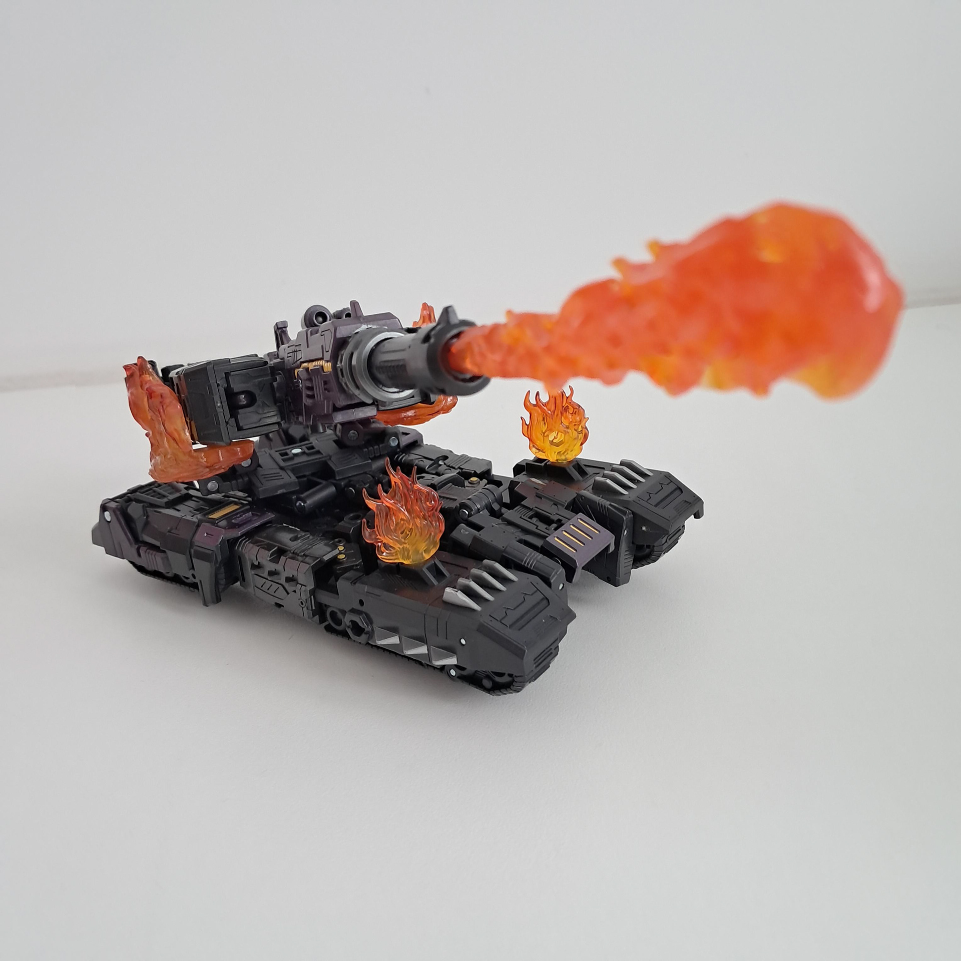 De vlam-effecten zijn een heel goed uitgevoerde extra. Ze bestaan uit twee kleuren, wat voor blast-effect achtige gevallen al een hele luxe is. Maar ze versterken het hele figuur. Megatronus is zonder die vlam effecten al een bad-ass, met al die oplichtende ventilatie roosters, maar het geeft hem nog meer de vibe van een Transformer Satan uit de hel.