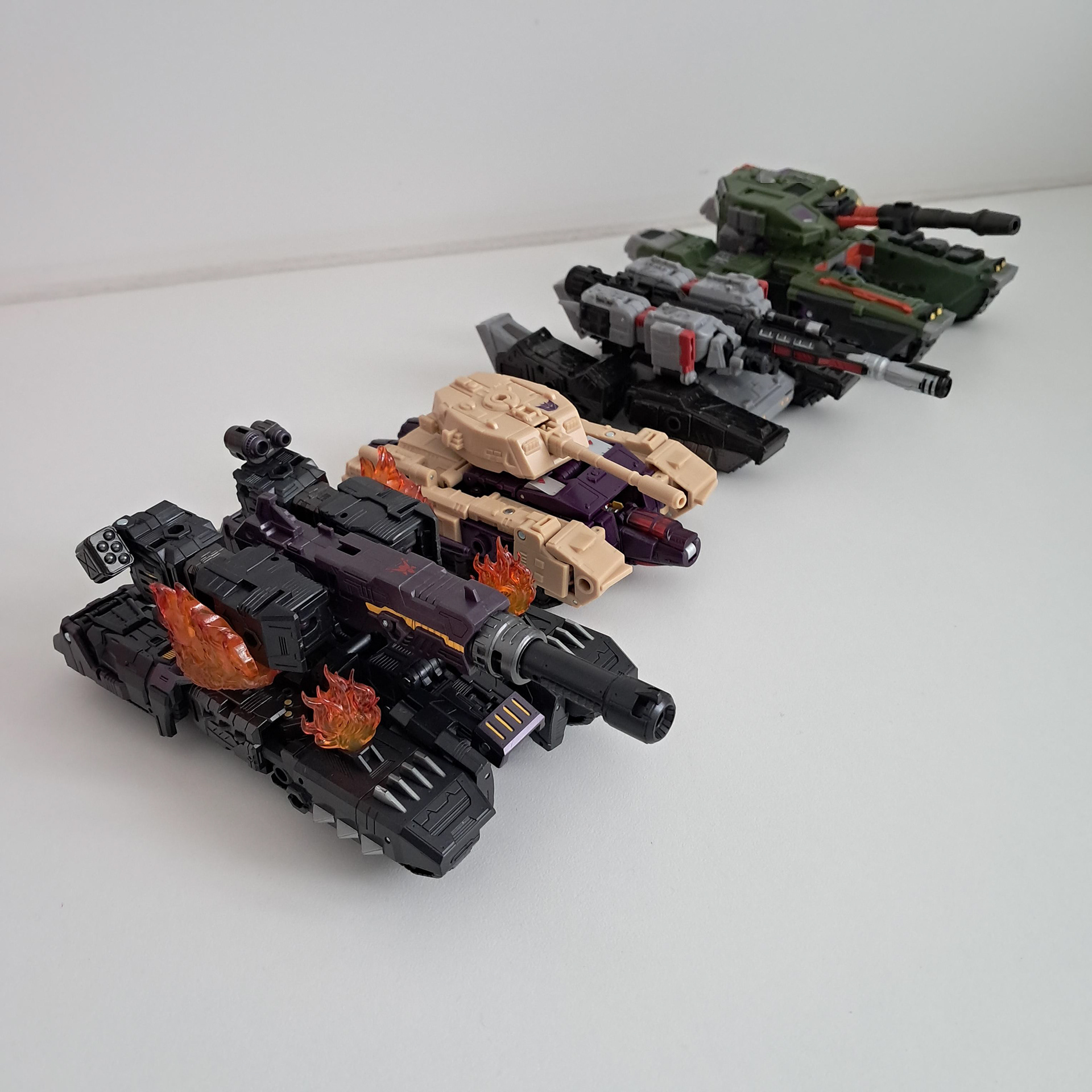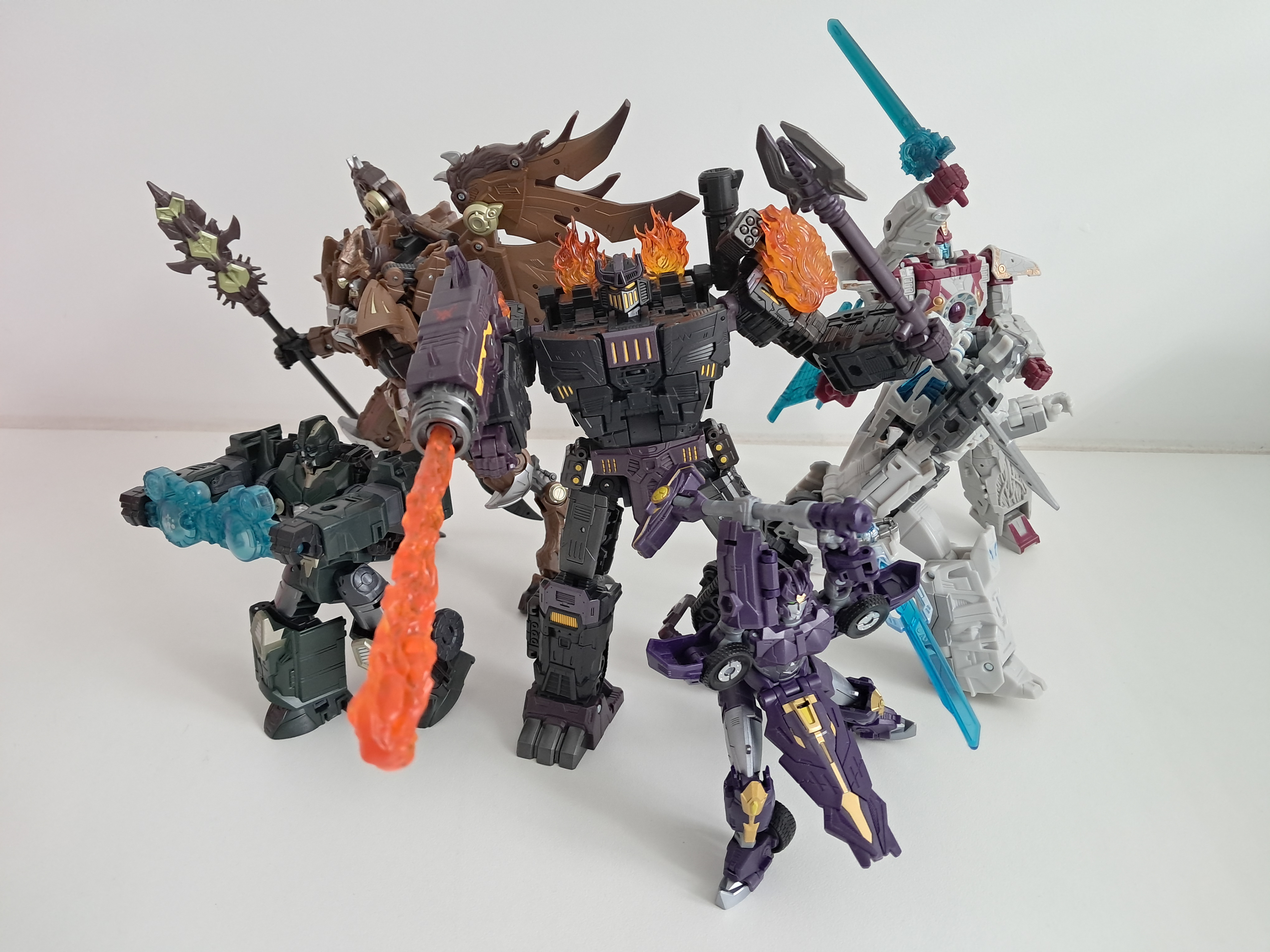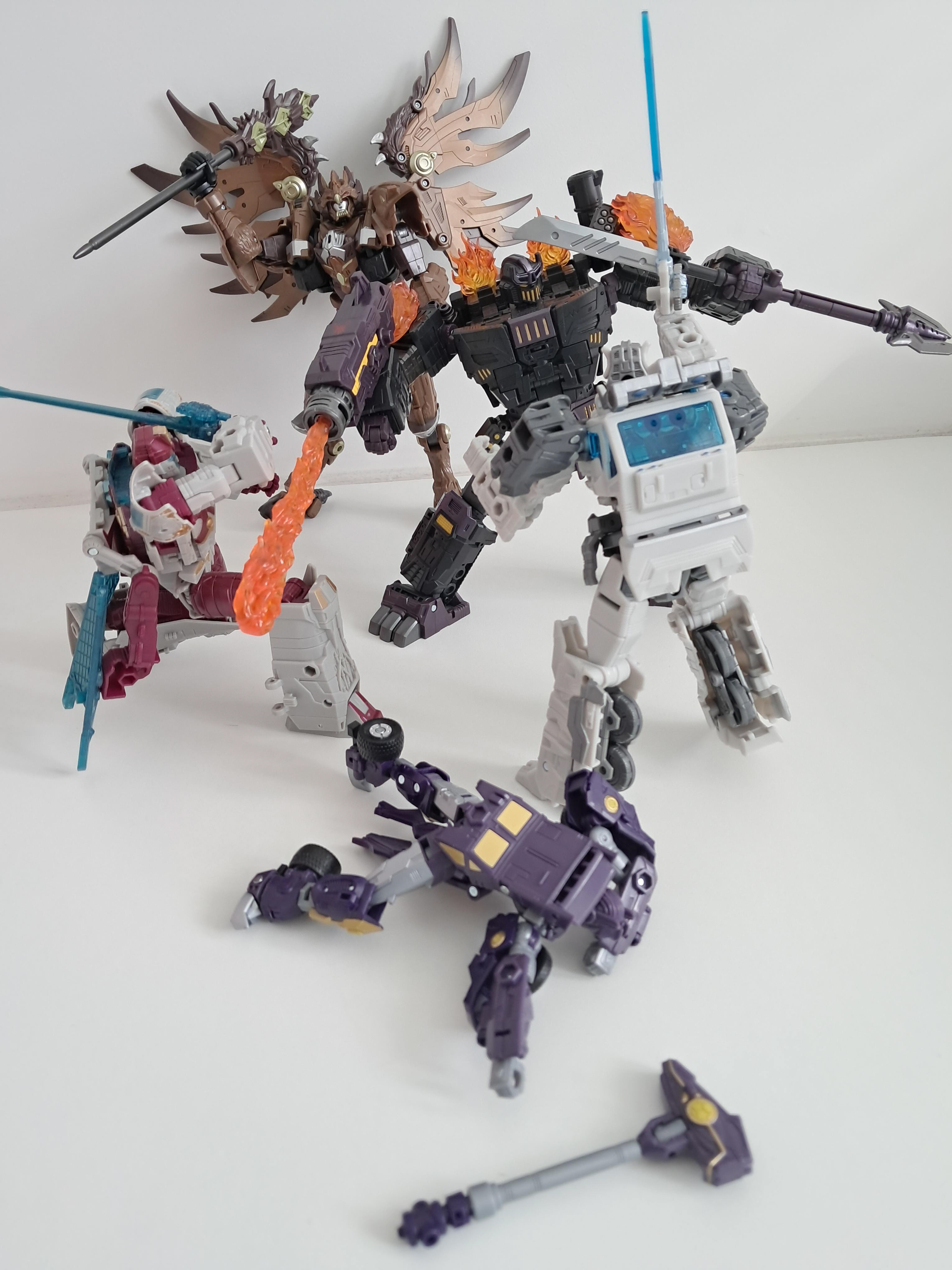 Ik wil ook nog even hier stilstaan bij de Primes bij elkaar als groepje. Ze vormen momenteel een heel mooi plankje in mijn kast, als allegaartje van allerlei verschillende design principes. Dan weer een Unicron-trilogie design, dan weer een Beast Wars, dan weer robot-Satan.... op papier klinkt het echt als een bij elkaar gesodemieterd zooitje. Maar in de praktijk begint het één van mijn mooiste plankjes te worden.
