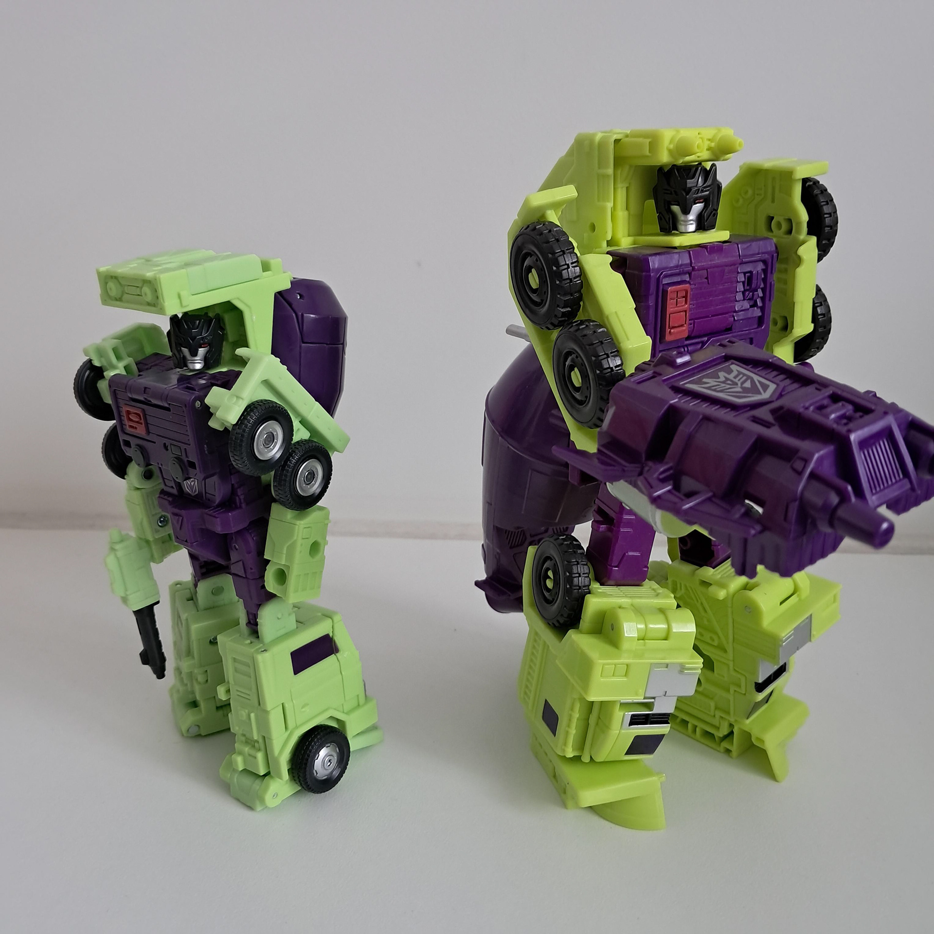 De transformatie is makkelijk maar biedt je ook veel om te doen. Veel meer dan bijvoorbeeld met Scrapper. Je moet immers ook beseffen dat de vrachtwagen cab eigenlijk op 3 plekken terecht moet komen, namelijk voorop de vrachtwagen, op de achterkant van Mixmaster zijn benen,, maar dan weer als de tenen van Devastator. Dankzij knieën die veel kanten op kunnen en plankjes die onverwacht veel doen