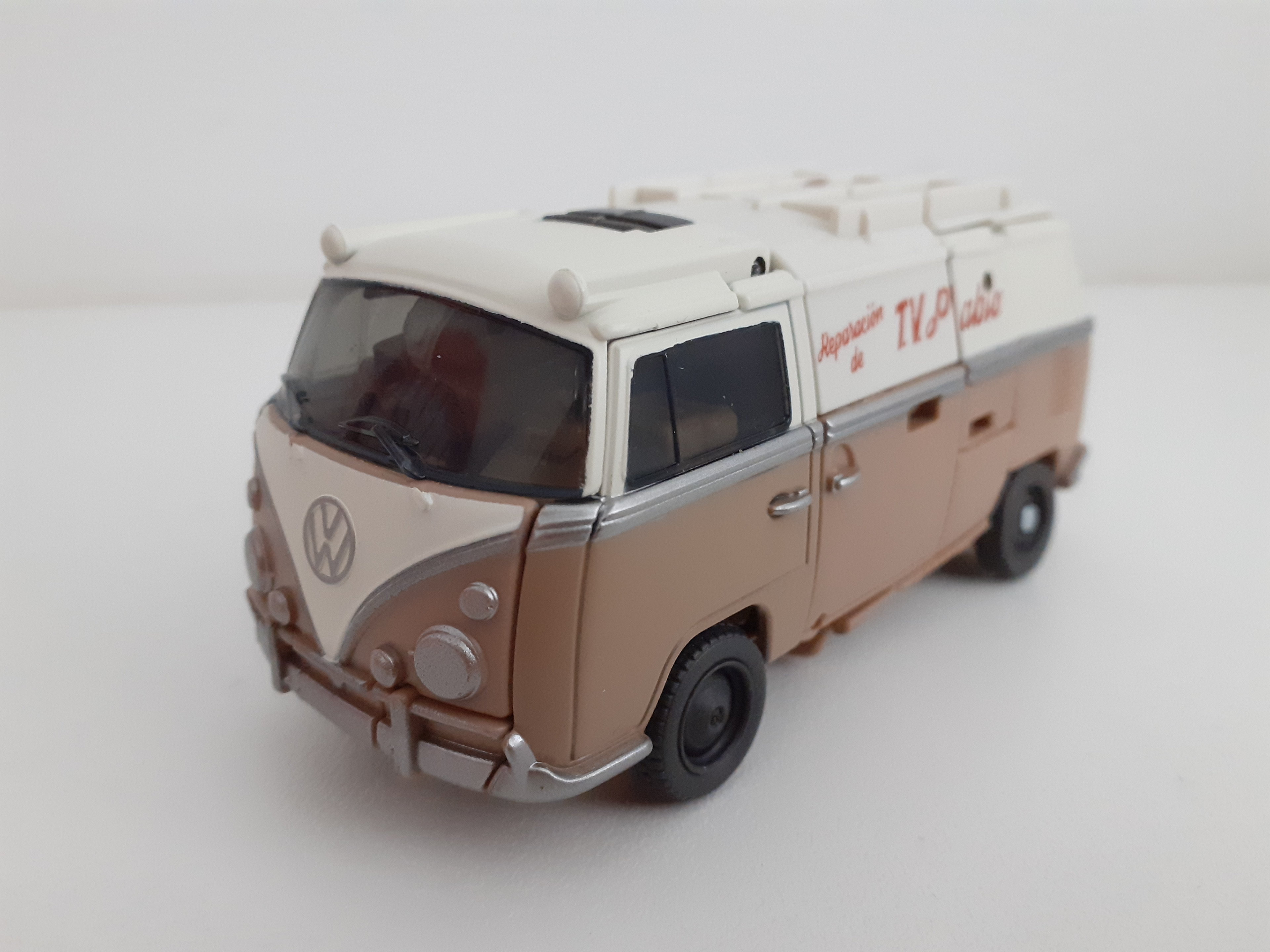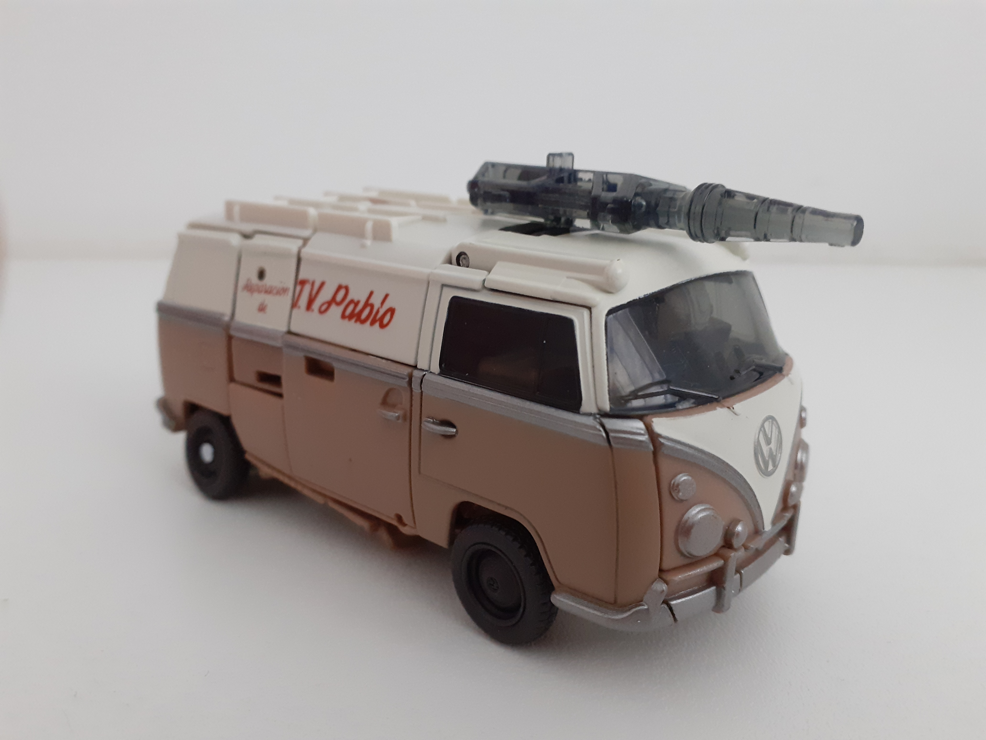 Qua altmode gaat het wat beter. Hij wordt immers een Volkswagenbusje, daar wordt ik al snel blij van. Maar ik mis nogal wat TV Pablo reclame op de zijkanten, van dat hij ook radio's en staafmixers repareert. Wel is het leuk dat je achter de voorruit zijn hoofd kan zien, alsof hij zichzelf rijdt.