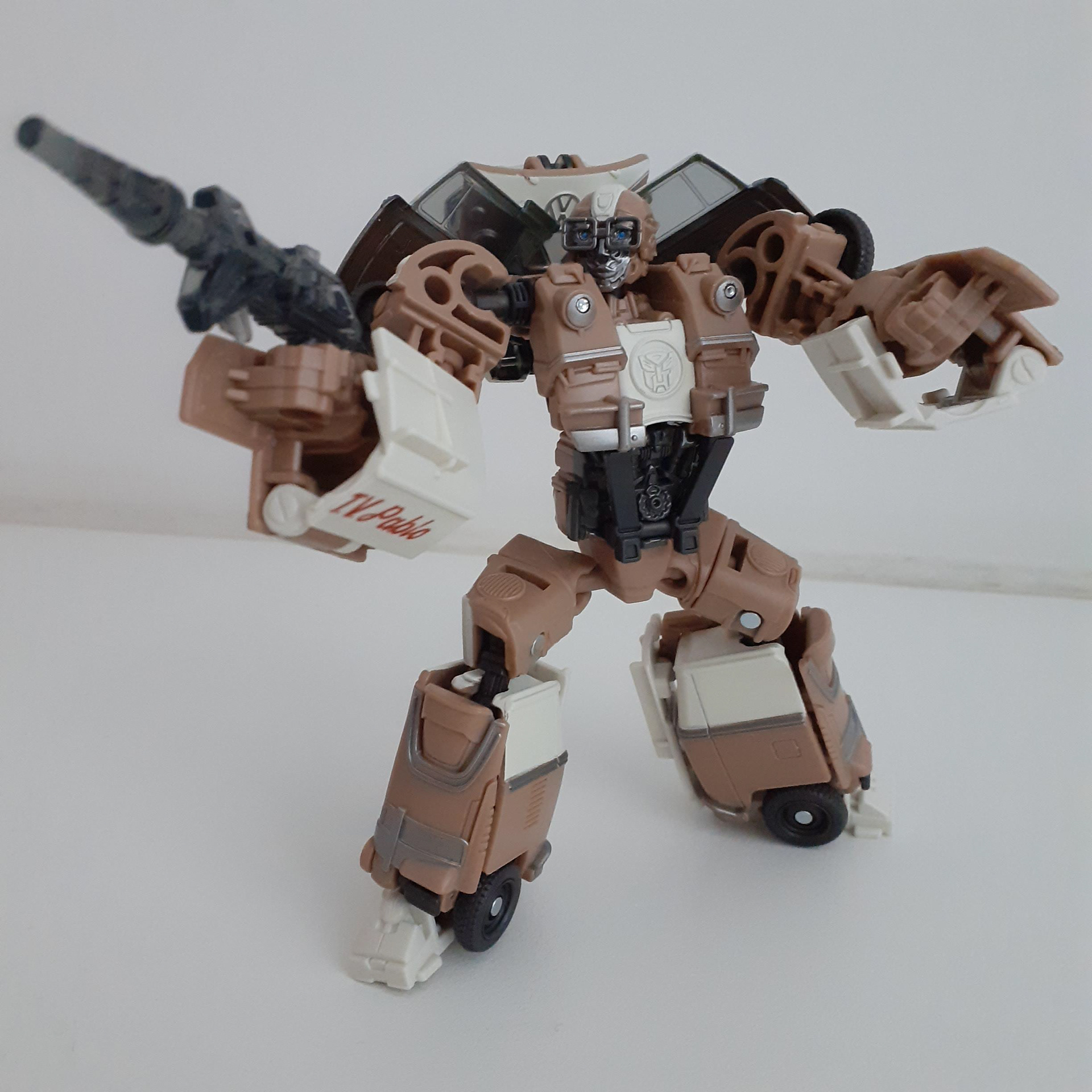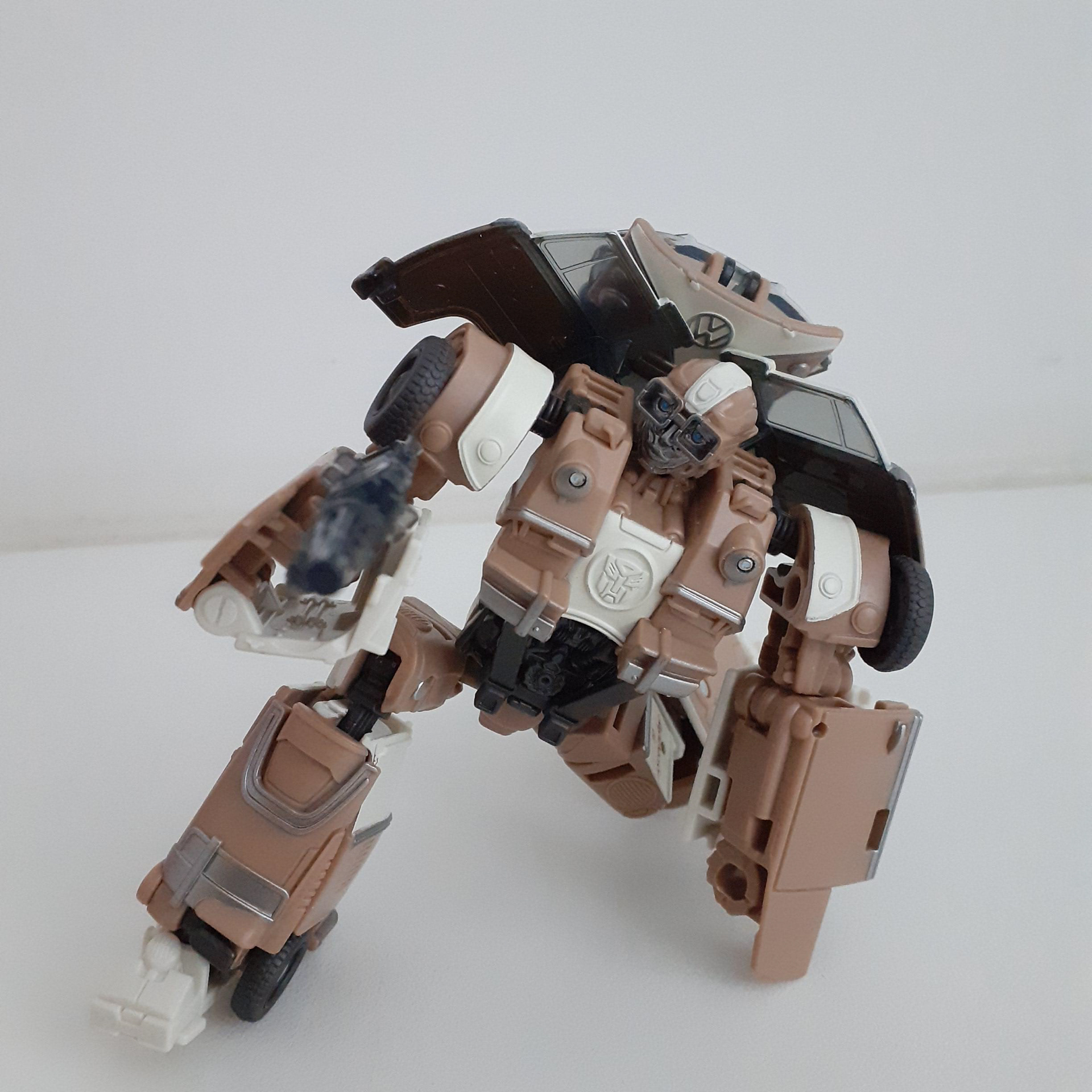 Zijn gun is van doorzichtig plastic, en ziet er totaal niet uit als de gun die hij in de film gebruikte. Het lijkt eerder op de gun van Studio Series Ironhide. De voorkant van de auto, op de rug, hoor je eigenlijk naar beneden te laten hangen maar ik vind het een fijner profiel geven als het hoger op zijn rug zit.