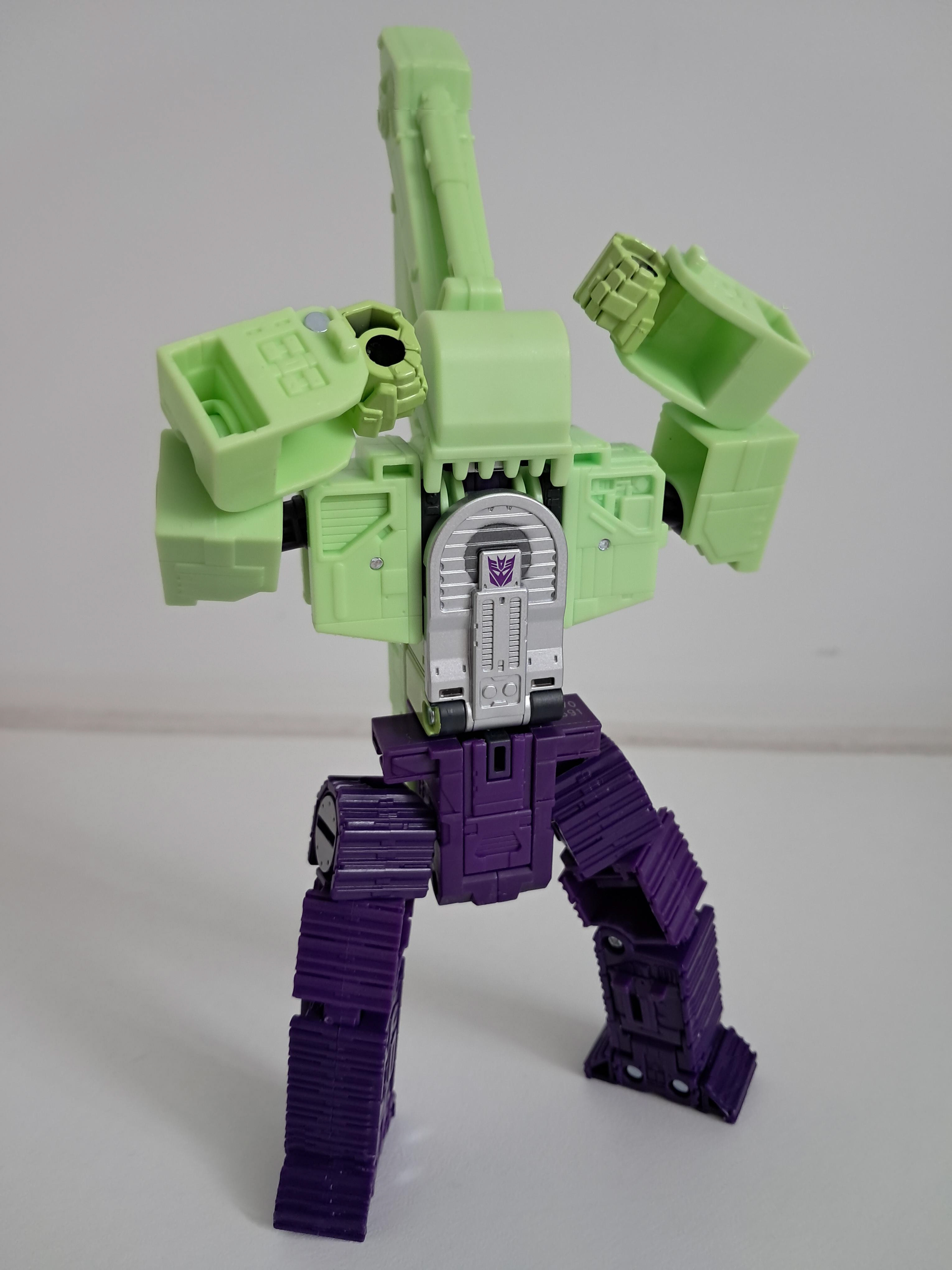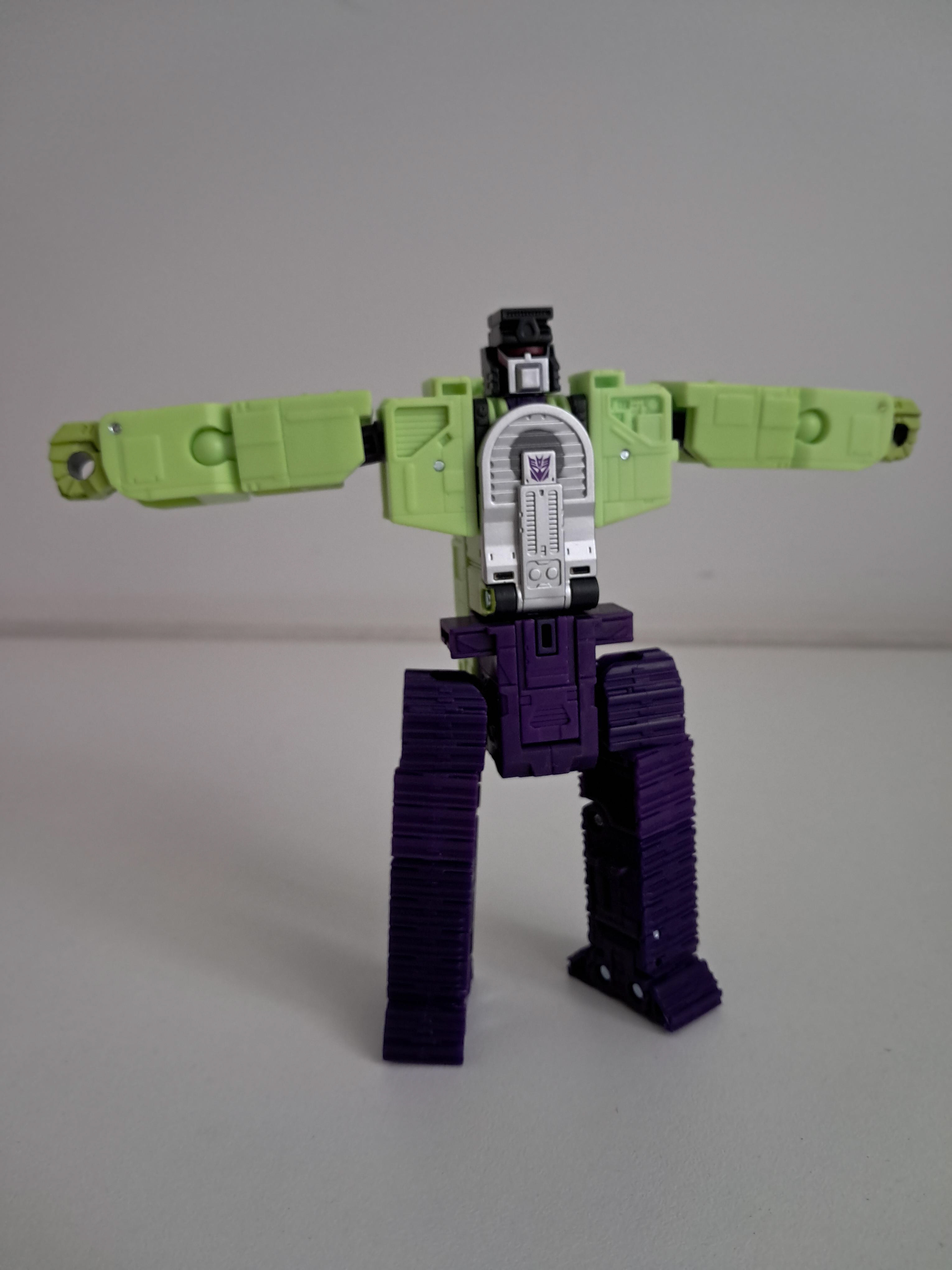 Voor een Deluxe zit hij met vrij veel holtes, juist op de verkeerde plekken. Zijn benen zijn aardig opgevuld, maar omdat het om donkerpaars plastic gaat valt het niet zo op omdat de schaduwen wegvallen. Maar die schaduwen vallen juist erg op bij het lichtgroene plastic van de torso en armen, en juist daar zie je de holtes beter.