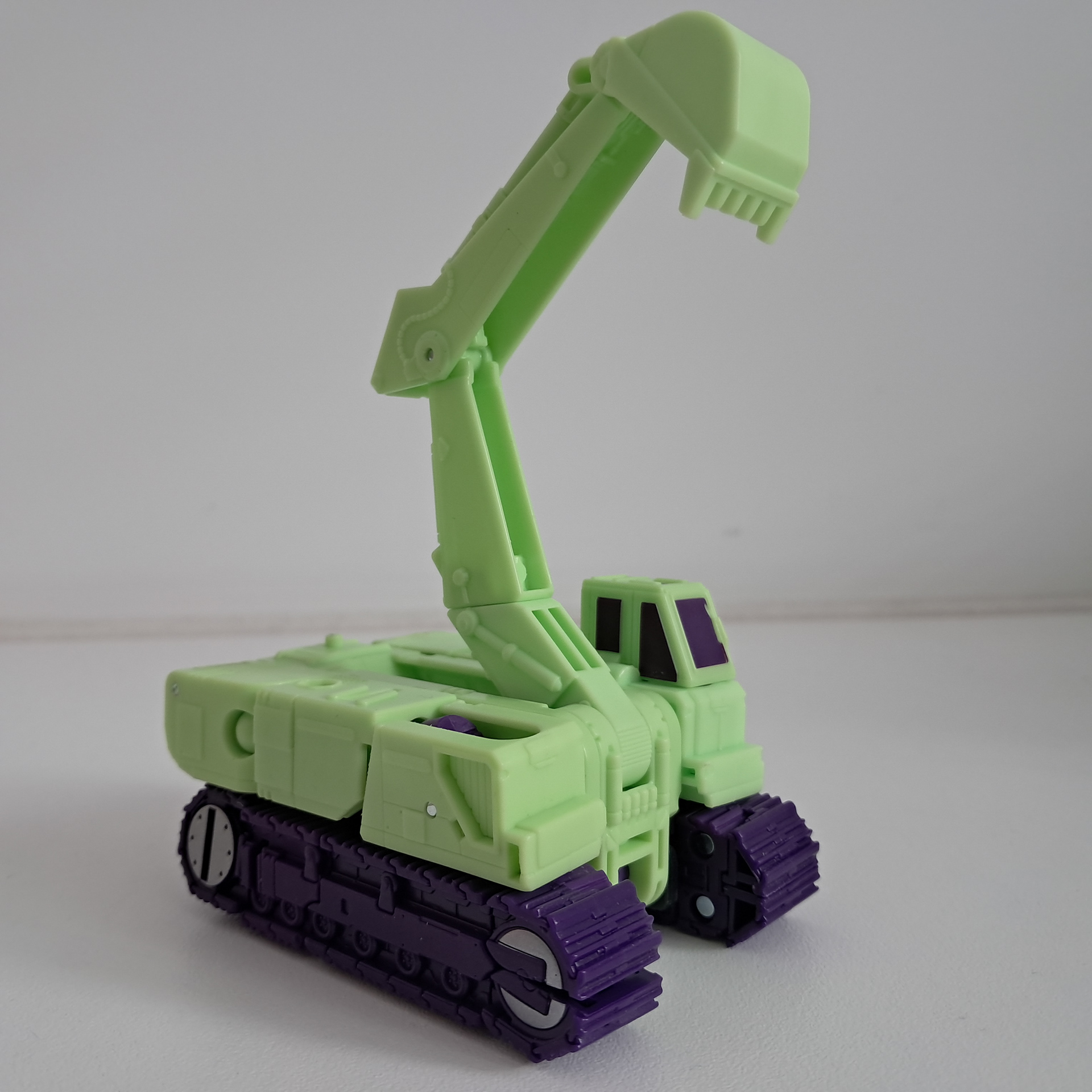 De transformatie bestaat uit wat gemakkelijk flipflapflop, en je eindigt met een aardig graafmachientje. Een graafmachientje die flink bezuinigt op de verf, met hoogstens wat raampjes en wat wielen bij de rupsband met een kleurtje. Maar het zou fijn zijn als er wat motordetails of zuigstangen zilver geverfd zouden zijn.