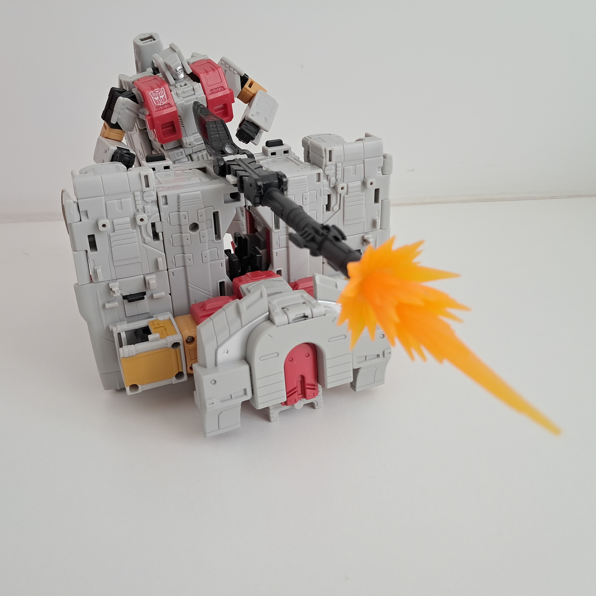 Je kan ook die hele klont er vanaf halen om er een muurtje voor Silverbolt van te maken. Dat is het. Een muurtje om zijn geweer vast te houden. Het voelt een beetje wanhopig allemaal om nog een soort van speelpatroon uit de klont te halen. Motormaster maakte in ieder geval nog iets van een basis uit al zijn onderdelen, met torentjes en zo.