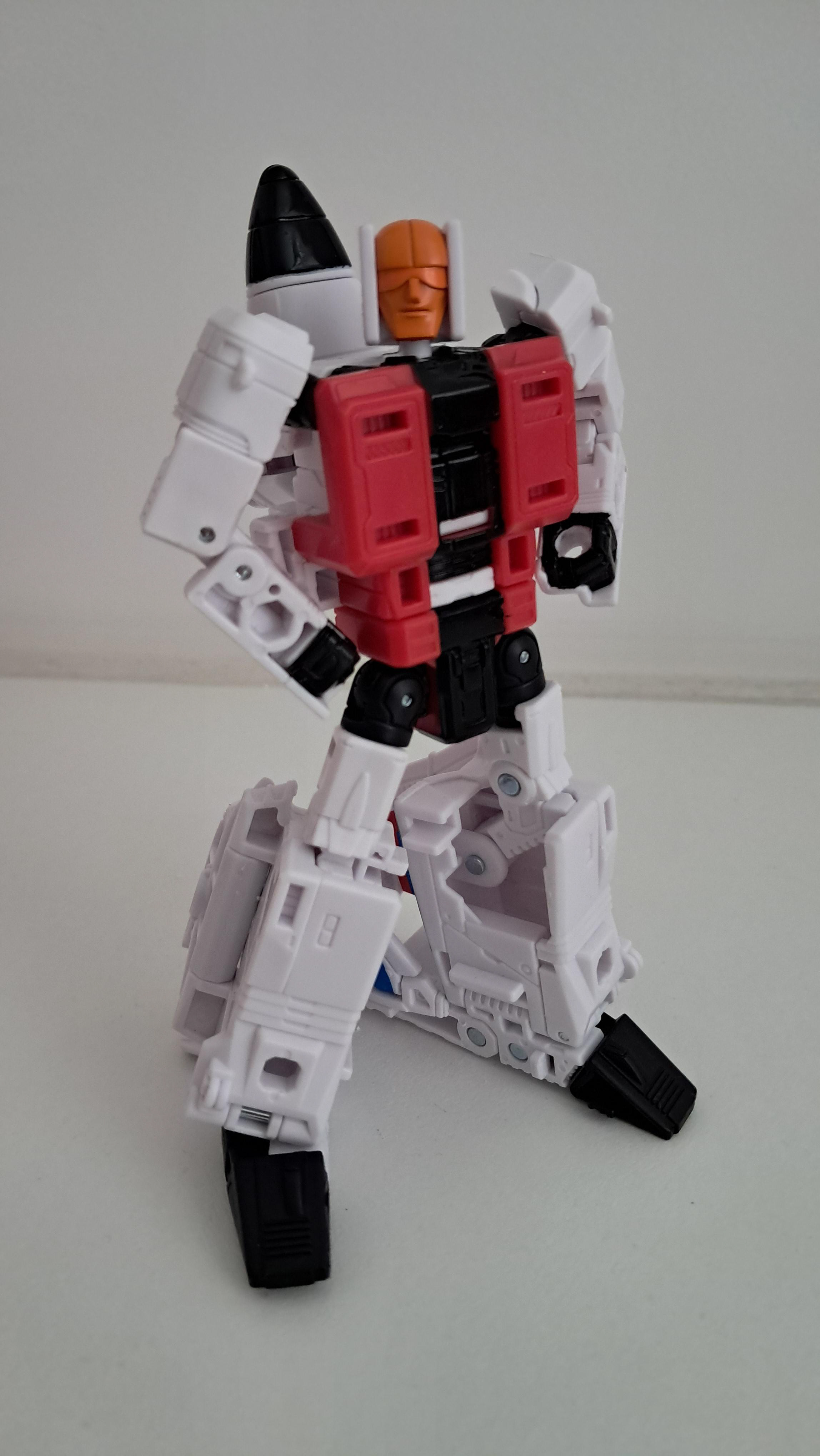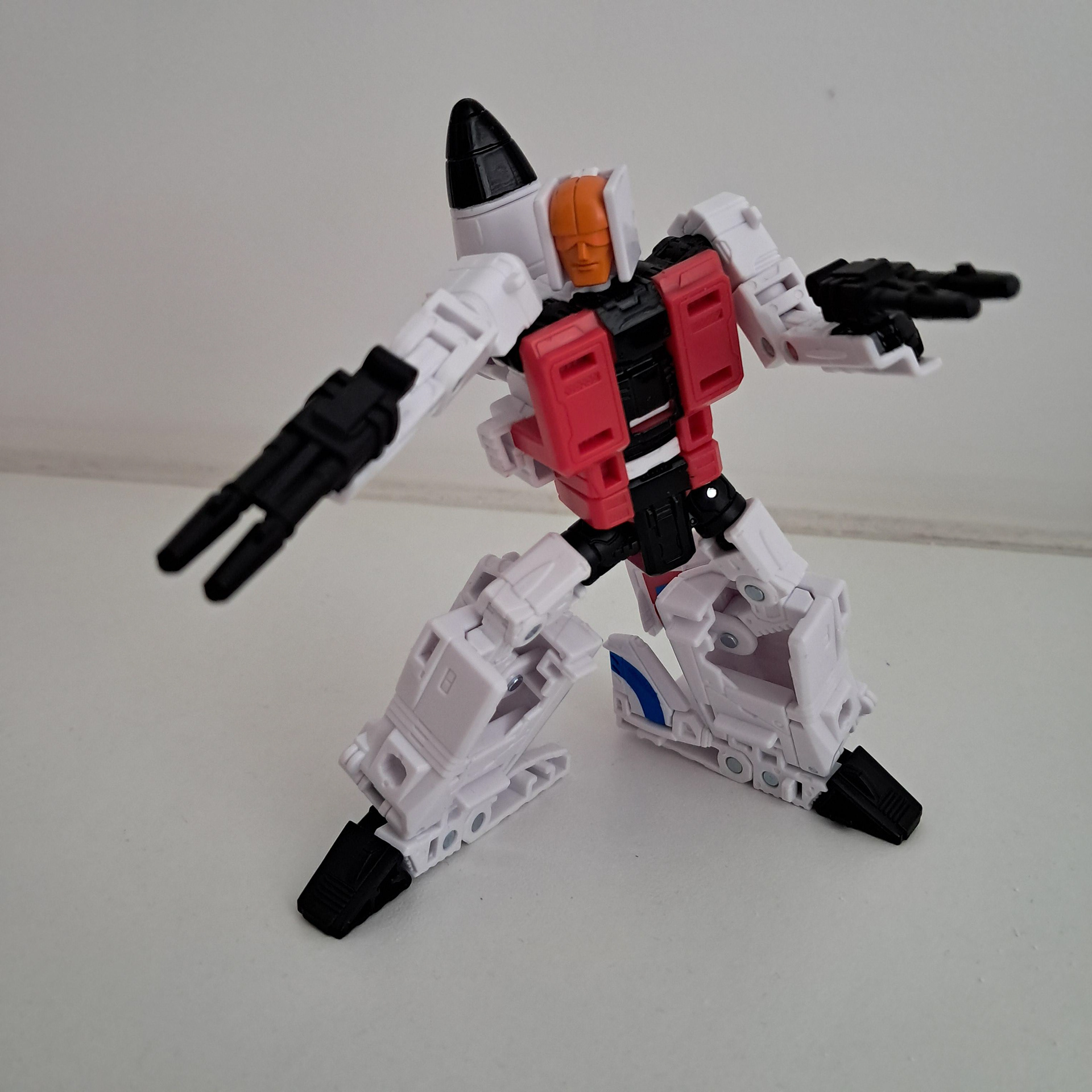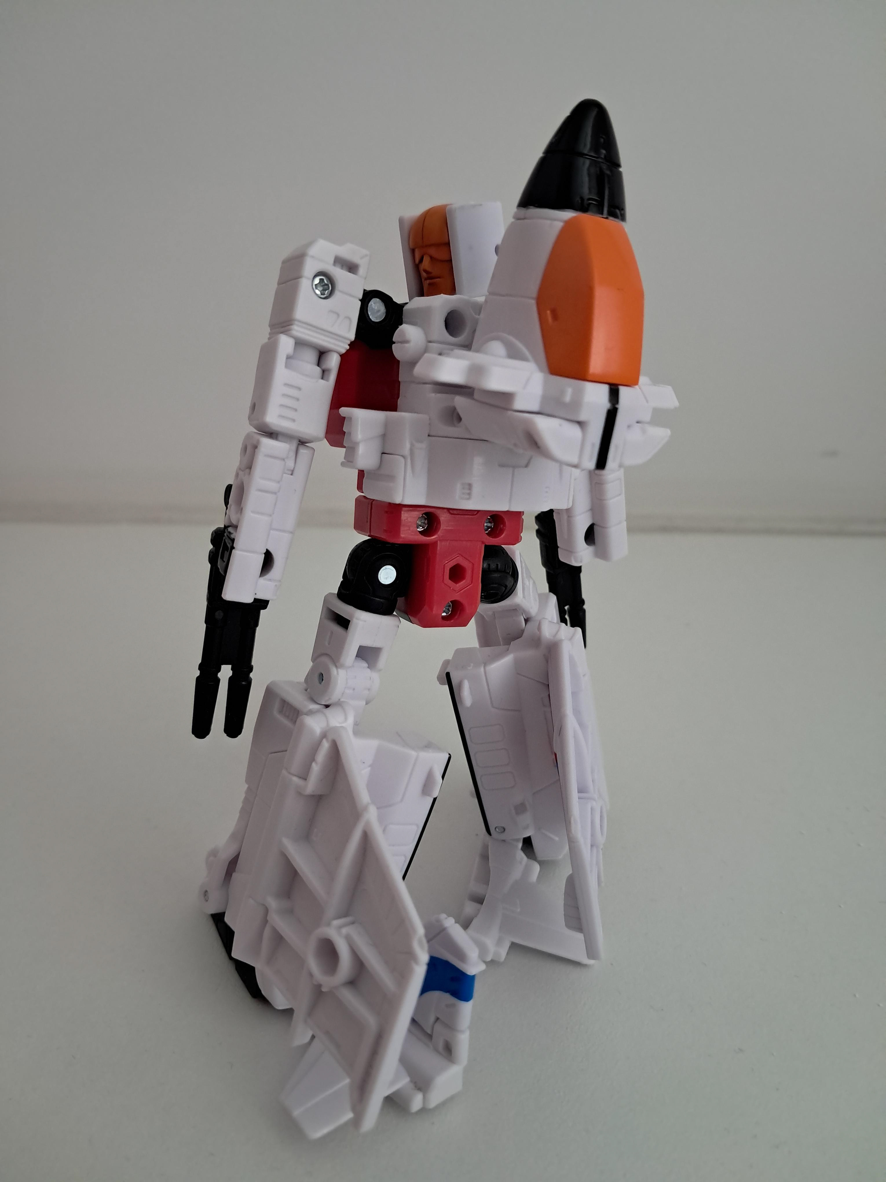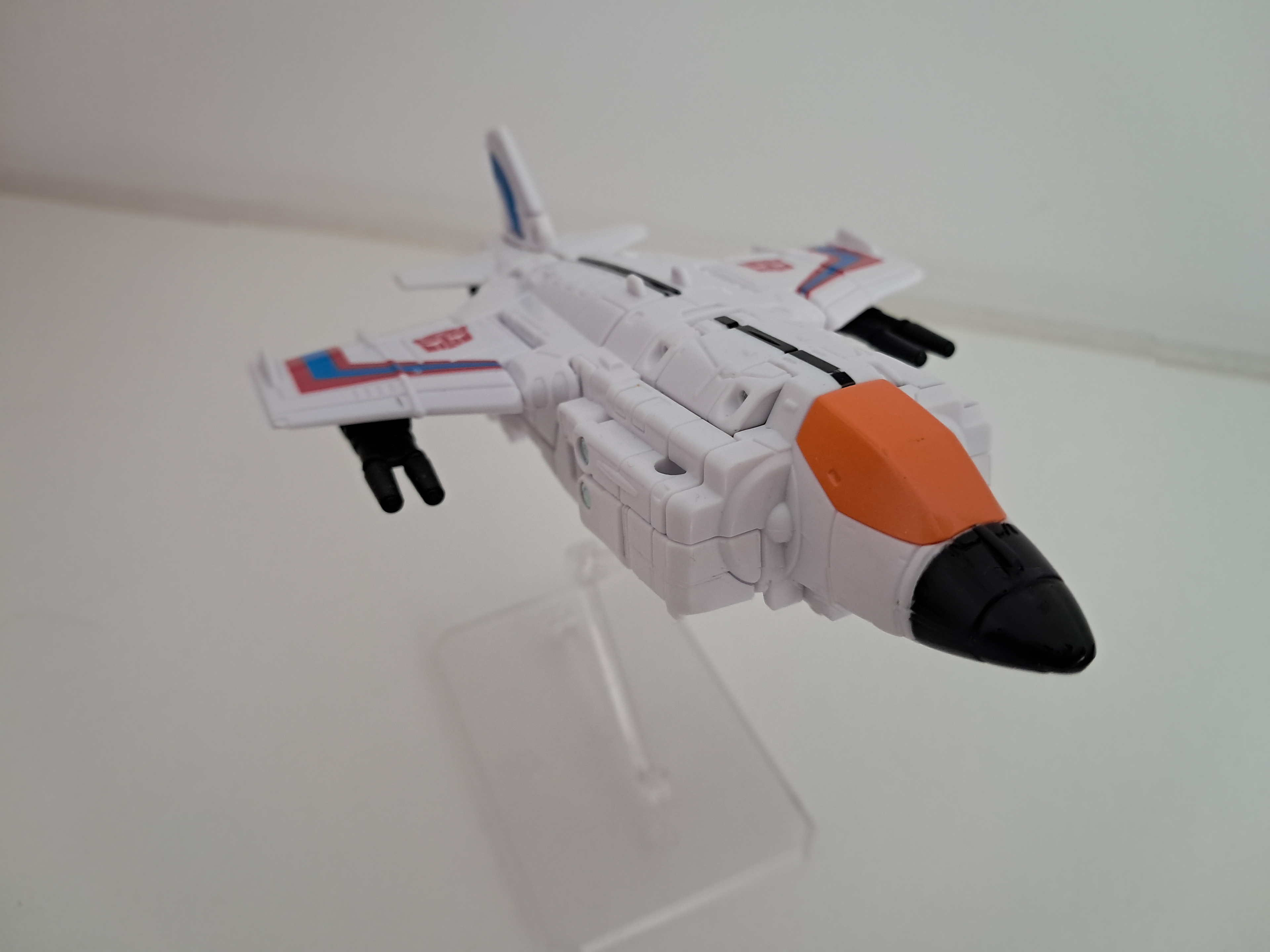 Daarnaast is hij ook geen vliegtuig met een robot er onder gepropt, maar zit alles heel goed en toch simpel verwerkt in de alt-mode. Nu wordt pas goed duidelijk wat hij doet met zijn onooglijke armpjes. En er komen meer details tevoorschijn zoals de zwarte streep op de rug die heel veel voor hem doet.