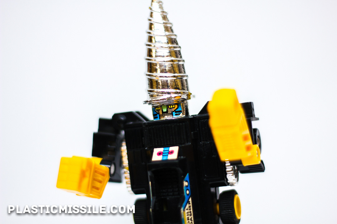Echter, Drillhorn doet zo zijn best een goeie drilltank te zijn, dat hij helemaal vergeet dat hij ook nog een goeie robot moet zijn. Zijn armen zijn vooral rupsbanden waar een vuistje onderaan bungelt. Zijn boor hangt maar een beetje op zijn rug te bungelen als een te grote capuchon. En het hele borst gedeelte van deze Breast Master bungelt zo laag alsof hij een vrouw na de menopauze is. Je kan ook te ver gaan om een goeie drilltank te zijn, maar we waarderen de poging.