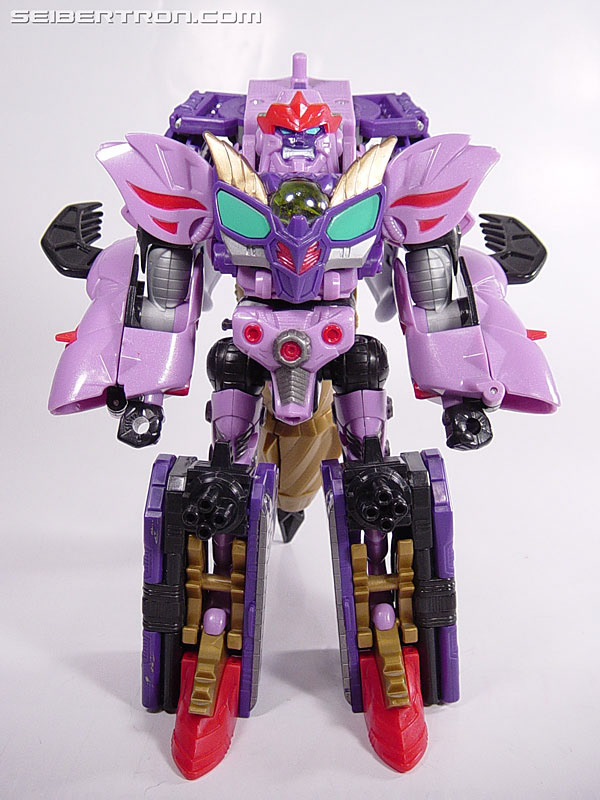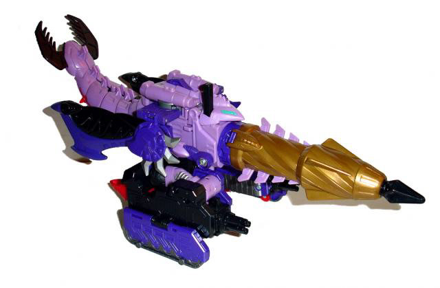 Ach Beast Wars Galvatron, wat ben je toch een leuk mannetje. Allereerst doet hij heel goed zijn best om te bewijzen dat lila een hele evil kleur is voor grote slechteriken die serieus moeten worden genomen. En anders doen die machinegeweren op zijn knieën dat wel. Of zijn grijns die bewijst dat Galvatron vaak genoeg naar de tandarts gaat. Maar waar wij voor komen is wat je tussen zijn beentjes kan zien. Galvatron is helemaal niet blij om ons te zien, maar we komen er wel voor.