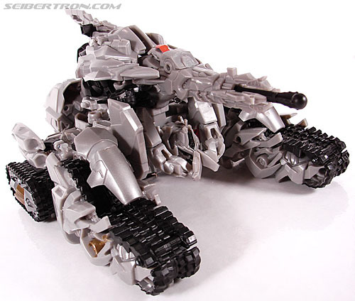 Juist, gewoon bovenop de alt-mode. Voor de vorm gaven ze hem nog een mondkapje, zodat Megatron tijdens het vliegen niet teveel insekten in zijn mond zou krijgen, maar het is op z'n zachts gezegd niet zo aerodynamisch. Nou ja, in Revenge of the Fallen was Megatron weer terug om het opnieuw te proberen. Nu als een soortement dinges tank die tussendoor even naar Jupiter vliegt. Dus waar laten ze zijn hoofd nu?