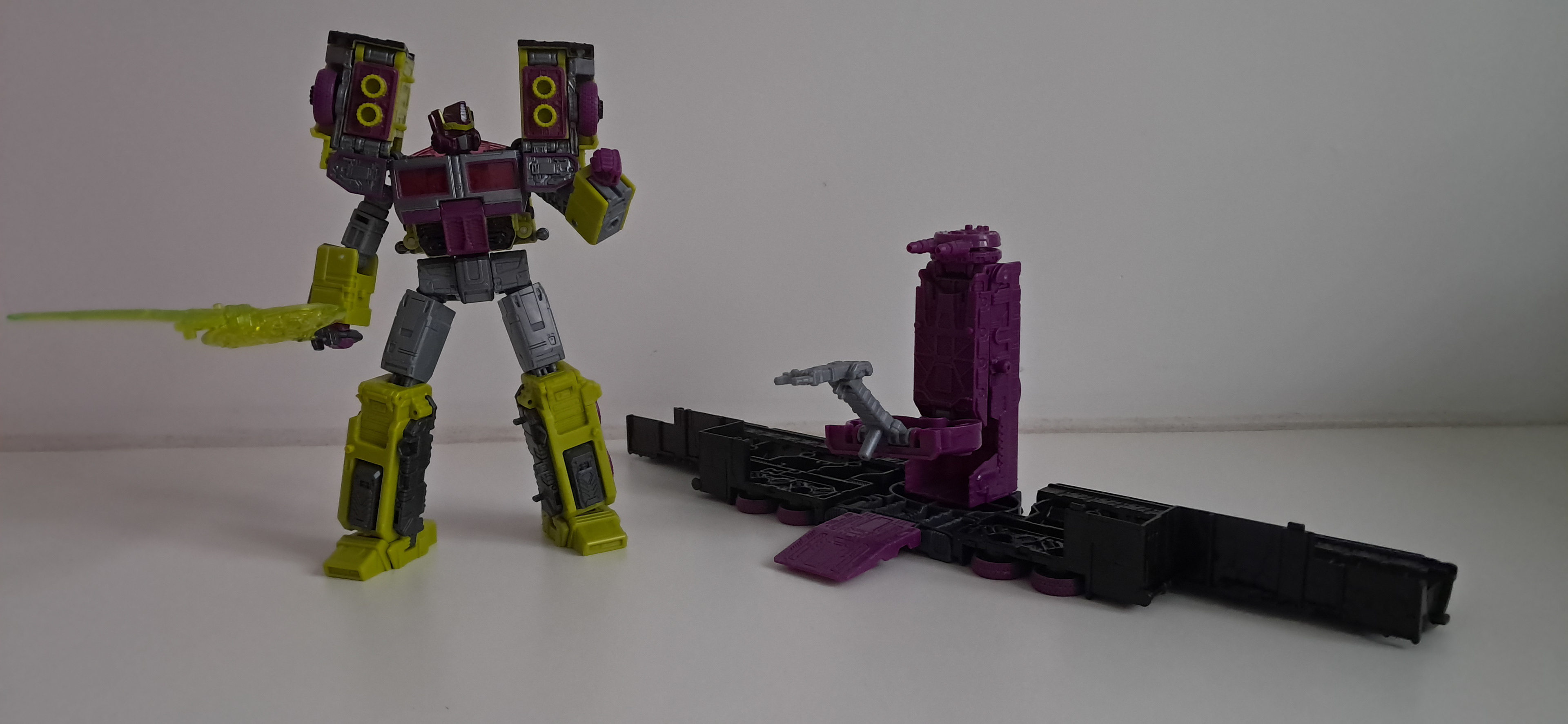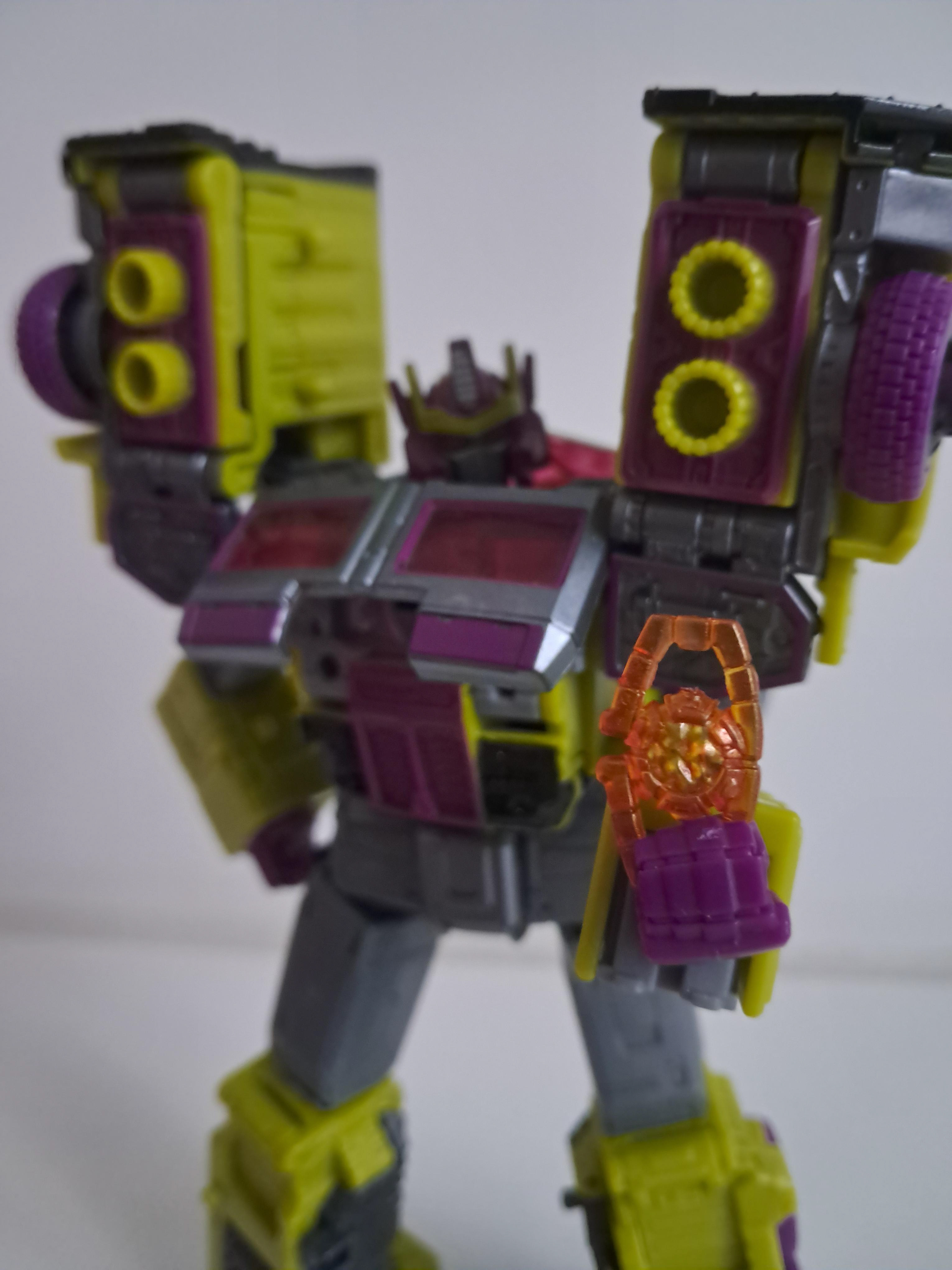 En ik moet zeggen, deze kleurtjes werken wel voor hem. Minder staal, meer details zichtbaar en al het groen en paars staat hem goed zonder gelijk van hem een Constructicon te maken. Het oogt bij elkaar lekker smerig, al had ik graag gehad dat er wat viezigheid was toegevoegd, van die Siege roest en schade ofzo.