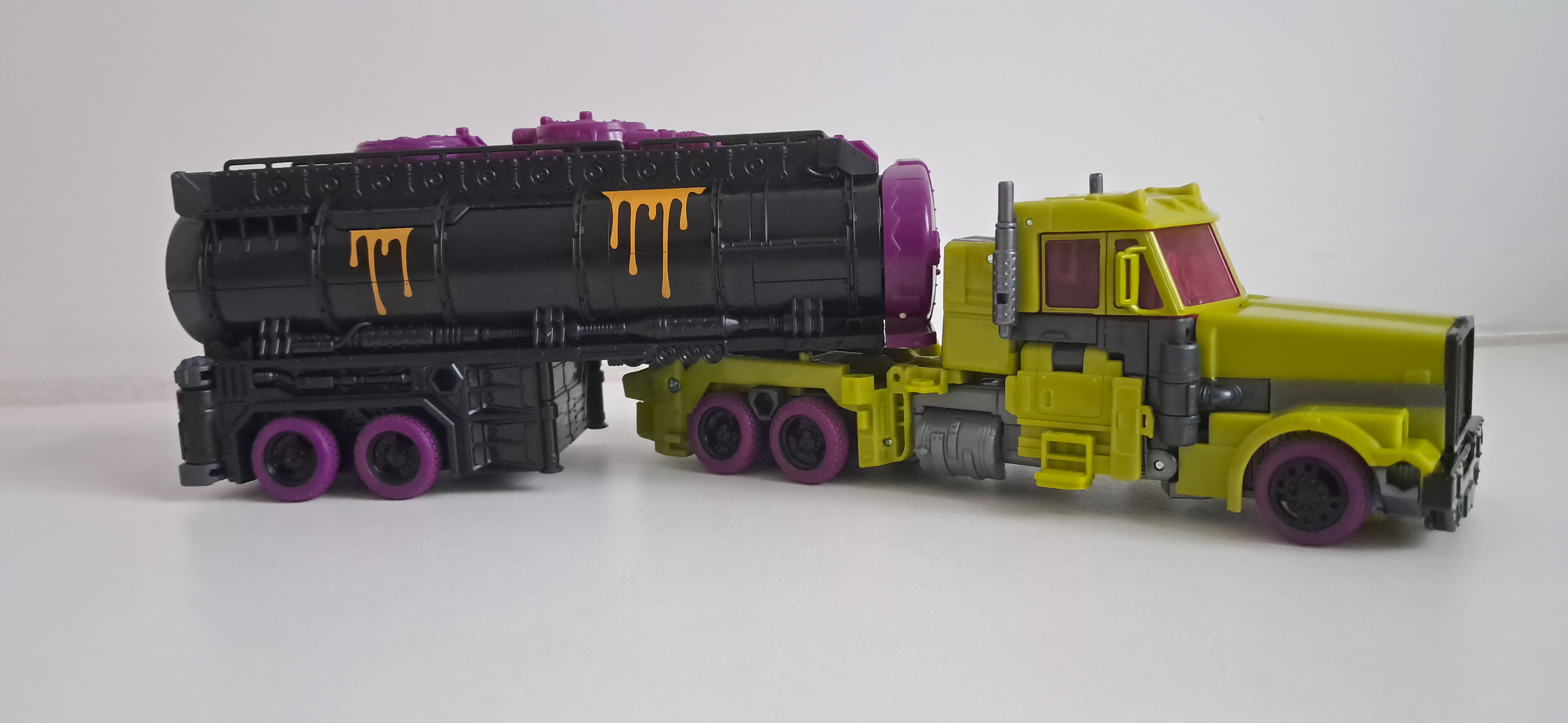 In truck-mode moet ik eigenlijk erg denken aan DOTM Megatron. Veel meer dan Laser Prime. Ik waardeer hier de oranje spletters op de tankwagen, al kom ik op internet ook nog mooie stickersets tegen. Sommige zelfs voor de binnenkant van de tank.