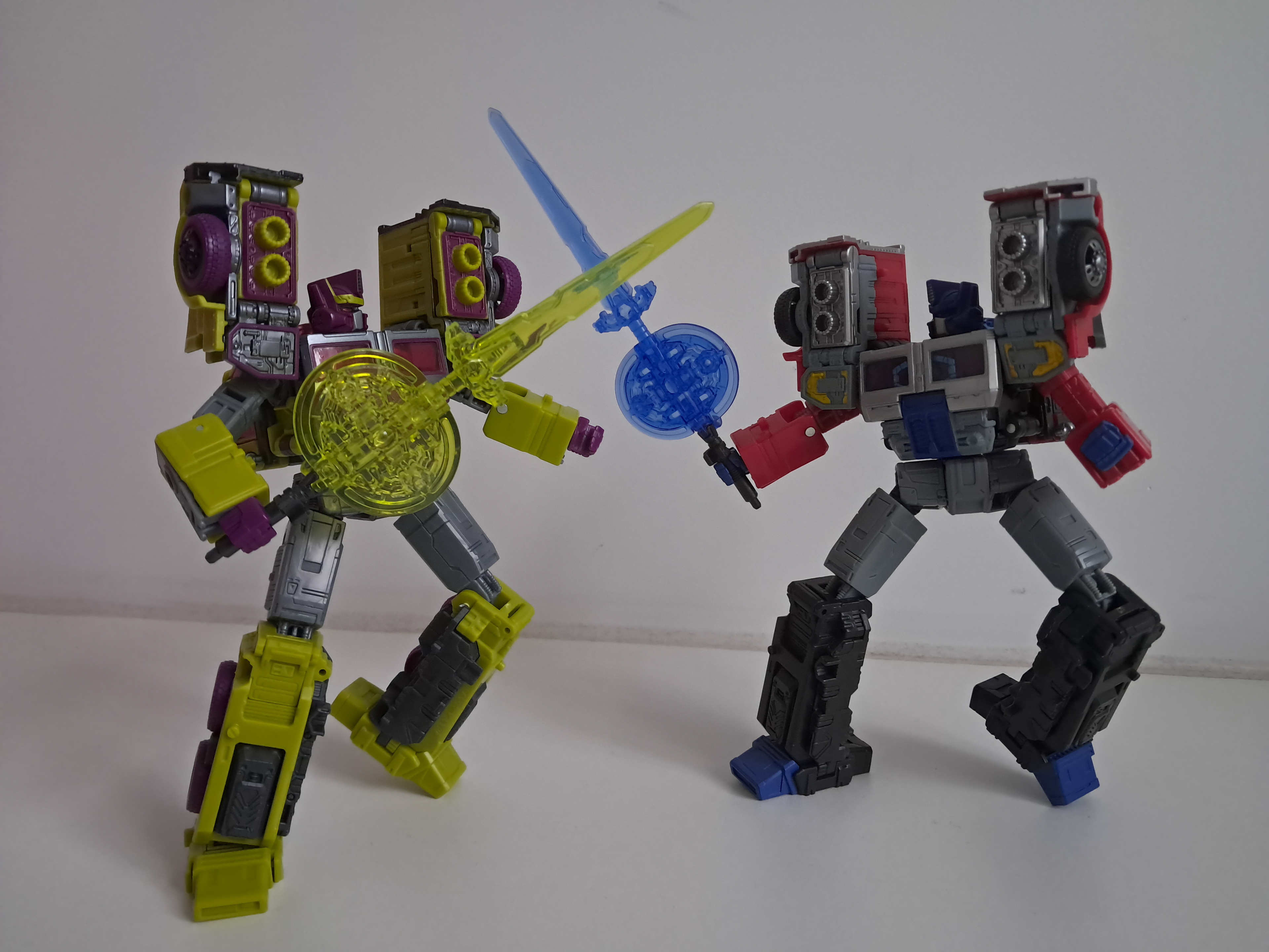 Naast Legacy Laser Prime oogt hij meer als een geheel, meer een silhouette. Laser Prime zijn broek zoekt gewoon ruzie met de rest, en de splasjes blauw werken gewoon niet. Wel vind ik het erg jammer dat Toxitron en Prime hetzelfde hoofd hebben. Ik weet dat deze toy een toy moet nadoen van 30 jaar terug, maar ik had graag een hoofd gezien dat bezig was een oranje prut uit te kotsen.