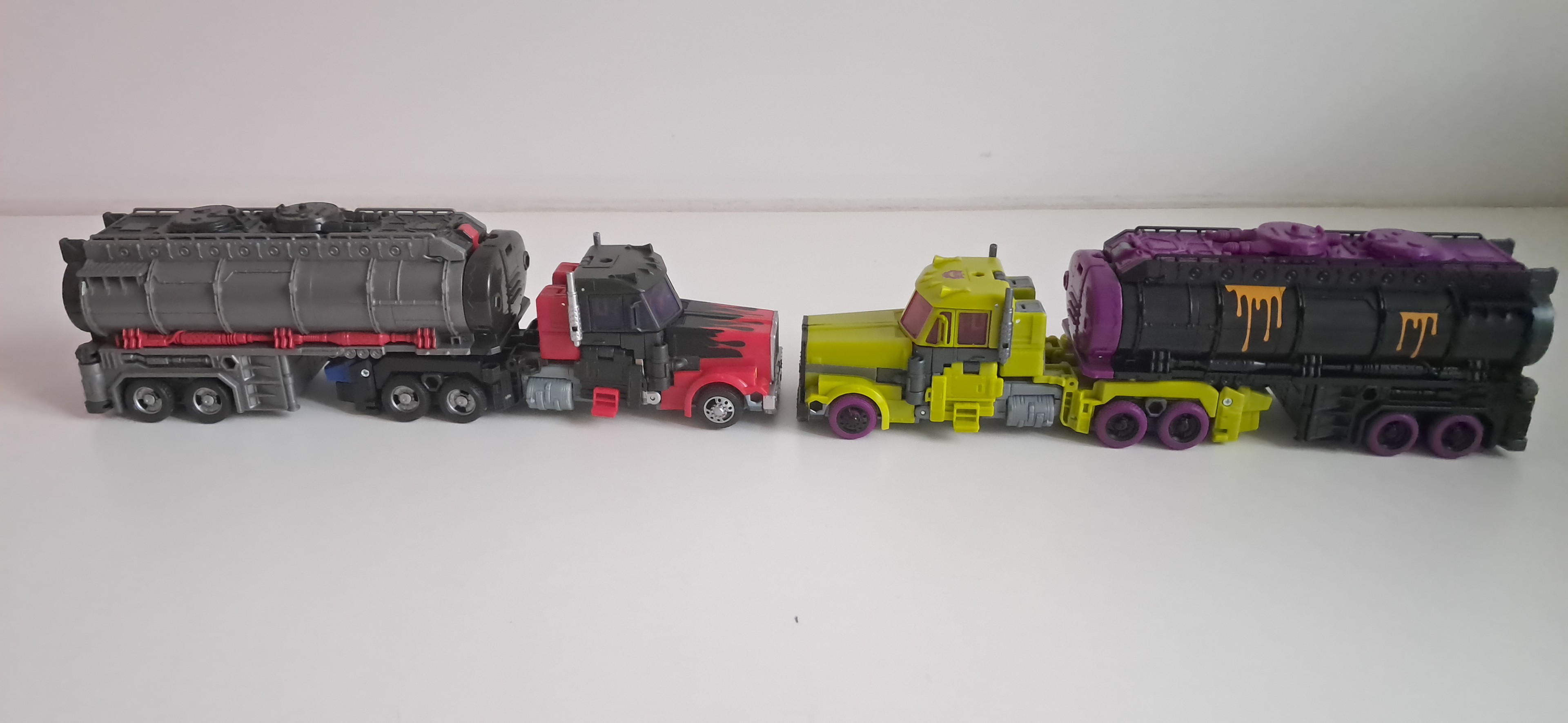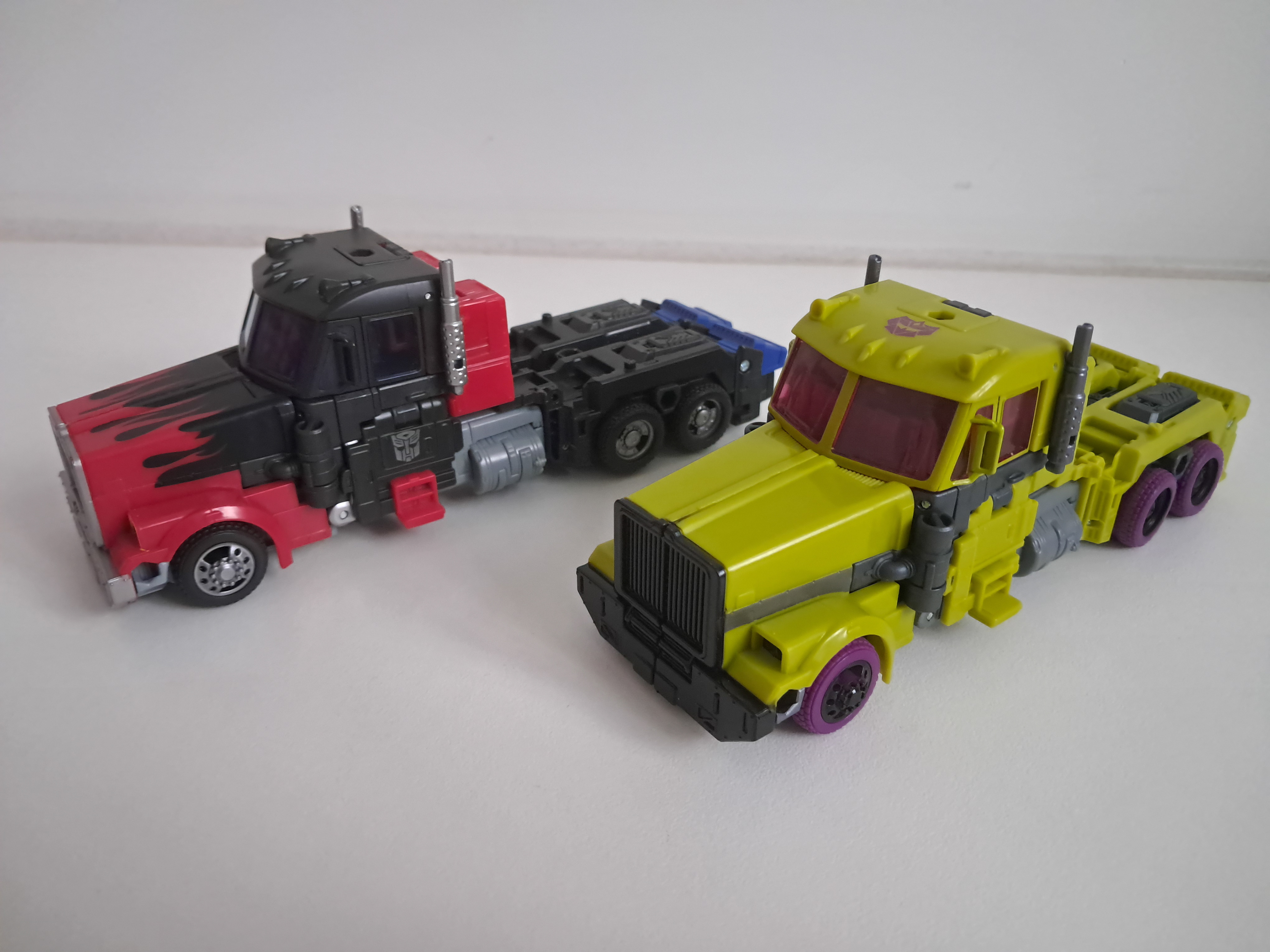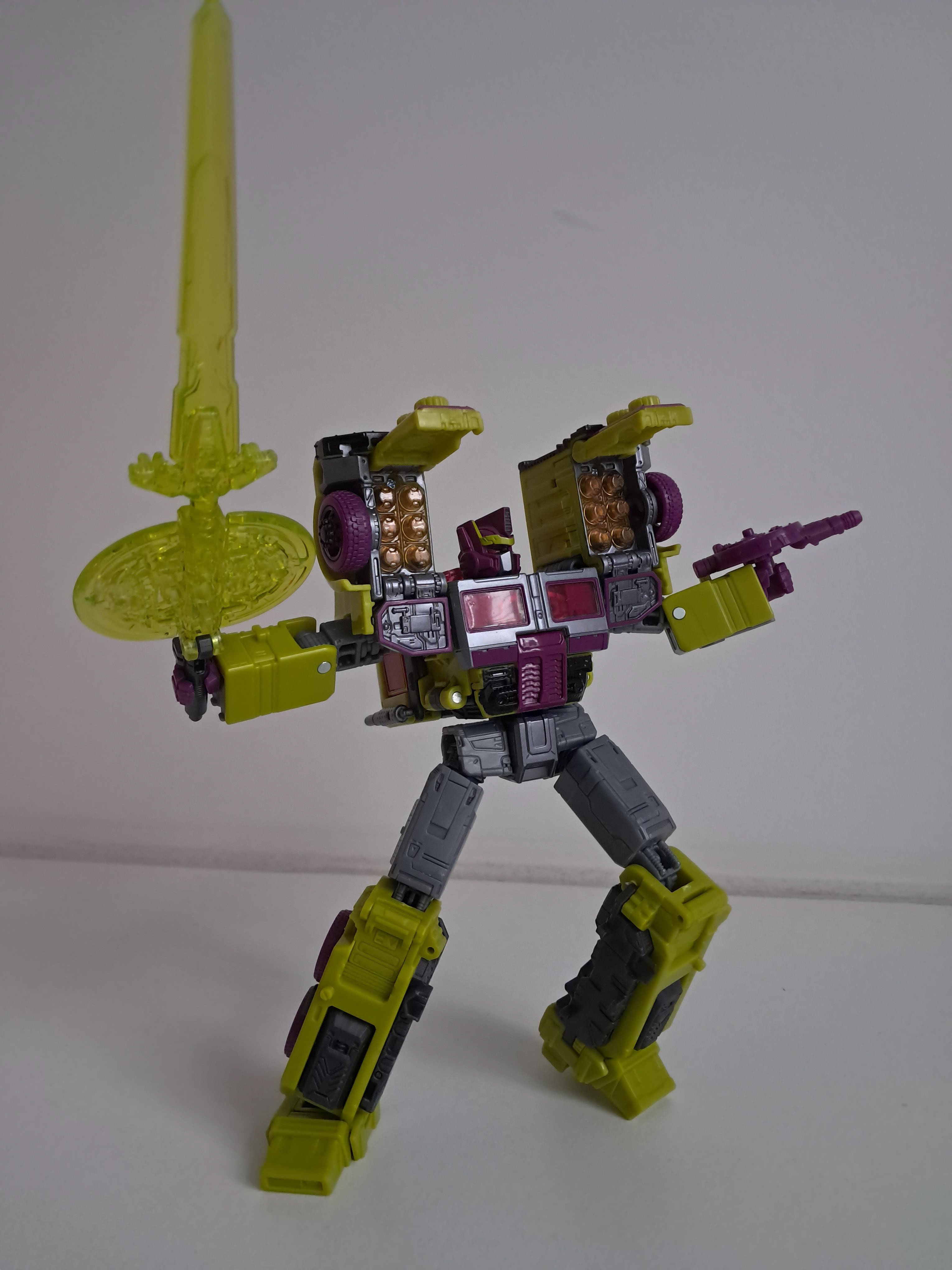 Zo naast Laser Optimus oogt hij ook mooier naar mijn mening. Ik vind bij deze mold altijd de cab van de truck teveel uit proportie, en nu gaat het makkelijker in elkaar over omdat alles groen is. Wel ogen de wielen nog steeds veel te klein. Wel props voor het G2 Decepticon logo. Nu heb ik een goed excuus om hem naast mijn G2 Megatron en Jiaxus neer te zetten.