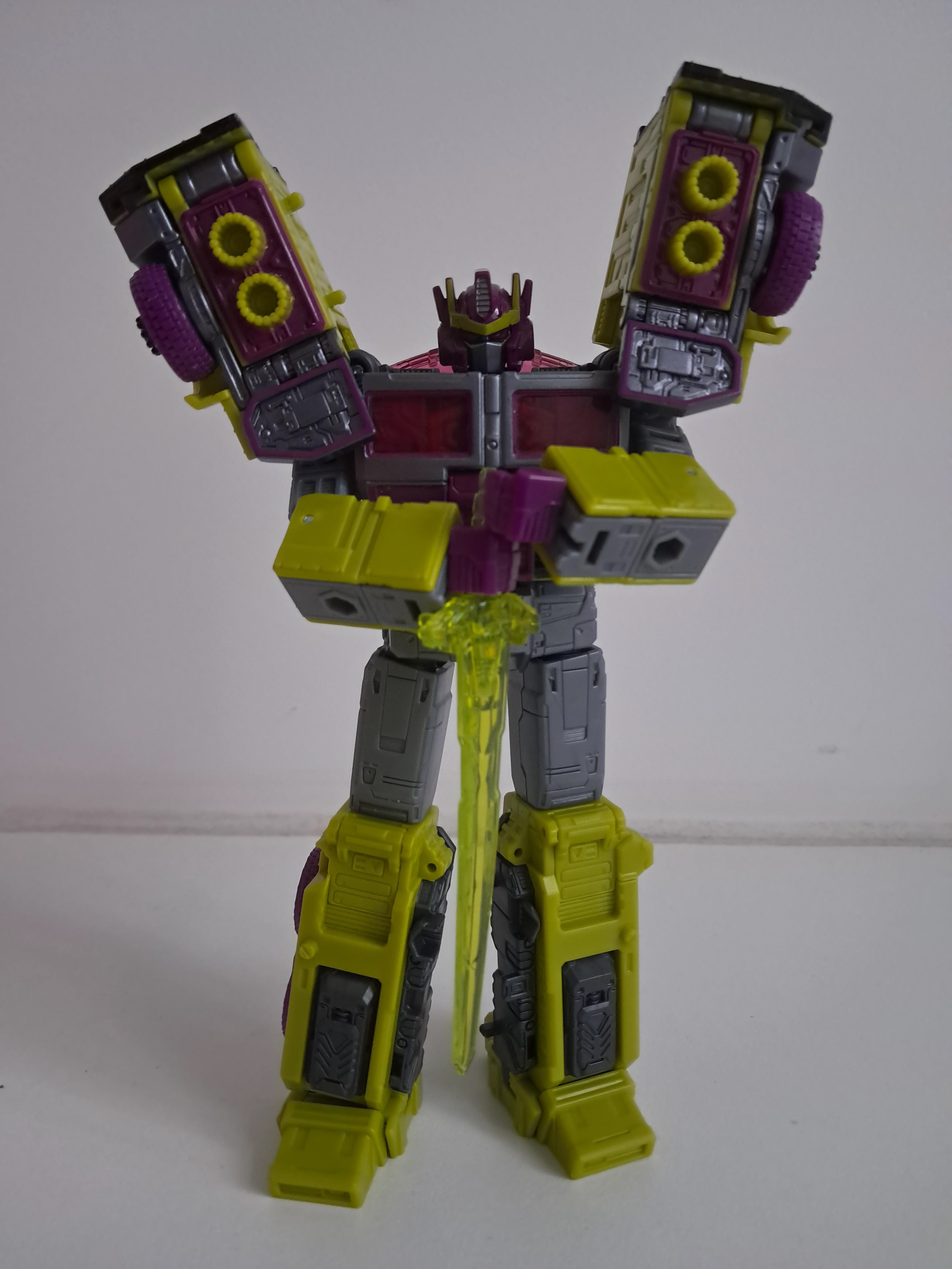 Omdat ik toch op een rol ben hier nog een review. Misschien weten jullie nog dat ik niet echt enthousiast was over de Legacy Leader Laser Optimus, die ik volgens mij een zuinig 6,5-je toen gaf. Wat bezielt mij dan om die opnieuw te kopen als Toxitron? Is deze mold dan beter met andere kleurtjes? Of geef ik gewoon te graag mijn geld uit?