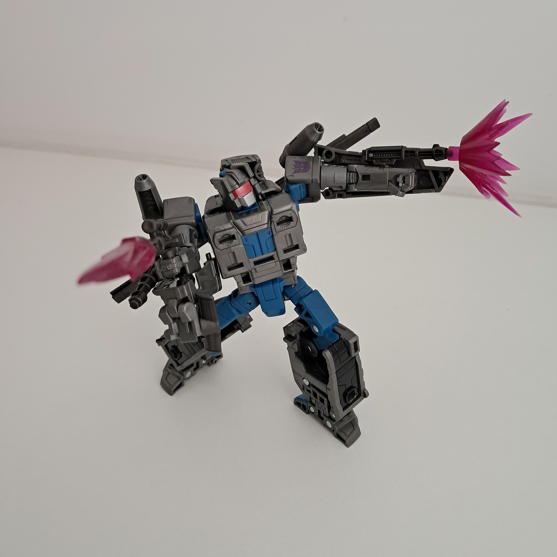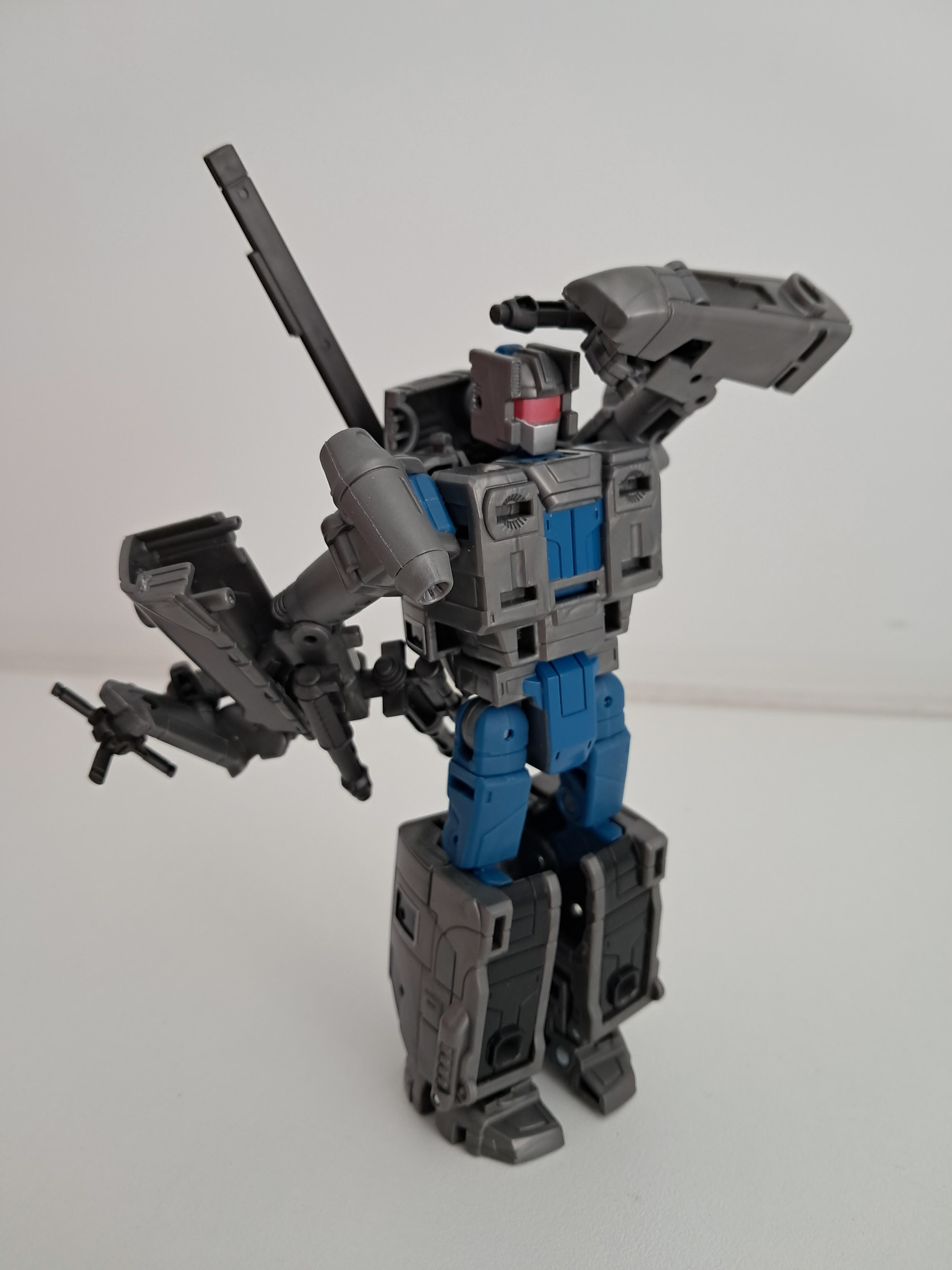 De armkibble zit dat wel flink in de weg, en hij heeft hele gekke handjes, alsof hij een ongeluk heeft gehad bij zijn werk in de houtzagerij. Gelukkig komt hij naast zijn gun ook nog even met twee extra guns om in zijn armen te pluggen. Ze leiden de aandacht af van de helicopter stukken en onderstrepen flink de hele Combaticon vibe.