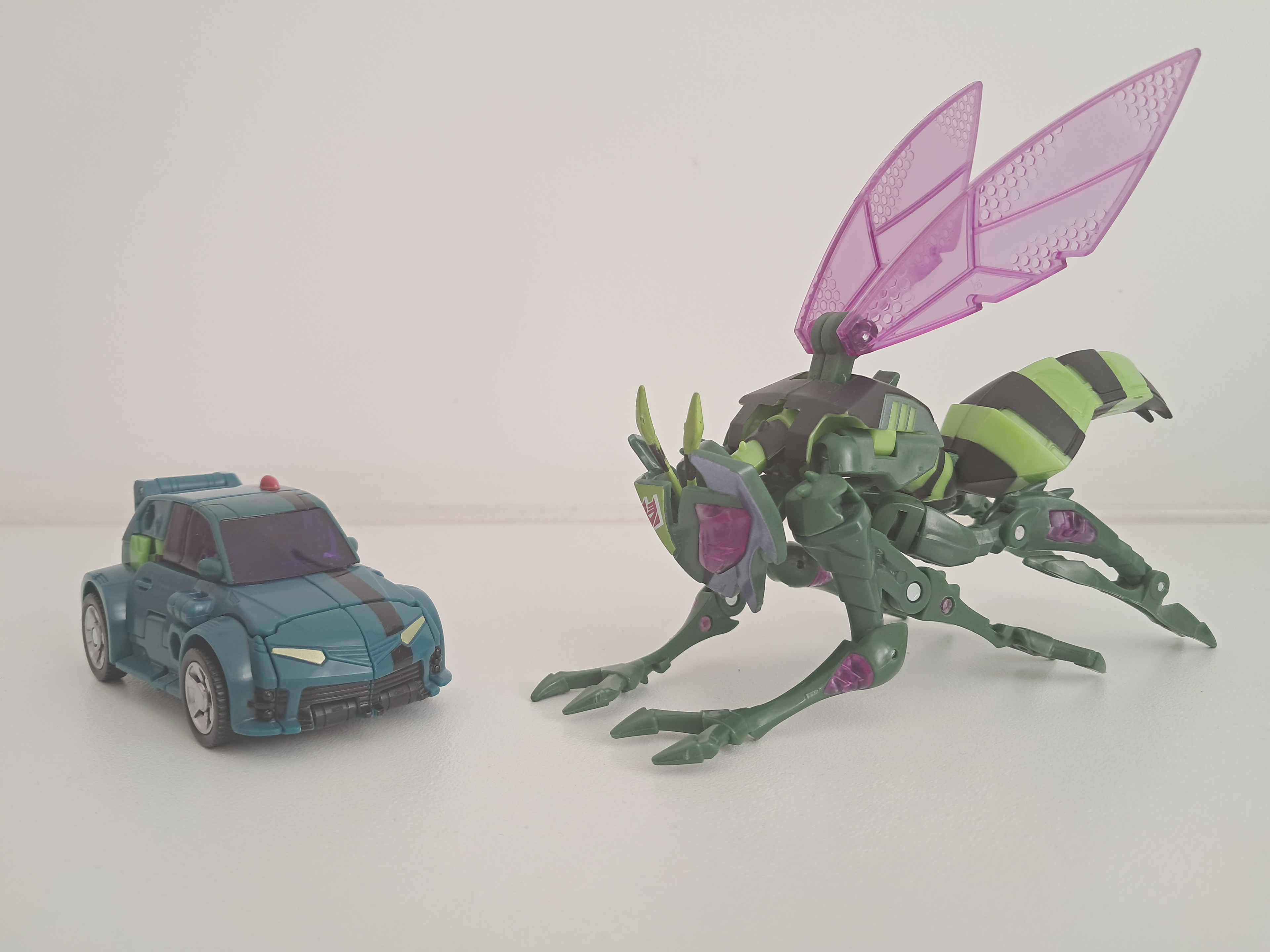 Wasp dus, een figuur waar we al zo een jaartje of 18 op wachten. Hij zou namelijk een simpele repaint worden van Animated Deluxe Bumblebee maar om 1 of andere reden vond Hasbro dat te veel werk. We moesten dus even wachten dus toen hij eindelijk kwam wilde ik hem gelijk hebben. Maar is hij een klein geluk of een kleine etterbak?
