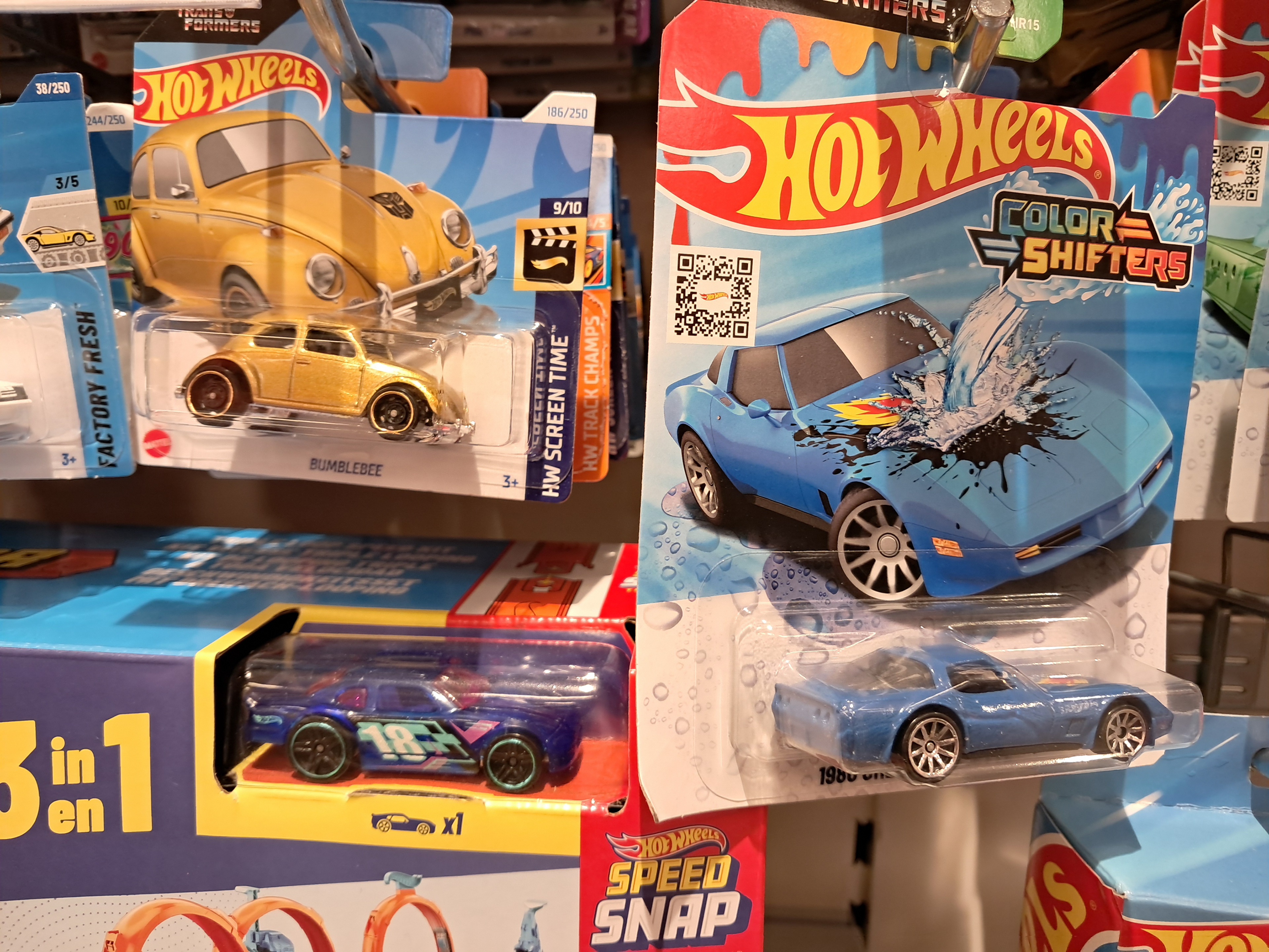 Ik weet het, qua nieuwe Transformers moet je eigenlijk niet bij de Intertoys zijn. Meestal zijn ze nog bezig wat gimmick spul van Rise of the Beasts te verkopen, als ze überhaupt wat hebben. Maar toch konden we de nieuwe Hot Wheels X Transformers autootjes er spotten. In ieder geval Screen Time Goldbug (nou ja, de gouden Bumblebee dus) en de Color Shifter Tracks. Dat betekend dus dat de Bumblebee en Optimus Prime uit de Screen Time collectie ook nog ergens rondhangen, want die behoren tot dezelfde wave.